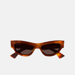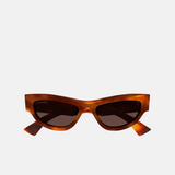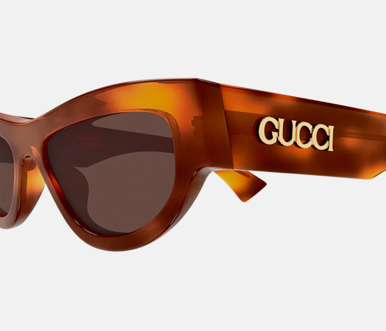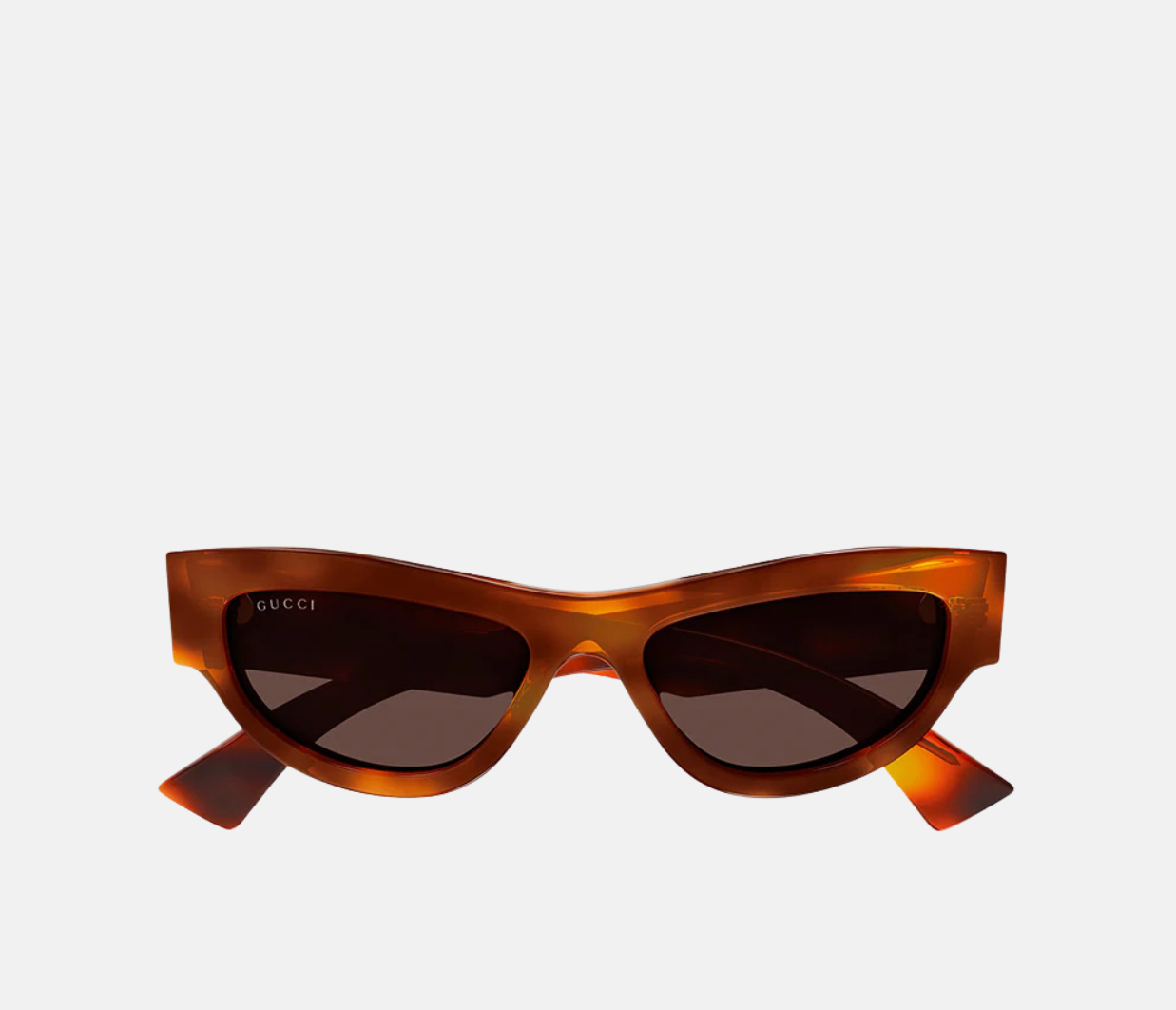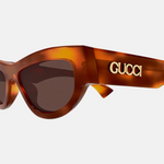 Introducing Gucci's Cat Eye Sunglasses in Havana Brown, crafted from high-quality acetate, these sunglasses feature striking cat-eye frames that add a touch of vintage charm. The solid lenses provide optimal protection from the sun, while the saddle nose bridge ensures a comfortable and secure fit. The right temple is adorned with the iconic Gucci logo script, making a subtle yet sophisticated statement.