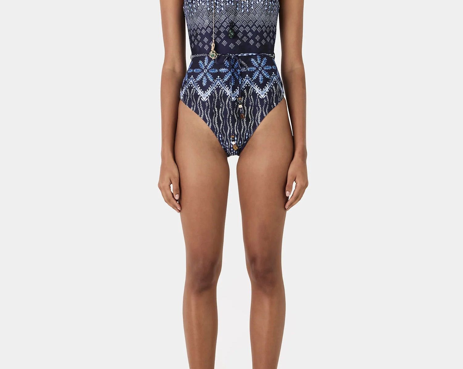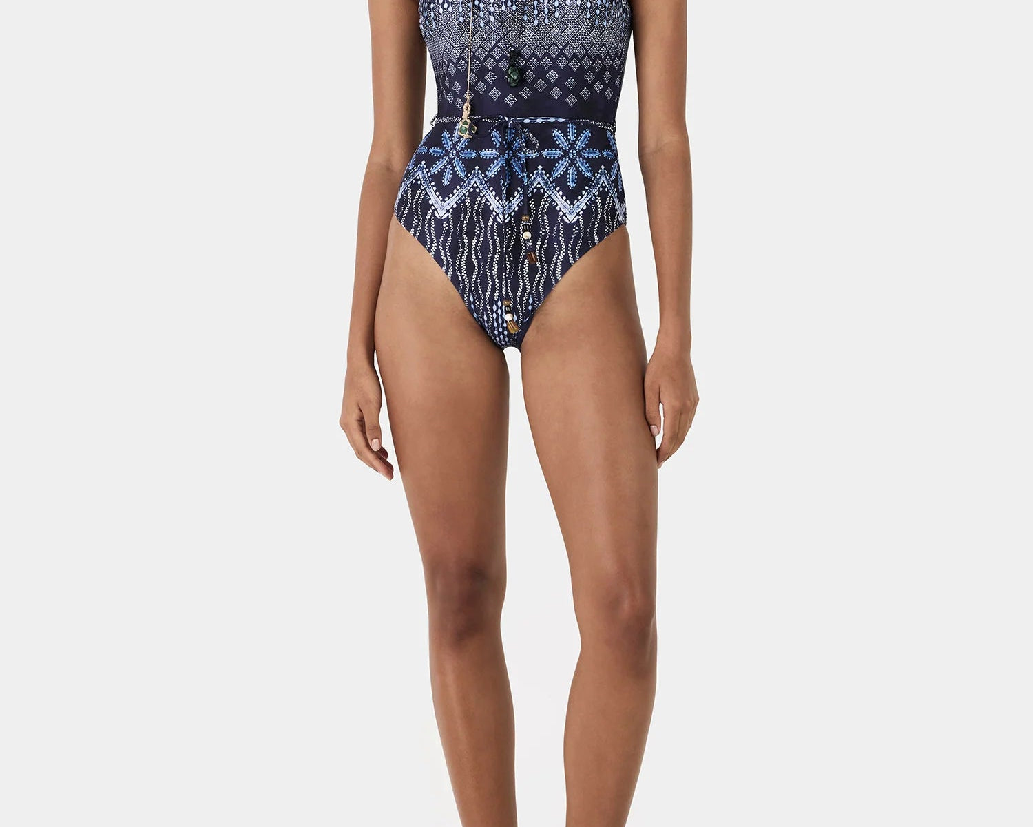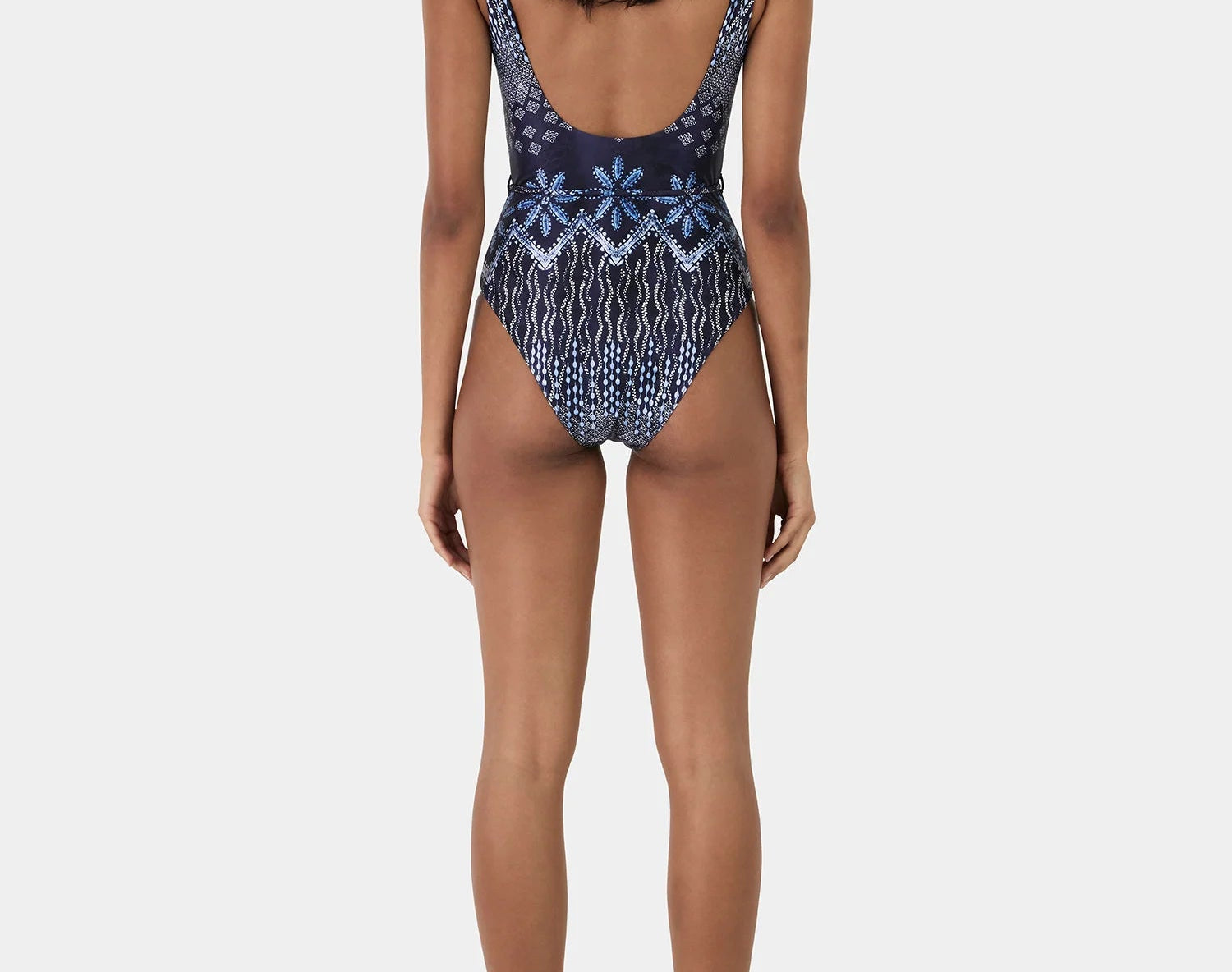 Introducing Hansen and Gretel's Akila One Piece in Indigo Drift, a one-piece swimsuit in a print featuring a navy base with a gradient of intricate geometric motifs that transition from delicate diamonds to bold, symmetrical border patterns in shades of blue. The Akila One Piece features a scoop neckline, low back, and a waist belt with delicate beaded detail, fully lined for comfort and designed to elevate your resort or swim-day look.