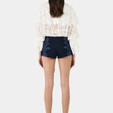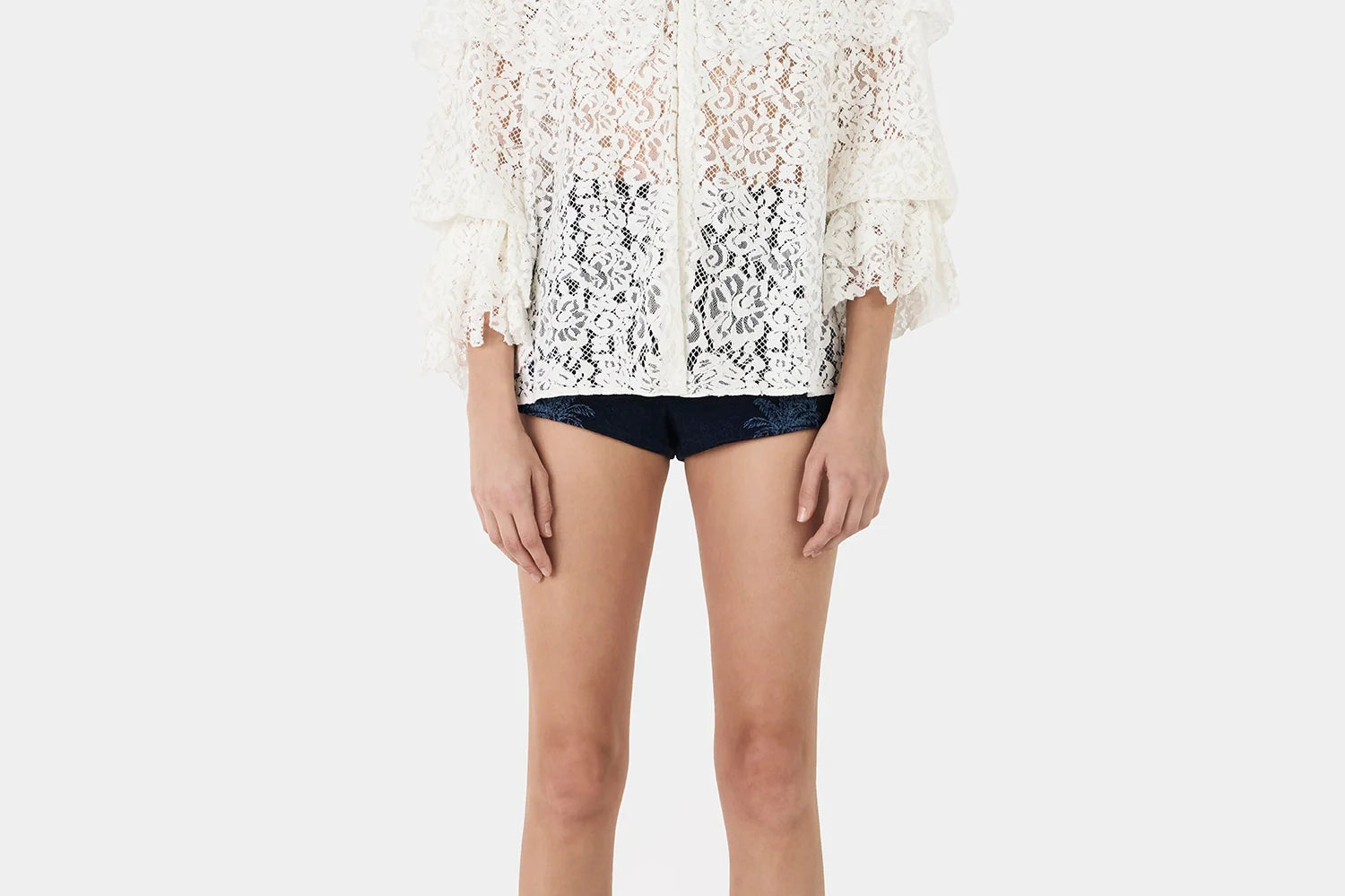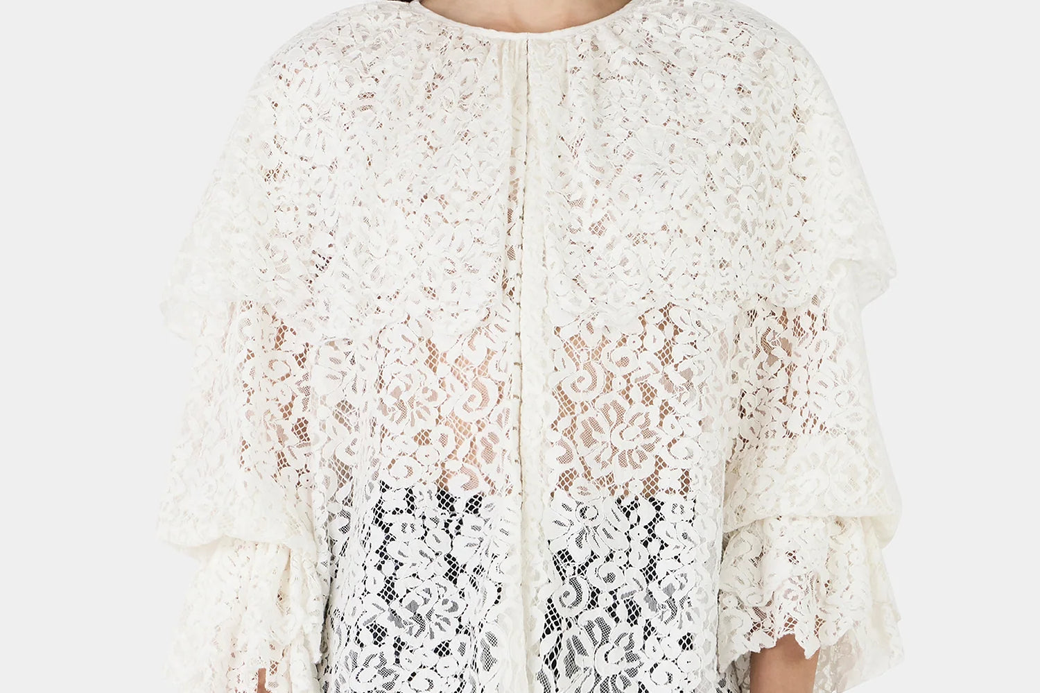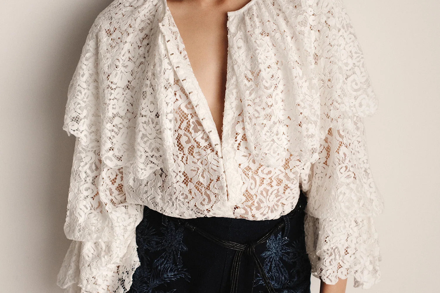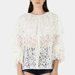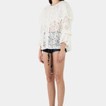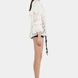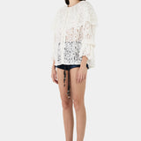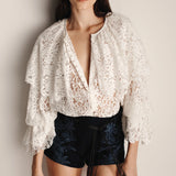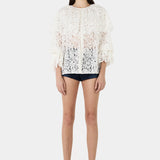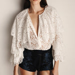 Introducing Hansen & Gretel's Aria Lace Blouse in Ivory Lace, a lace blouse top silhouette in Ivory. The Aria Blouse top features a button-down style top featuring a wide cape overlay with a hand-trimmed hem. Designed with elasticated sleeve cuffs and crafted unlined in a sheer fabric, it offers a lightweight, flowing silhouette perfect for layering or standalone wear.