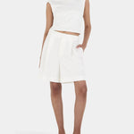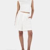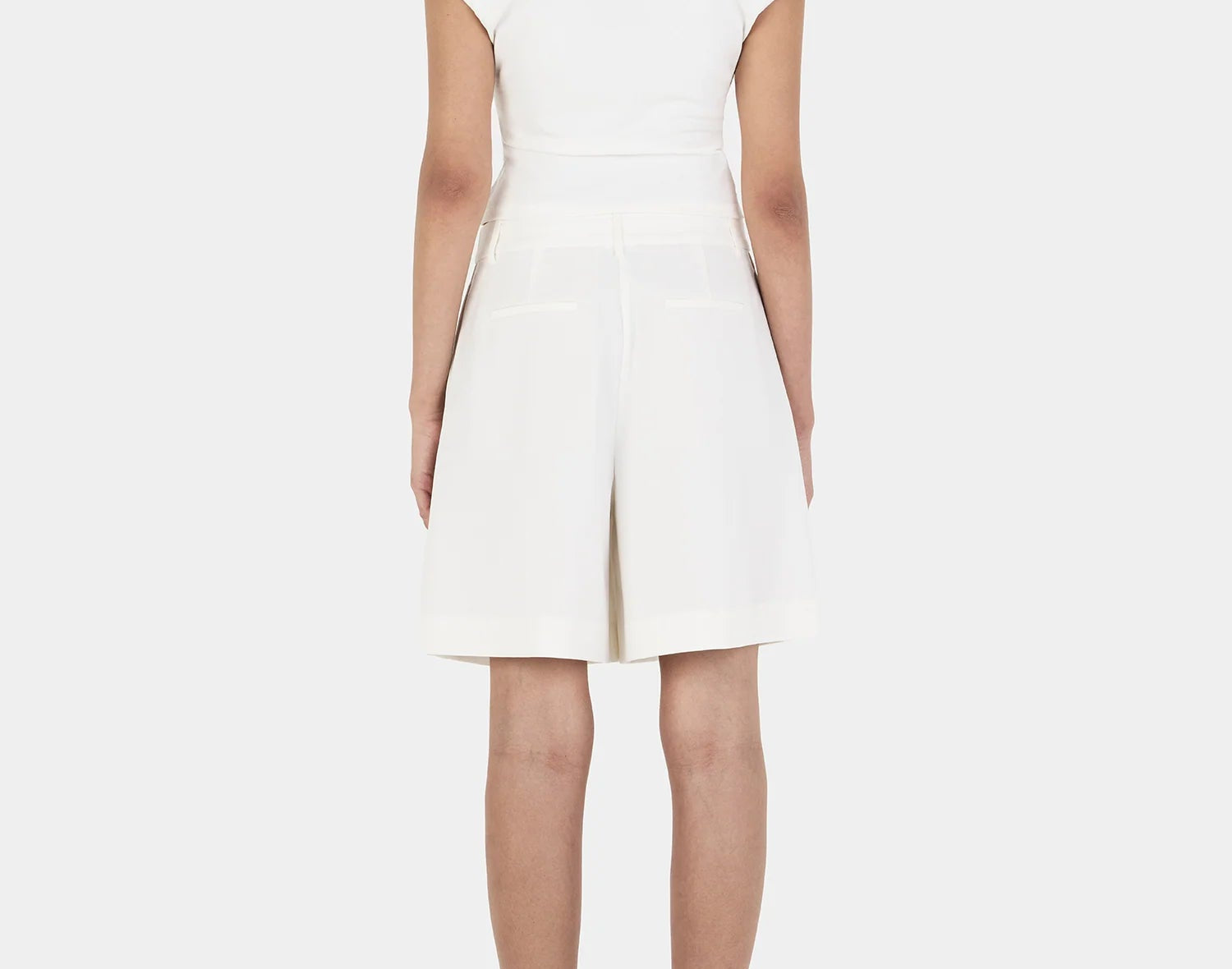 Introducing Hansen & Gretel Beau Bermuda Short Ivory, a relaxed mid-rise bermuda short silhouette in an ivory hue, designed with a tailored wide leg and soft pleats and finished with front side pockets and sleek back welt pockets. Perfect for the office and an elevated look for the summer days.