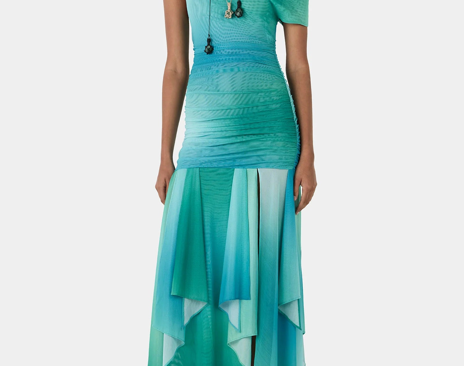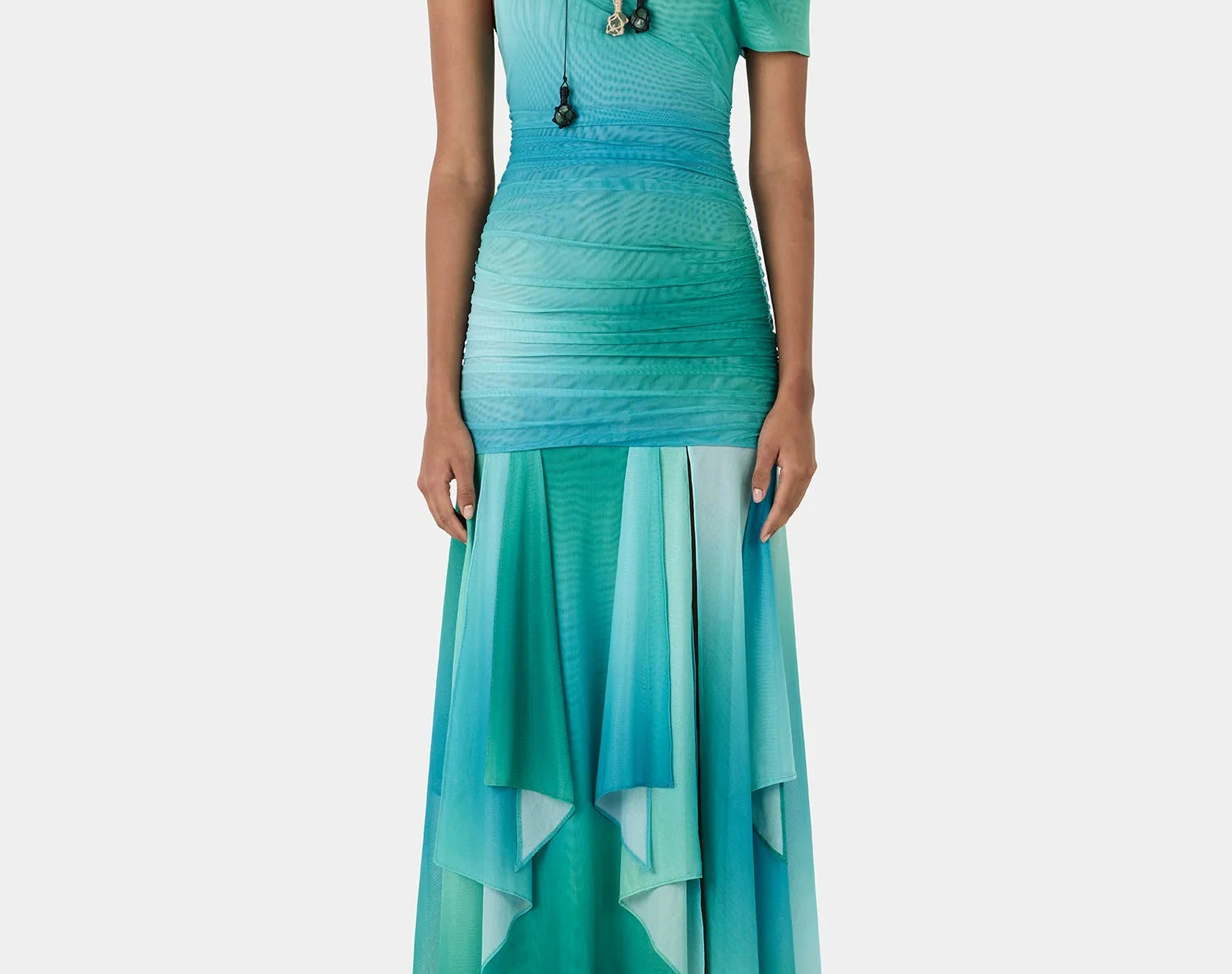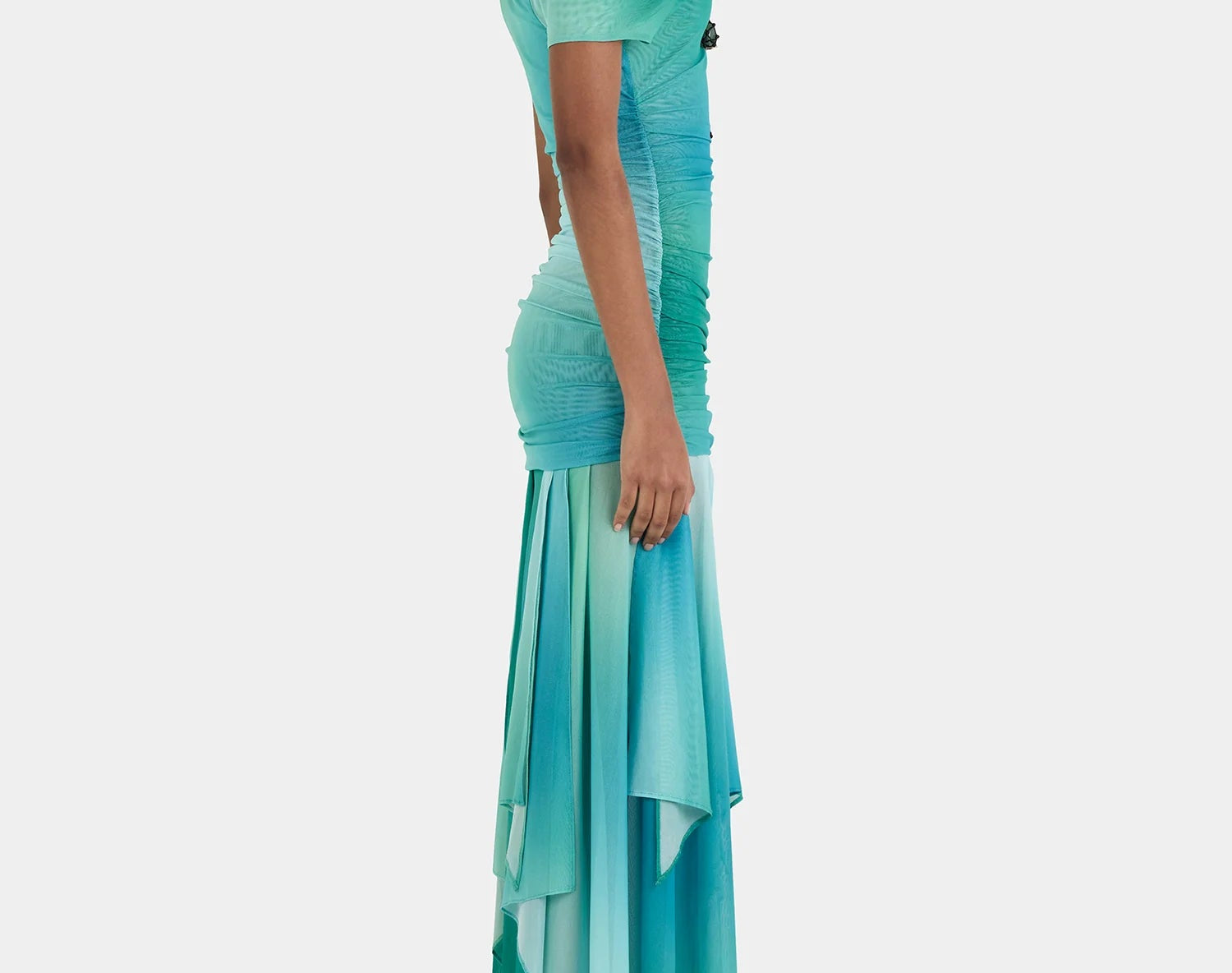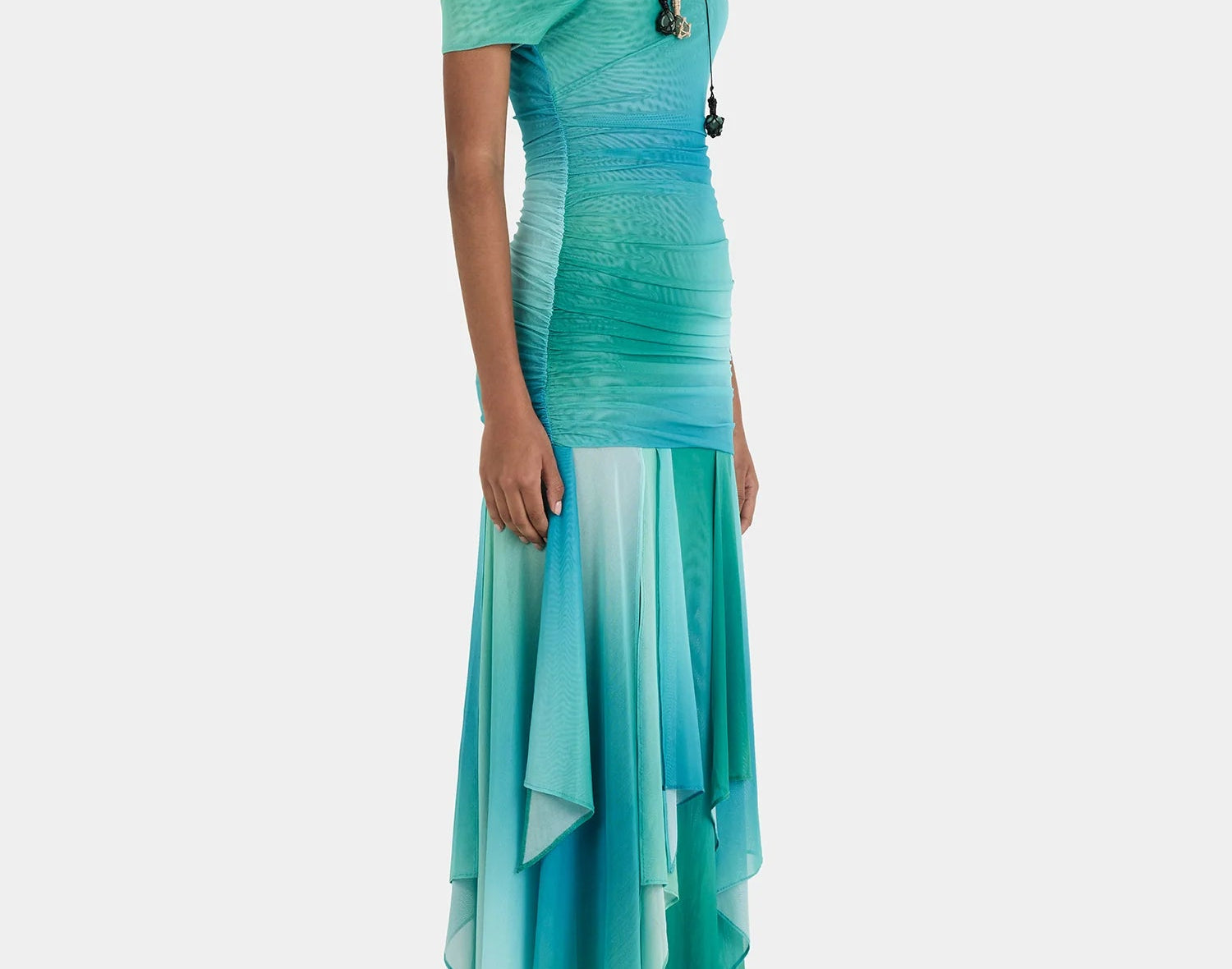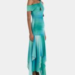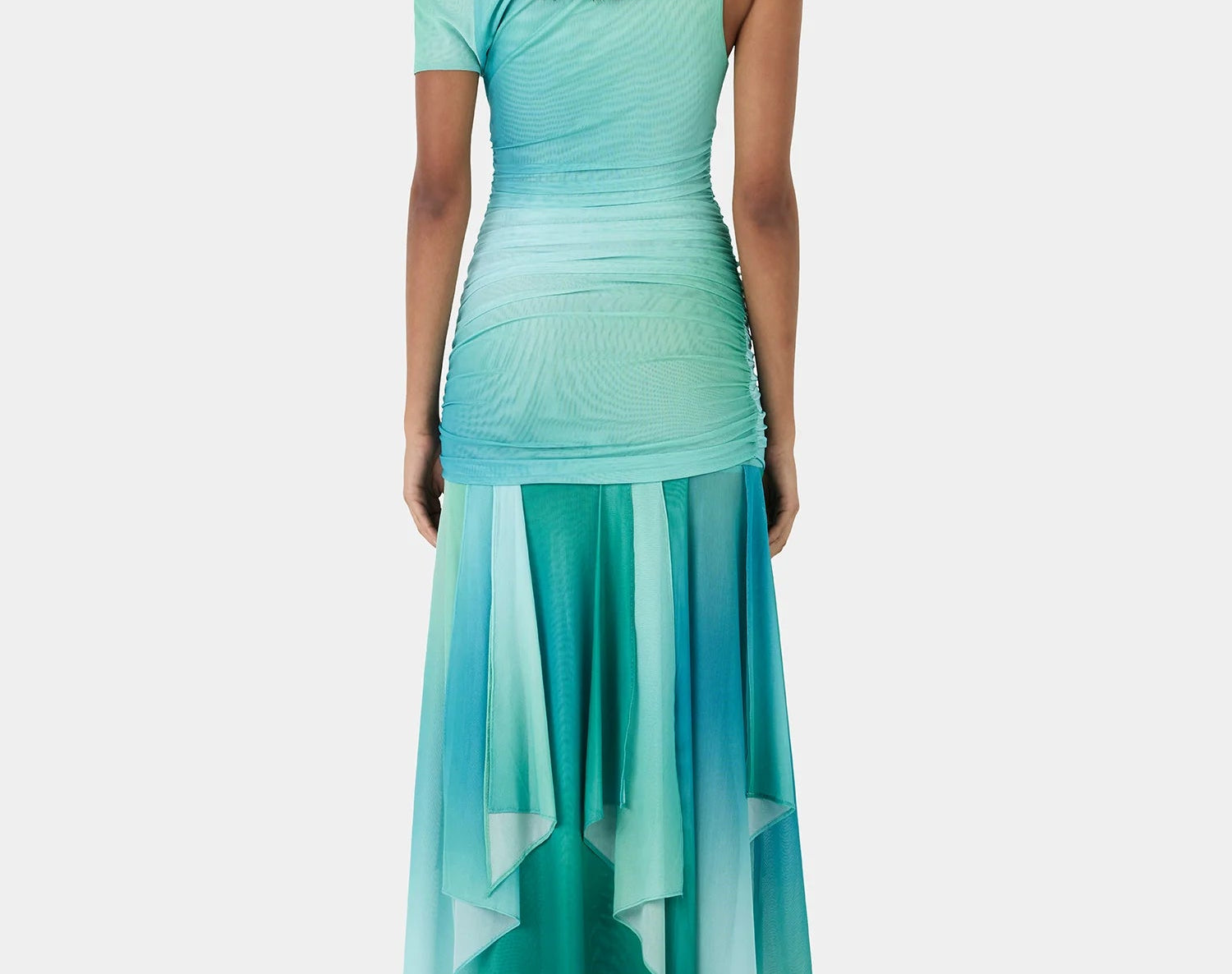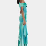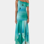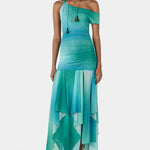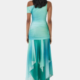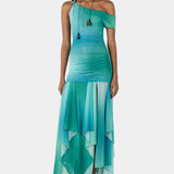 Introducing Hansen and Gretel's Celia Maxi Dress in Aura, a maxi-length silhouette in a gradient blue-aqua-green color. Designed with a double‑layer mesh bodice with soft gathering at the hips, an asymmetrical one‑shoulder neckline with a dropped sleeve and twisted strap, and a flowing handkerchief hem for delicate movement.