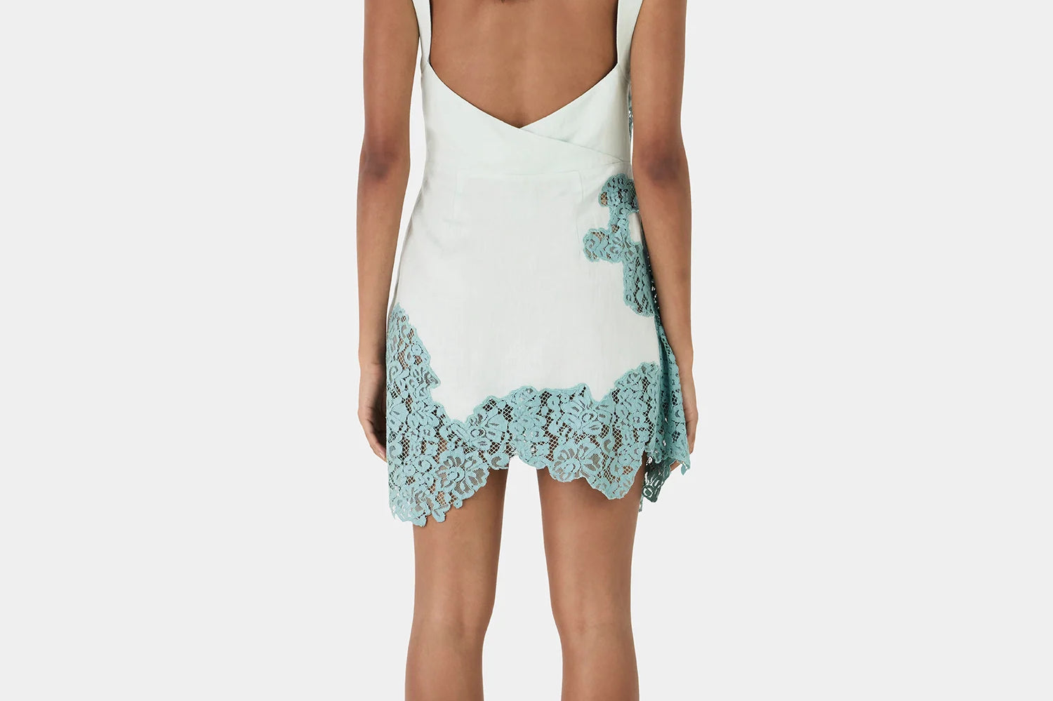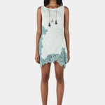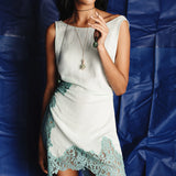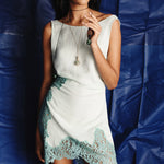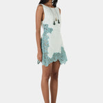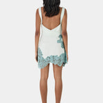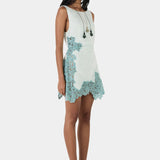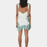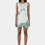 Introducing Hanen & Grete's Cleo Mini Dress in Seaspray is a mini length dress in an Aqua blue hue. The Cleo Mini Dress features an open mid-back and an asymmetrical lace hemline that adds soft detail and movement. Crafted without lining for a sheer, lightweight feel, this piece is perfect for layering or warm weather styling.