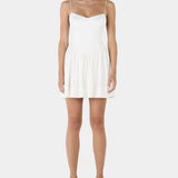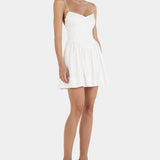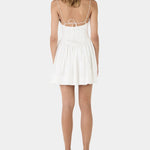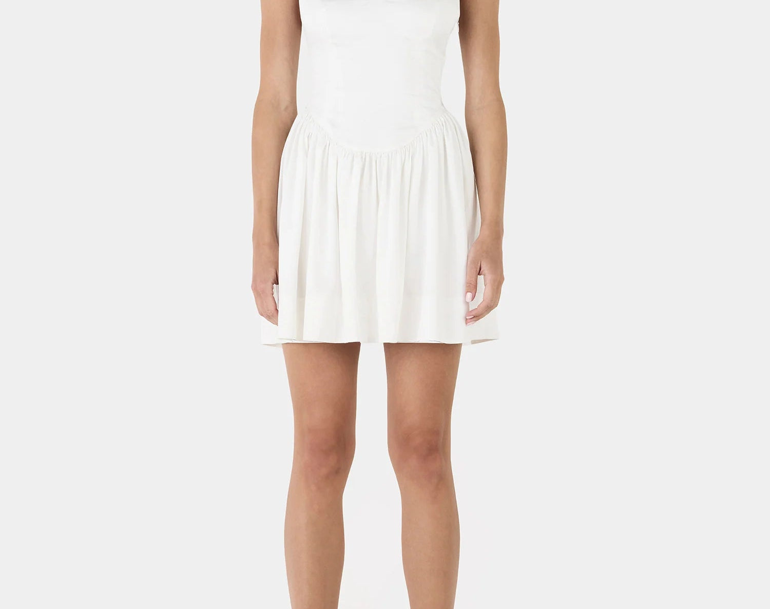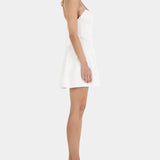 Introducing Hansen and Gretel's Cordelia Mini Dress in White, a mini dress silhouette in soft white hue. Designed in a luxe modal-silk blend with a breathable cotton lining, featuring adjustable rouleau shoulder ties, a wide V-neck panelled bodice, and a gently gathered skirt for an effortlessly flattering silhouette.