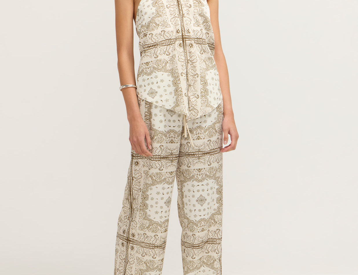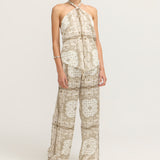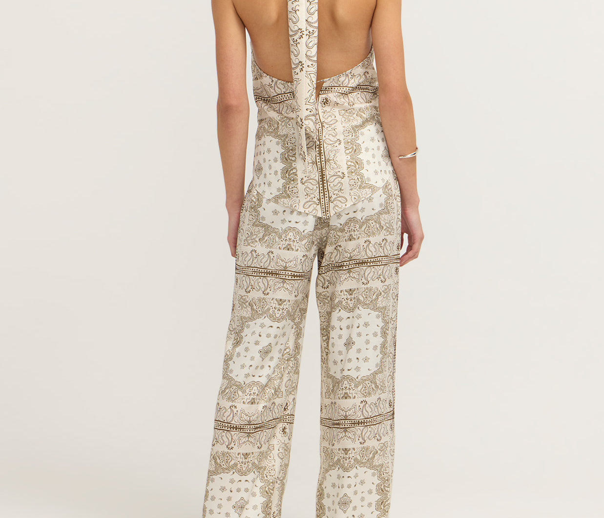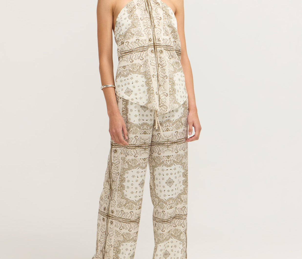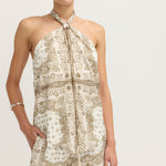 Introducing the Junie Halter Top in Beige Bandana a relaxed-fit piece perfect for warm days. Featuring a flattering pointed hemline and a dramatic low back, this top exudes summer elegance. The adjustable neck tie ensures a customizable fit, while the fully lined design adds comfort and quality. Pair it with the matching Bowden Pant for a chic, elevated summer outfit.