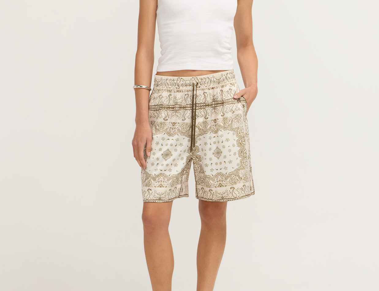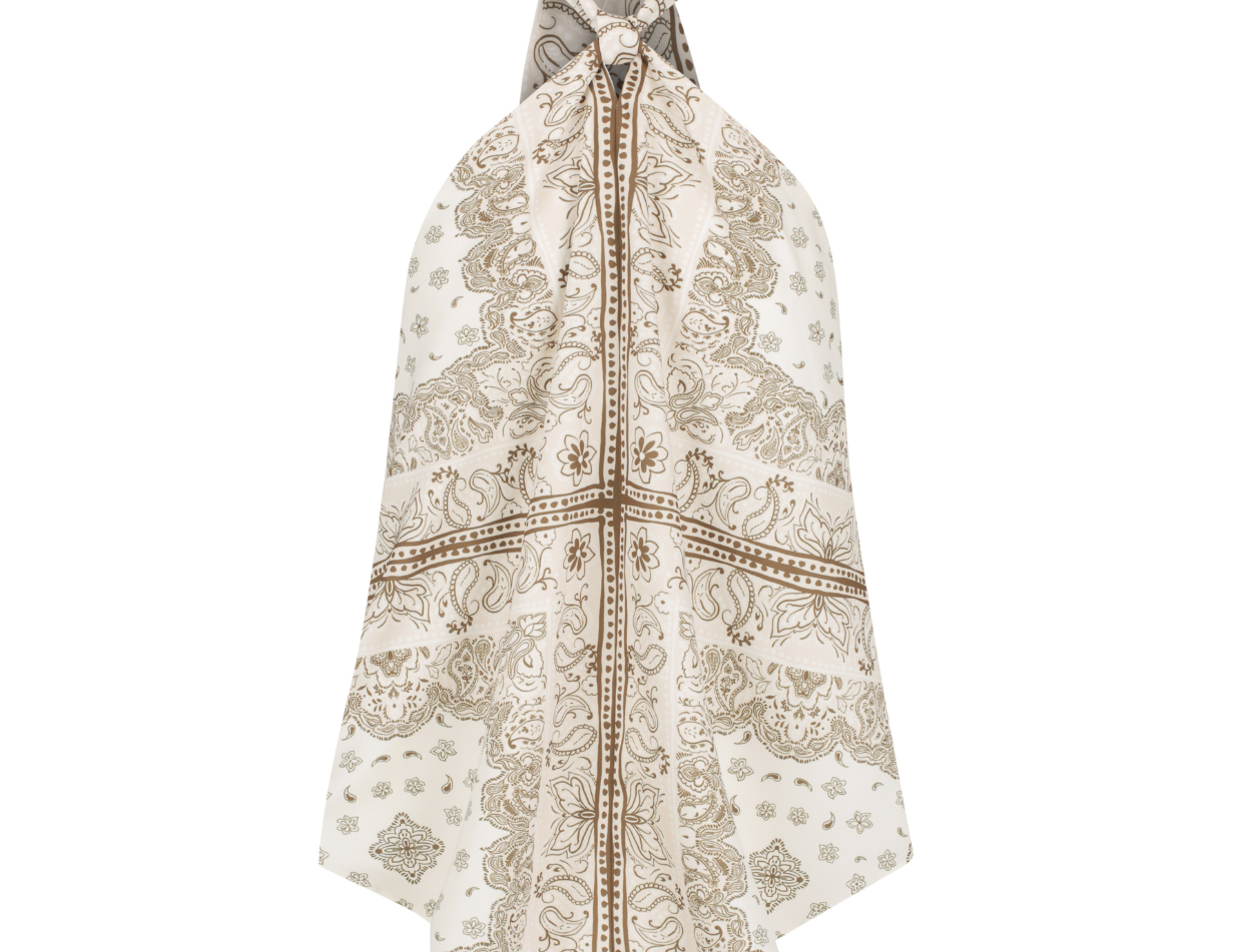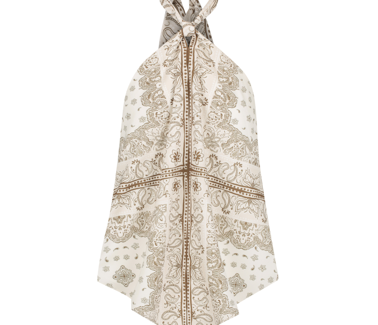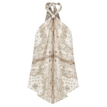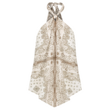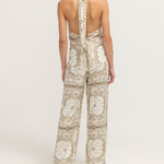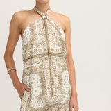 Introducing the Junie Halter Top in Beige Bandana a relaxed-fit piece perfect for warm days. Featuring a flattering pointed hemline and a dramatic low back, this top exudes summer elegance. The adjustable neck tie ensures a customizable fit, while the fully lined design adds comfort and quality. Pair it with the matching Bowden Pant for a chic, elevated summer outfit.