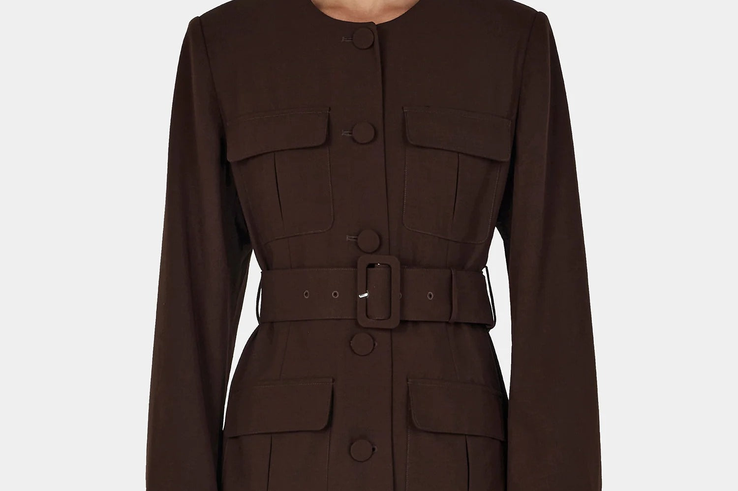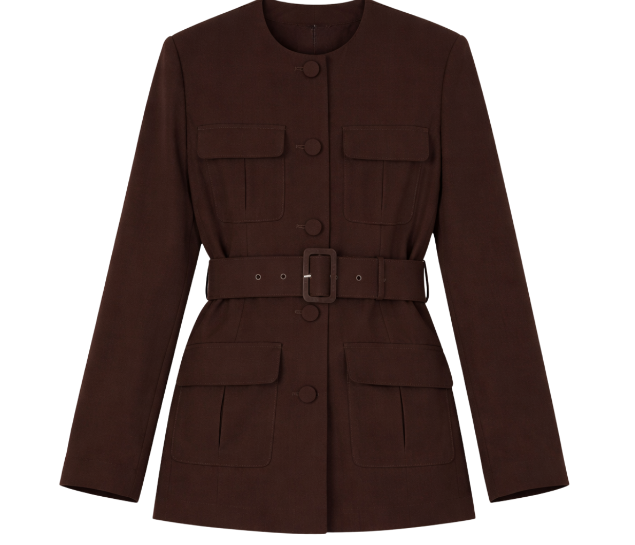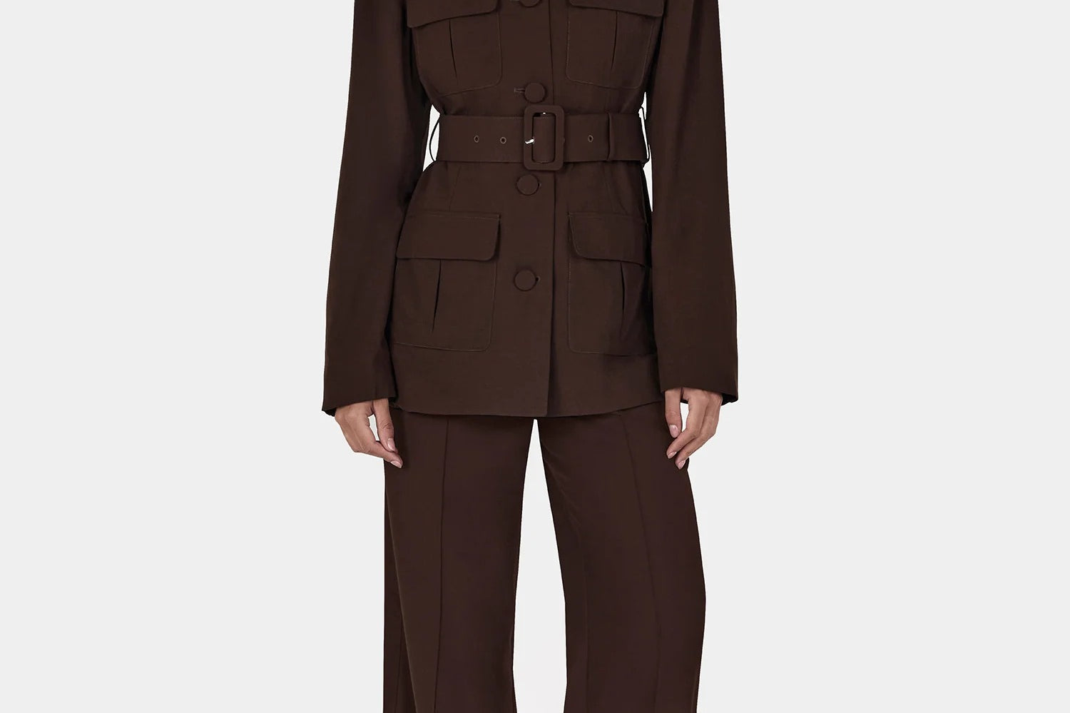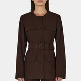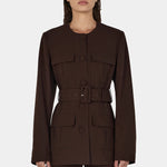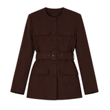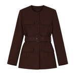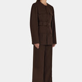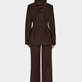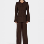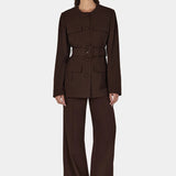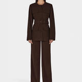 Introducing Hansen and Gretel's Michael Blazer in Chocolate, a tailored militarian outerwear jacket. Designed with a tailored fit silhouette, featuring a round neckline, princess seams at the back, and flap pockets at the chest and sides, and finished with large self-covered buttons and a waist belt with a matching buckle. Pair with the Michael suit pants for the perfect coordinated suit set.