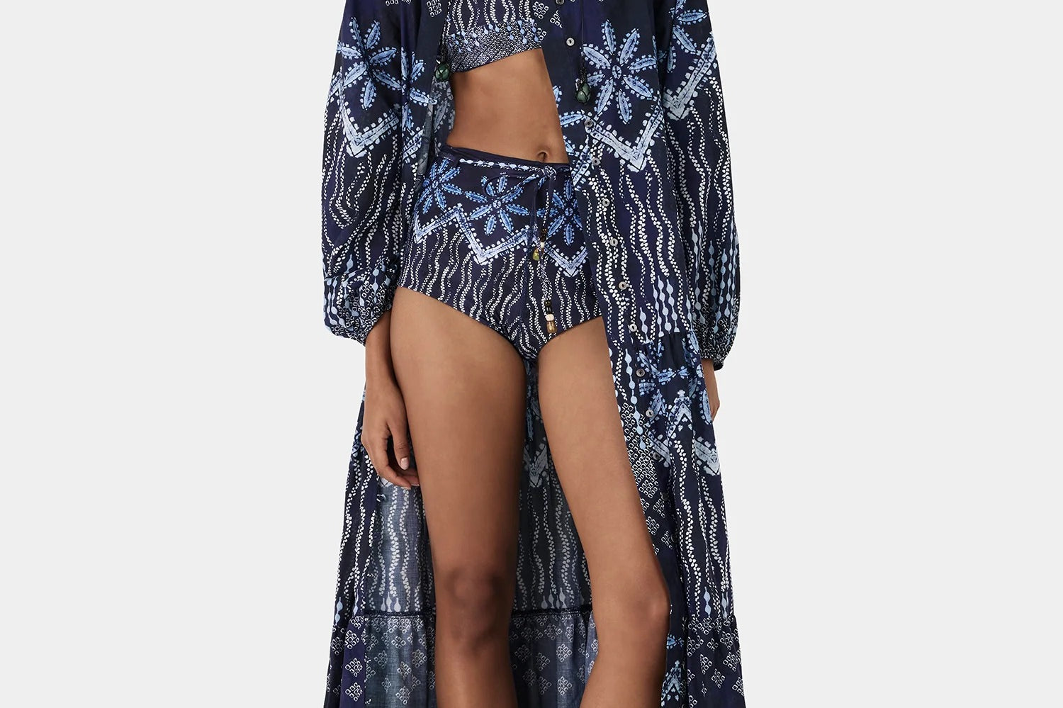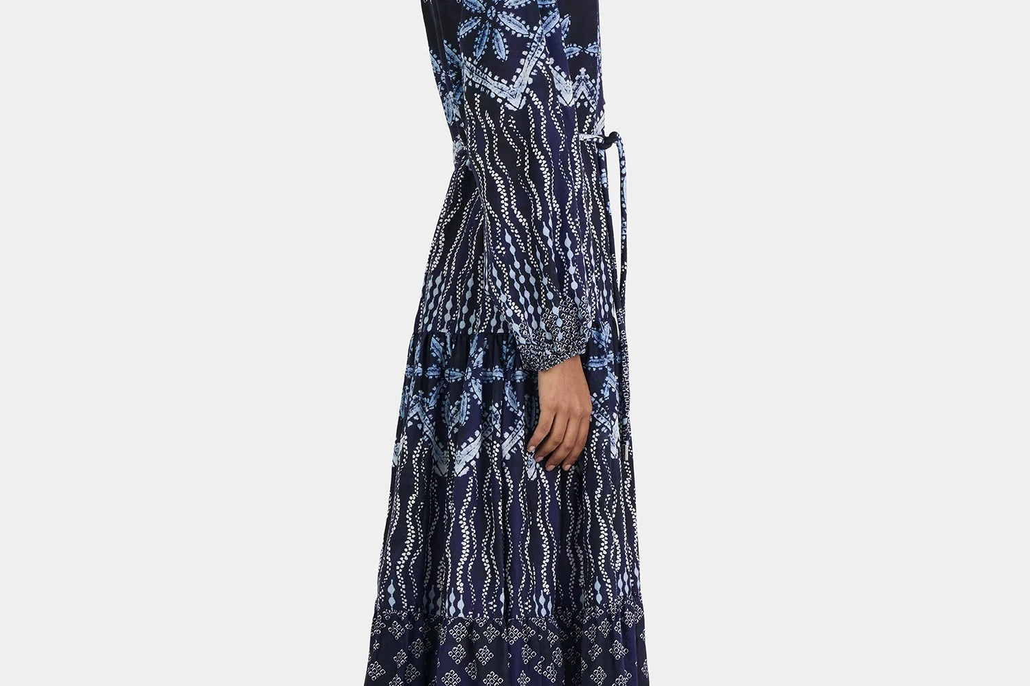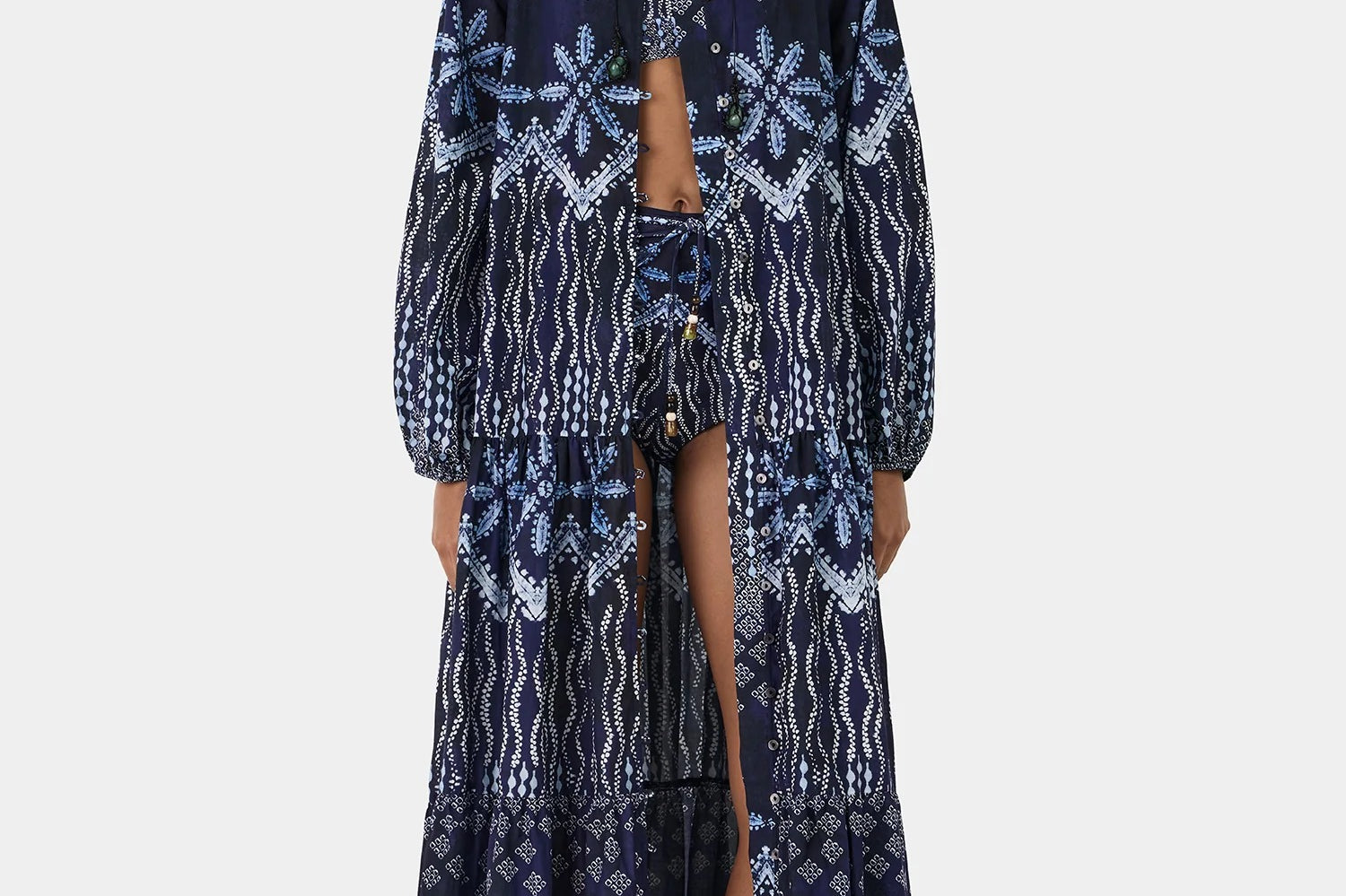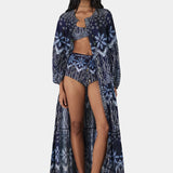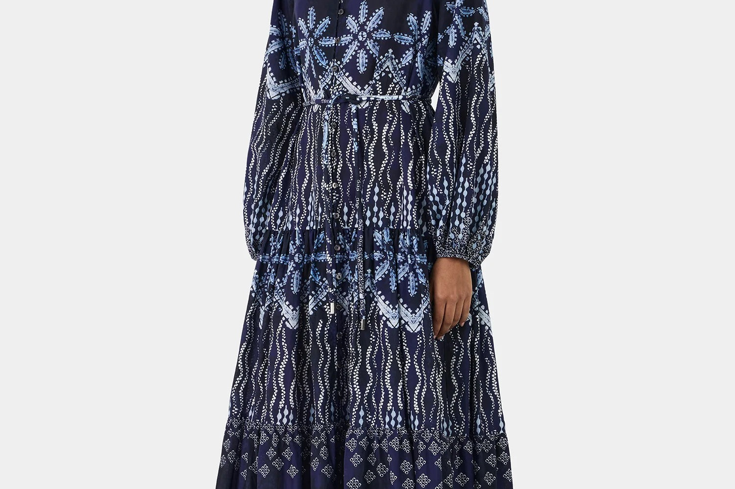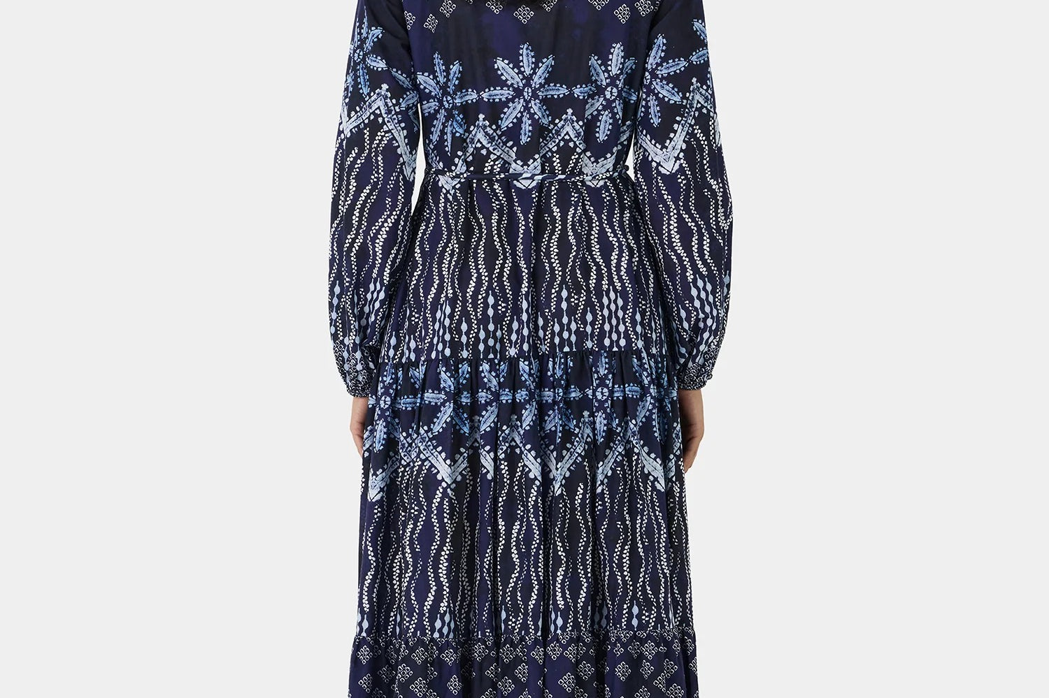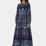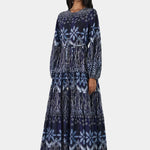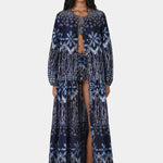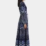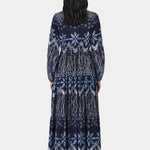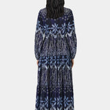 Introducing Hansen & Gretel's Nia Maxi Dress in Indigo Drift, a long-sleeve, maxi-length dress silhouette in a blue-navy tropical print. The dress features a button-down centre front with rouleau loop detailing and a waist tie to define the silhouette. An effortless piece for elevated everyday dressing or special occasion
