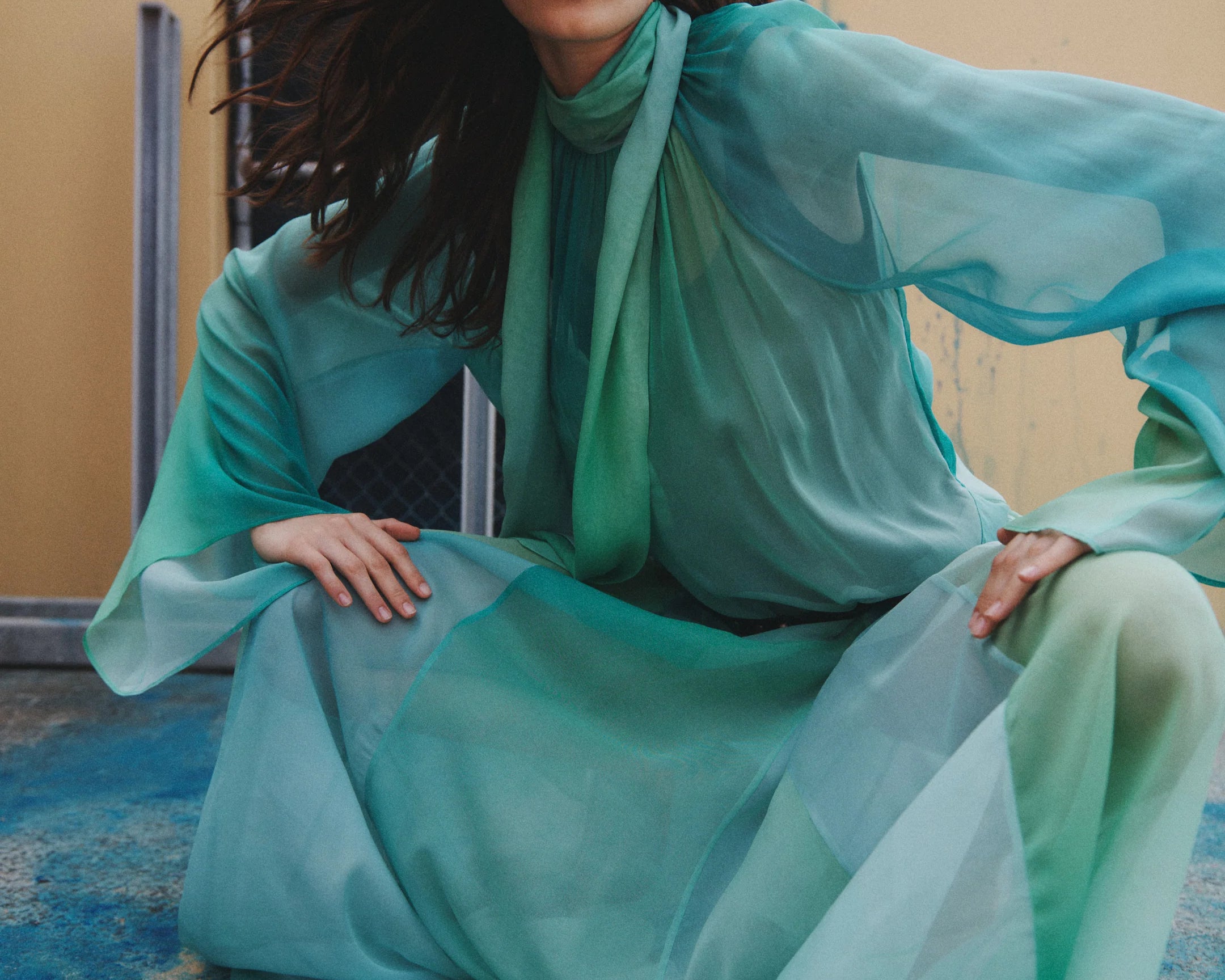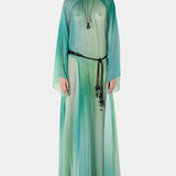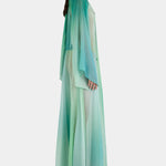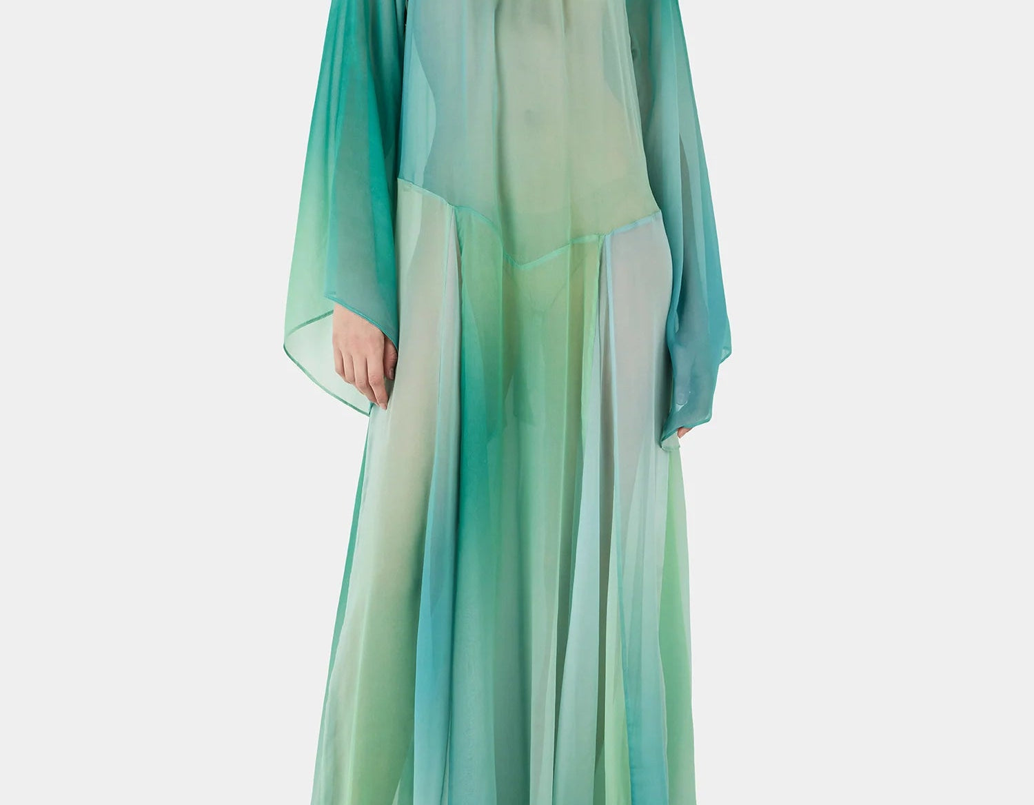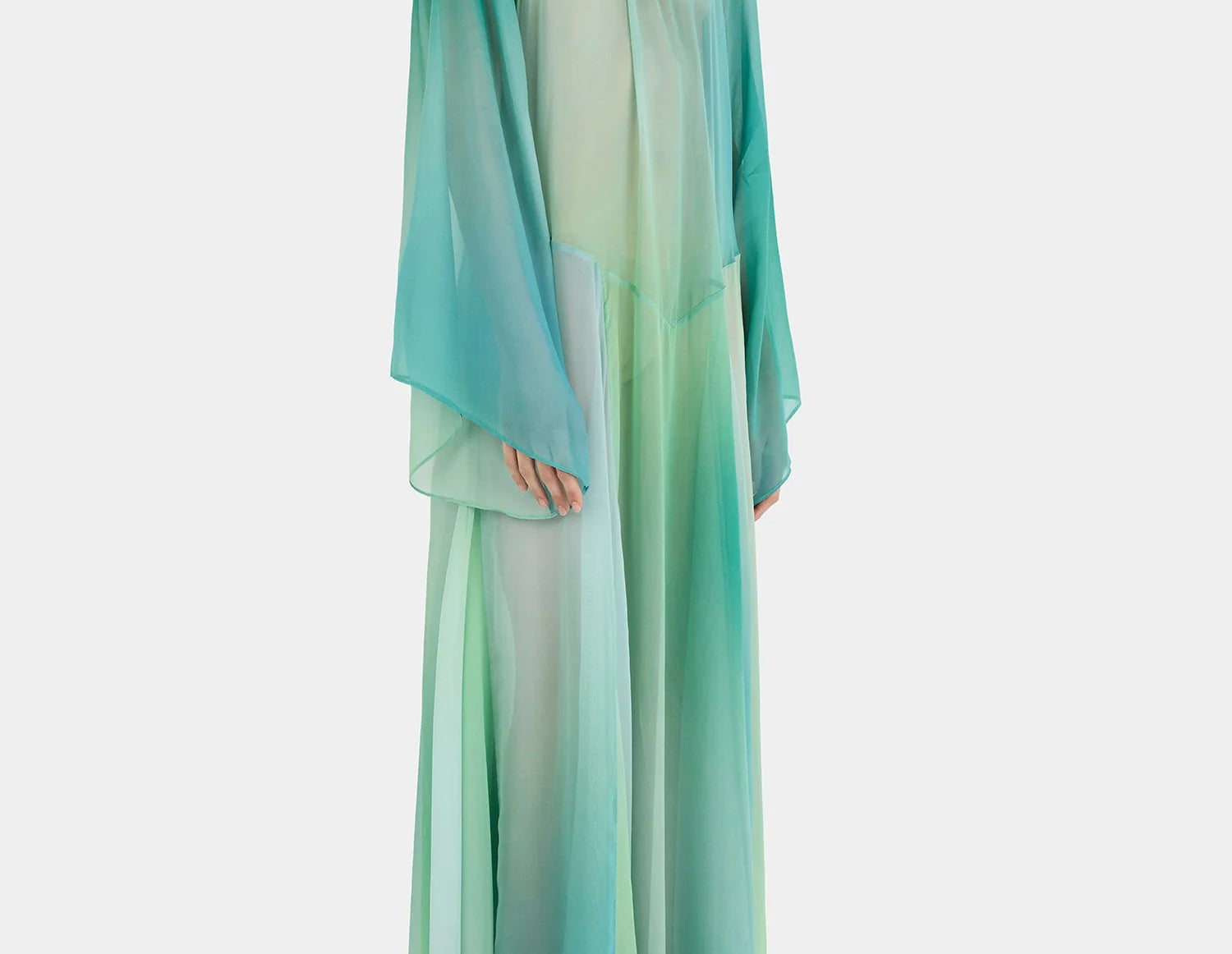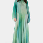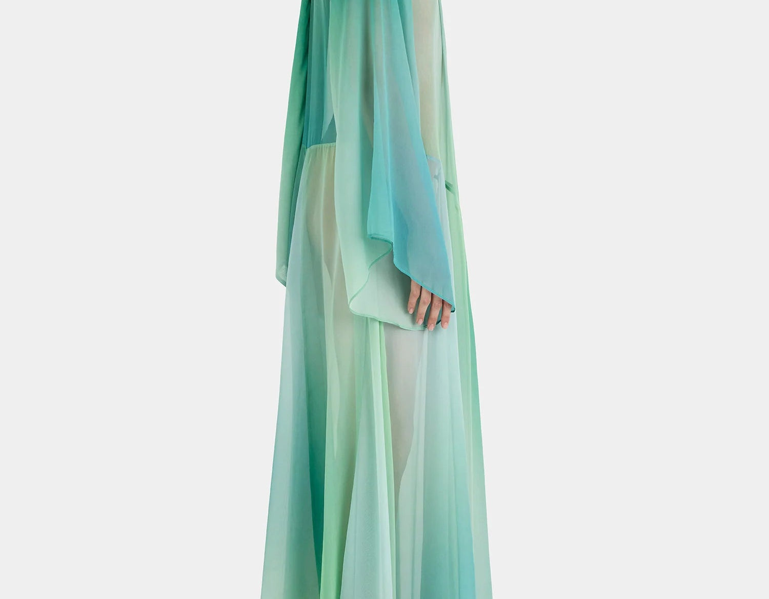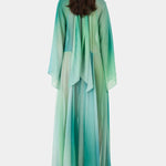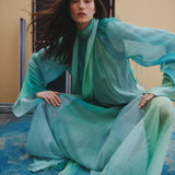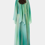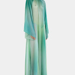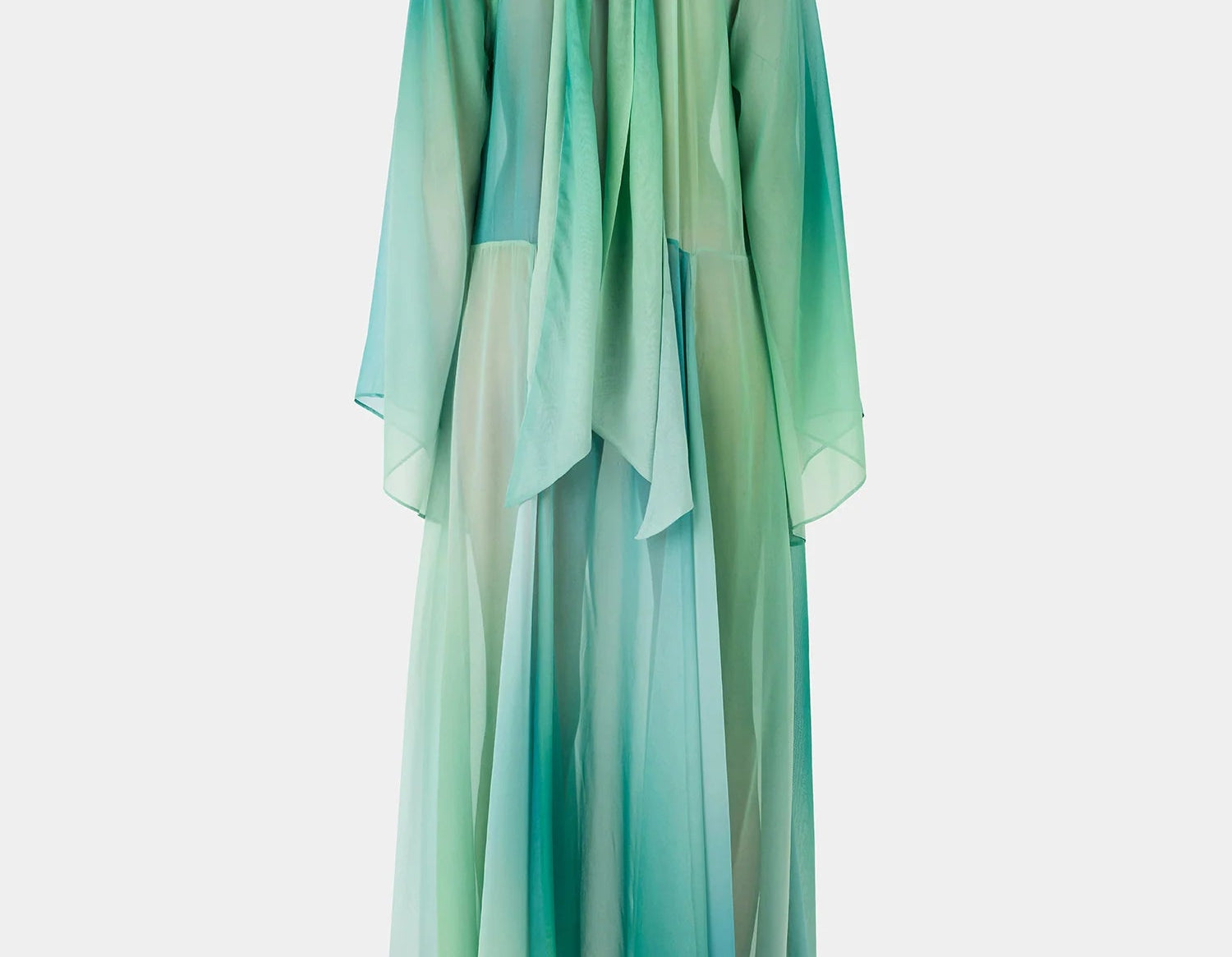 Introducing Hansen and Gretel's Olympia Maxi Dress in Aura, a long-sleeve, maxi-length dress silhouette in a gradient green print. Designed in a fluid, long-sleeve maxi with wide raglan sleeves, a high gathered neckline with a tie, and an angled hip seam. The Olympia dress comes with matching satin shorties featuring a picot elastic waistband, all rendered in a dreamy gradient “Aura” print.