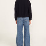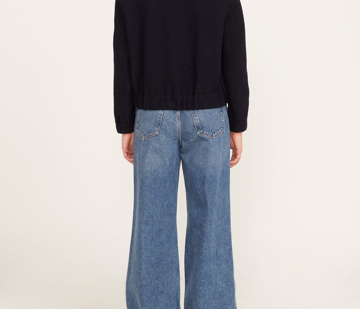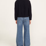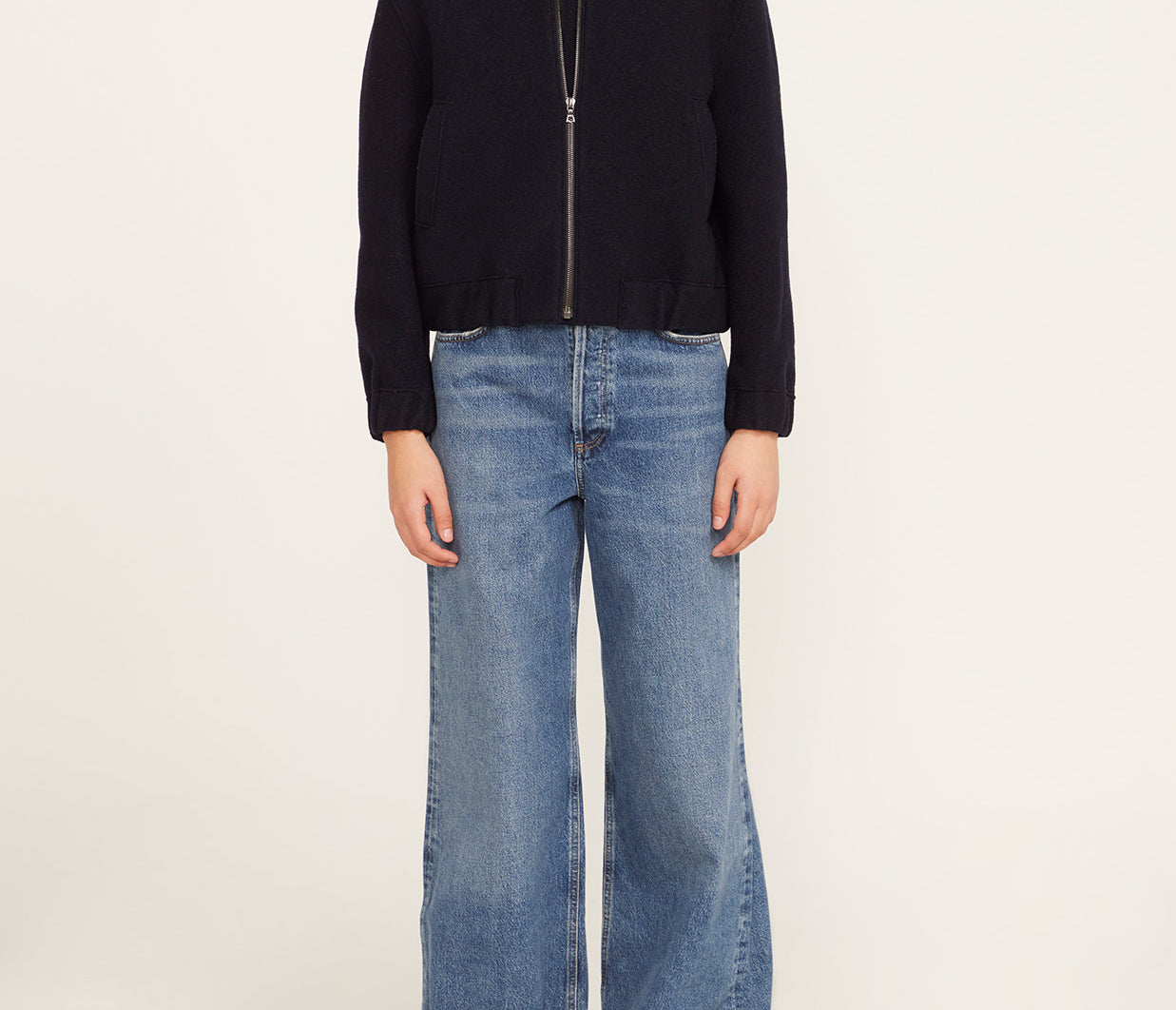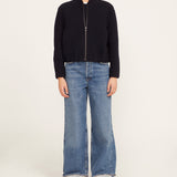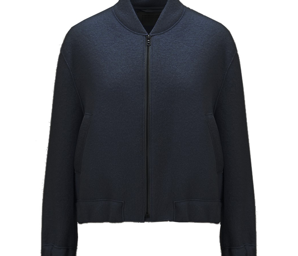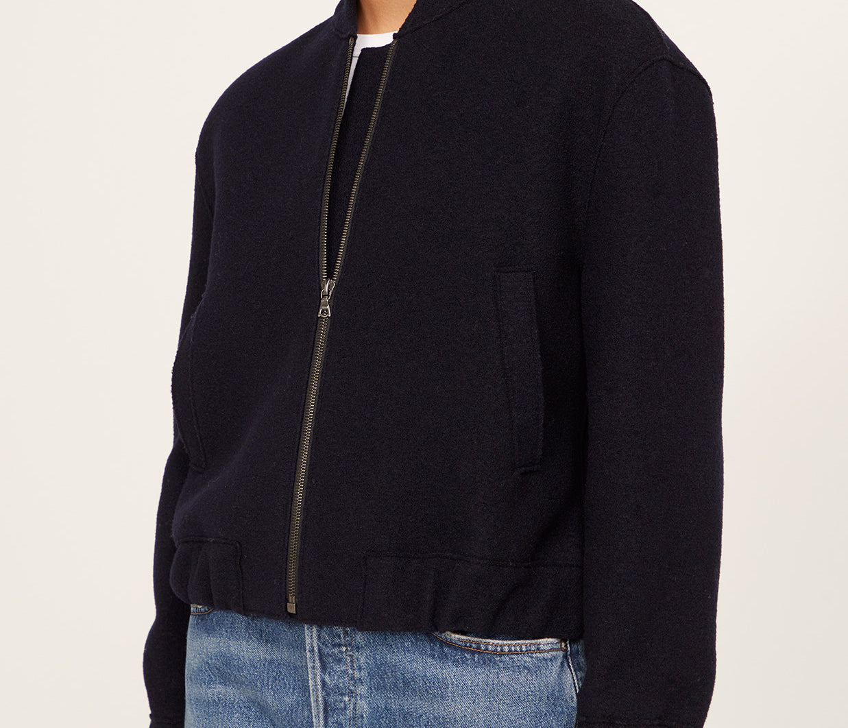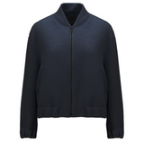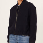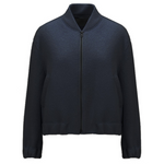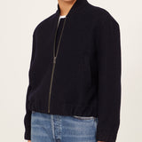 Introducing the Navy Cropped Wool Bomber Jacket from the renowned London brand, Harris Wharf. This unlined, navy blue bomber features a luxurious knitted wool blend with a boxy, cropped shape for a modern look. An elasticated hem and cuffs ensure a comfortable fit, while the elegant round collar adds a touch of sophistication. Made from 100% Virgin Wool, this jacket combines quality and fashion seamlessly.
