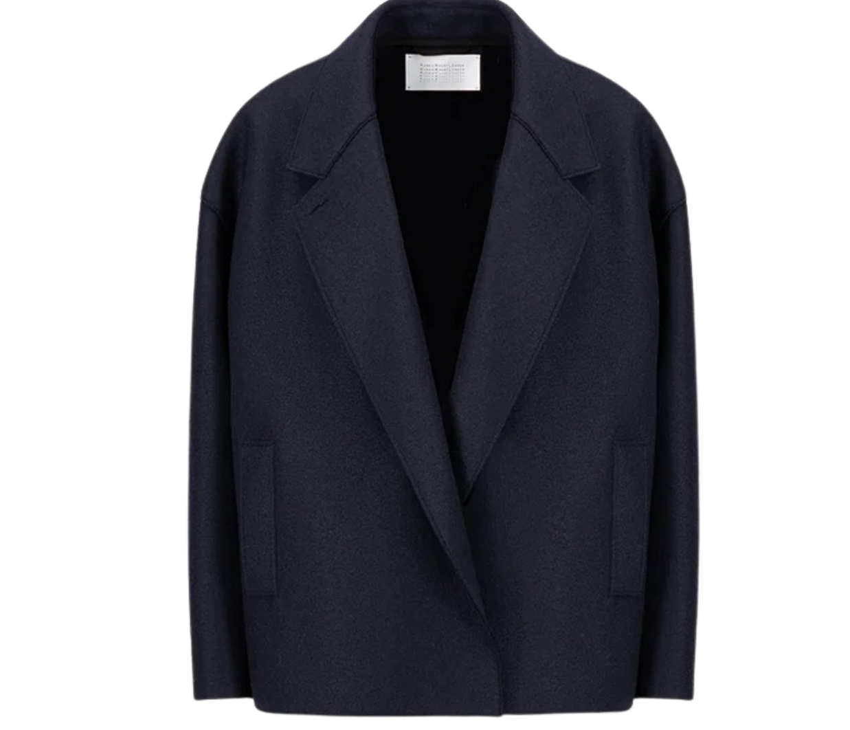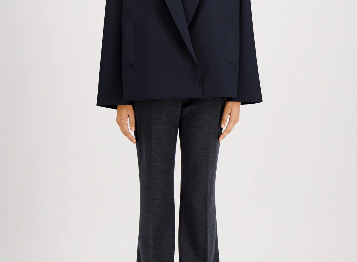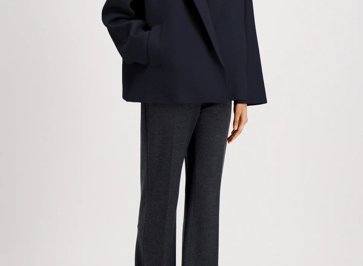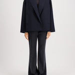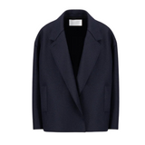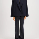 Introducing Harris Wharf London's Oversized Boxy Wool Jacket in Navy, a short, boxy jacket with a tailored jacket silhouette in a pressed wool. The outerwear features dropped shoulders and wide sleeves for effortless layering. Detailed with a notched lapel, welt pockets, and a low double-breasted button fastening with a full button-up closure, it brings refined structure, while raw-edge finishing lends a contemporary edge. The perfect oversized wool blazer to take you from day to evening with ease.