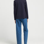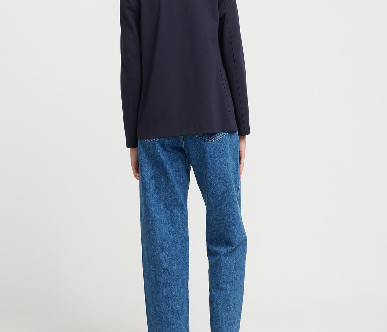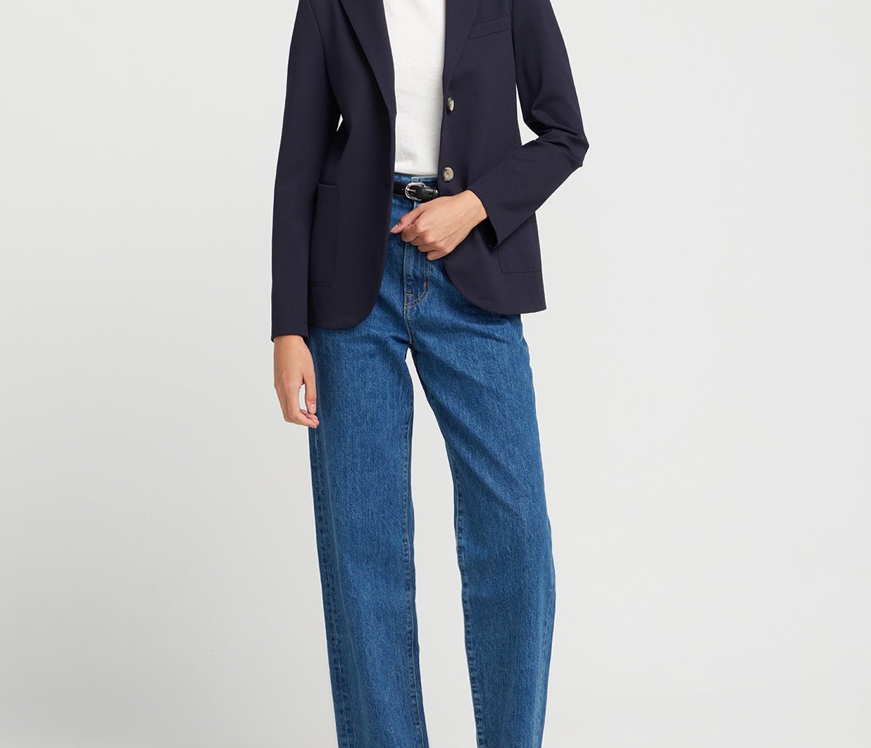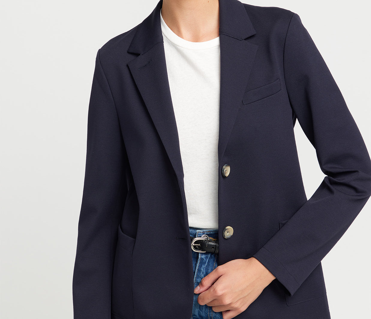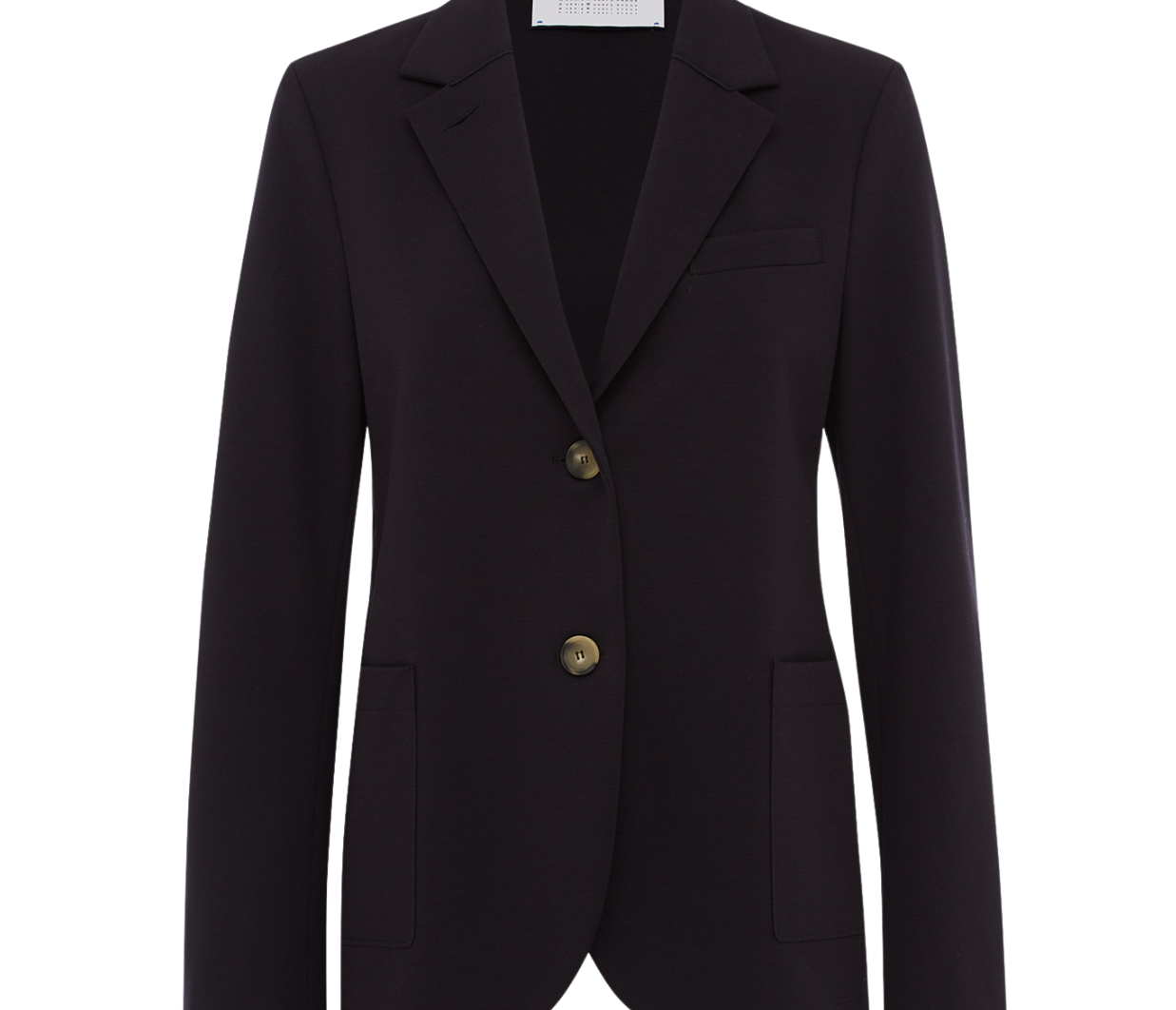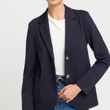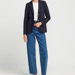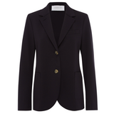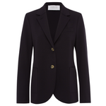 This single-breasted blazer by HARRIS WHARF LONDON is crafted from navy blue viscose and features a round cut, notched lapels, and a front button fastening. With long sleeves and a curved hem, it offers a clean finish. Made in Italy with Italian fabric.