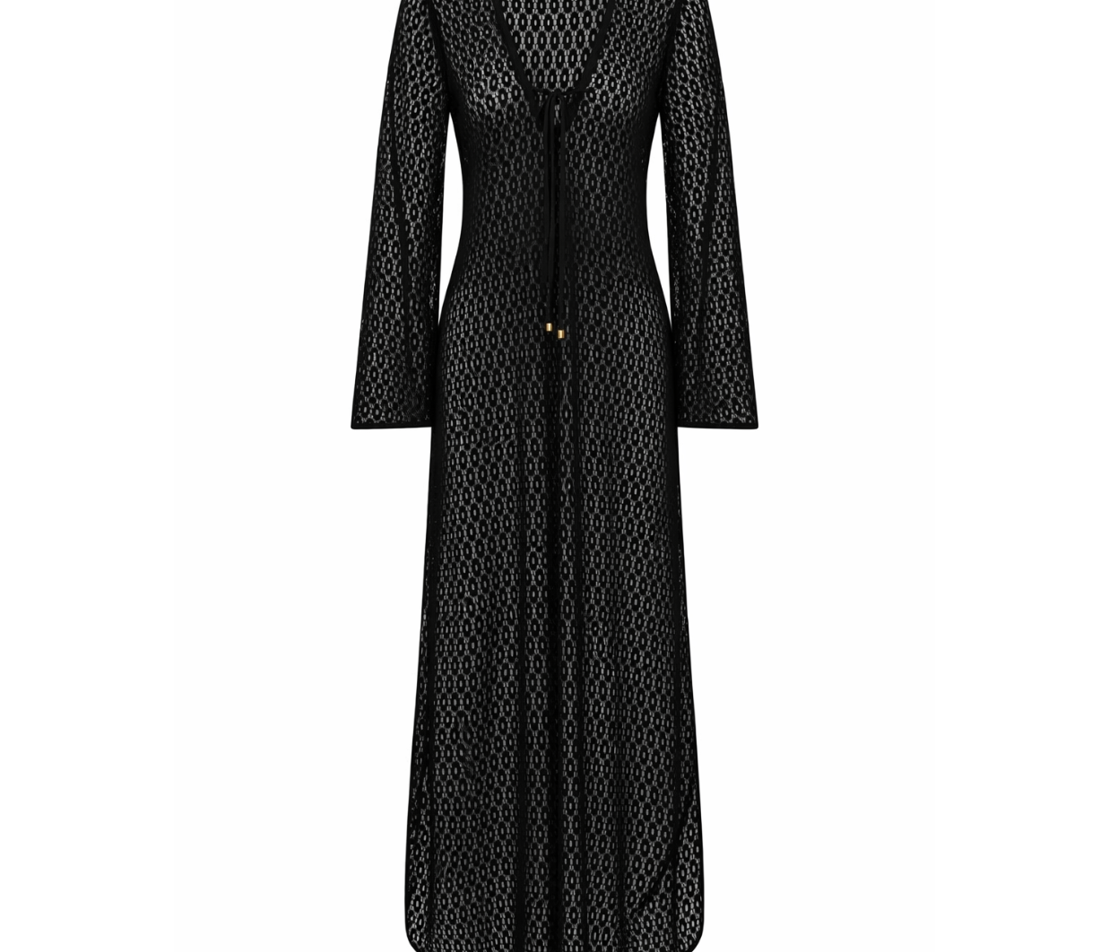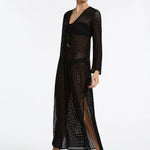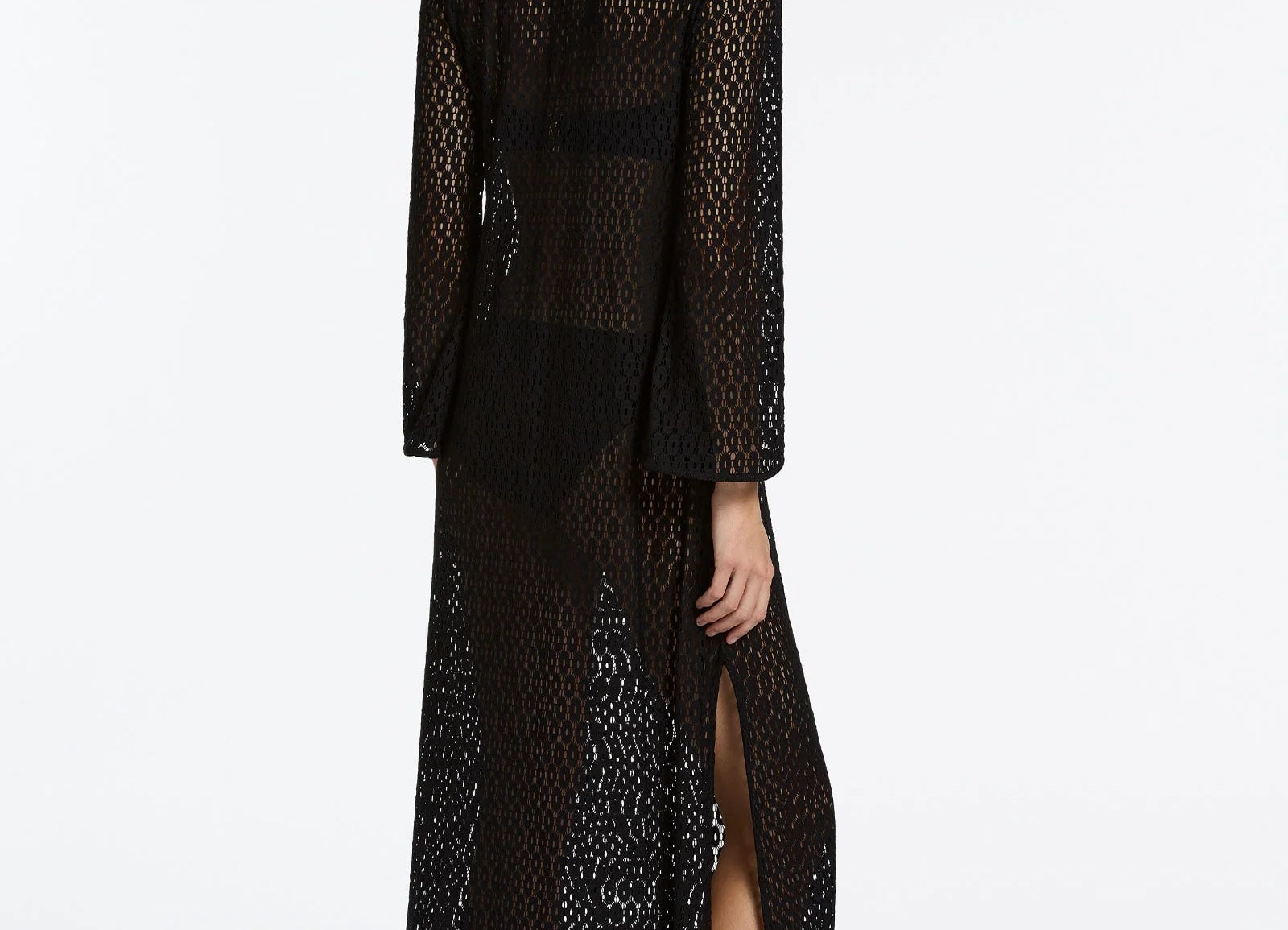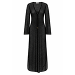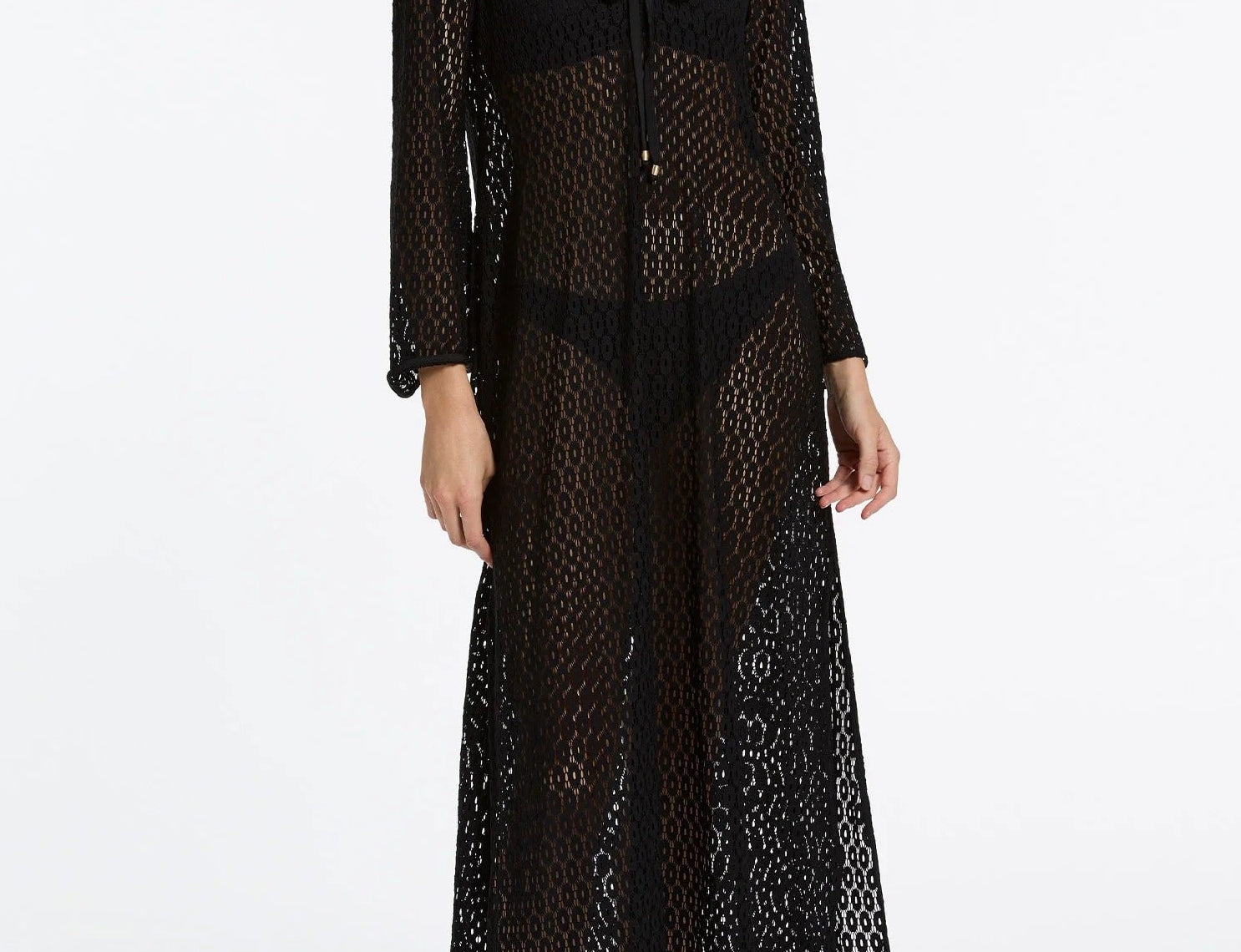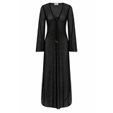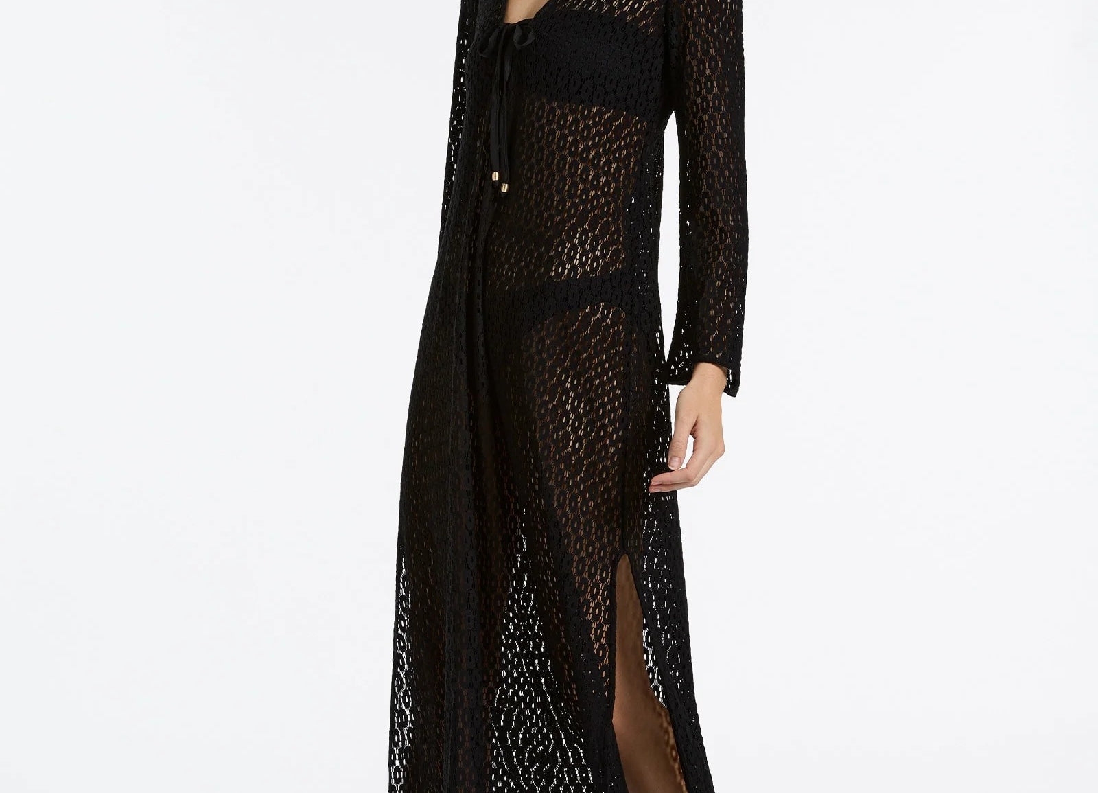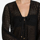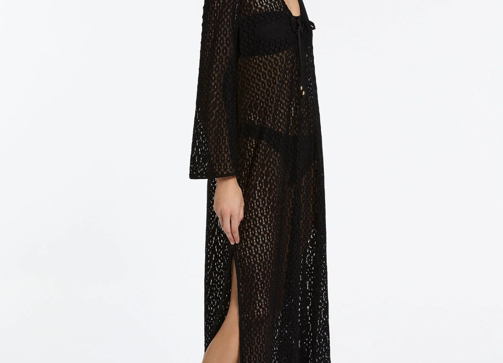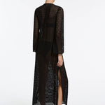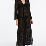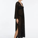 Introducing Jets Stretch Lace Maxi Kaftan in Black, a swim cover-up for resort styling. The maxi kaftan features a low V neckline and fluid wide sleeves for a relaxed, elevated silhouette. Crafted from stretch lace, it drapes beautifully over swimwear, while side splits add movement and ease. Finished with a neck tie for adjustable fit, it’s the perfect throw-on from poolside to sunset.