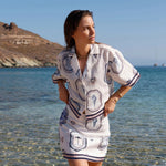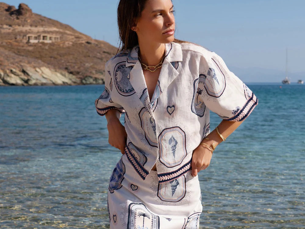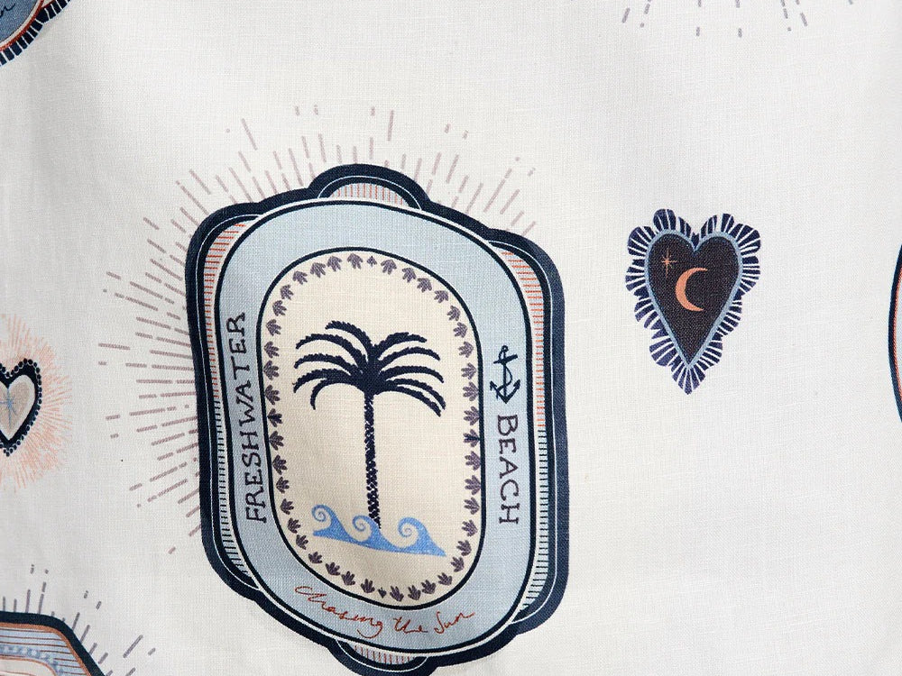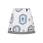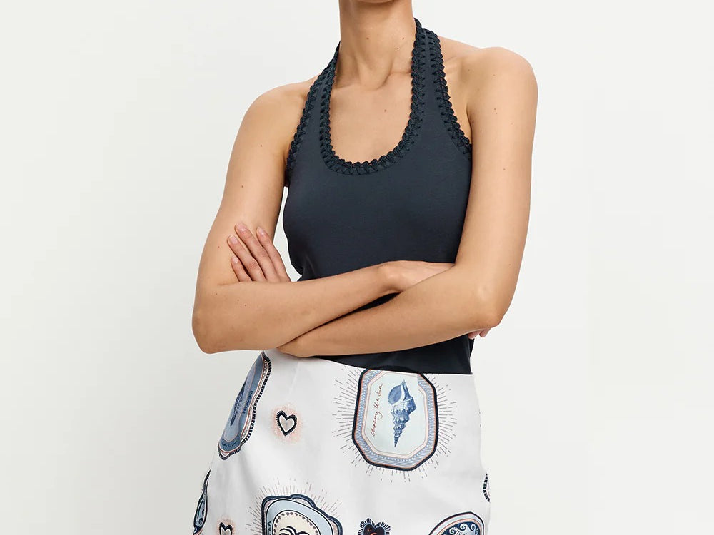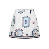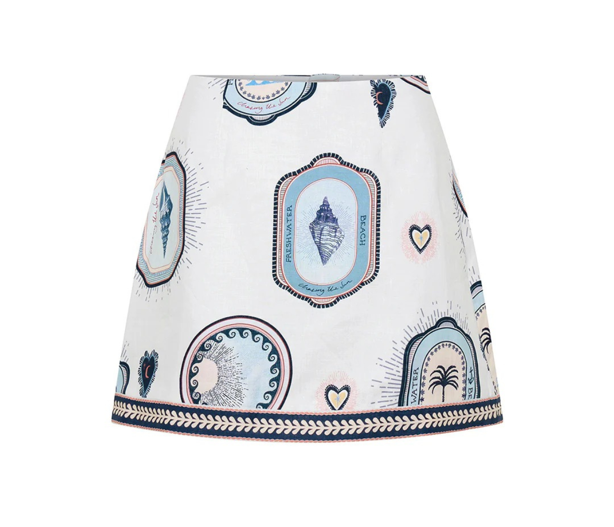 Introducing Kivari's Alessia Mini Skirt in Cream Navy, a mini-length skirt silhouette. The Alessia is vintage-inspired coastal medallions, shell motifs and palm emblems in soft blue and sand tones, creating a nostalgic print with an effortless seaside charm. The Alessia Mini Skirt is an a-line skirt featuring a contrast print border across the hem and complete with a centre back zip. Pair with the matching Alessia Top for a coordinated set.