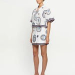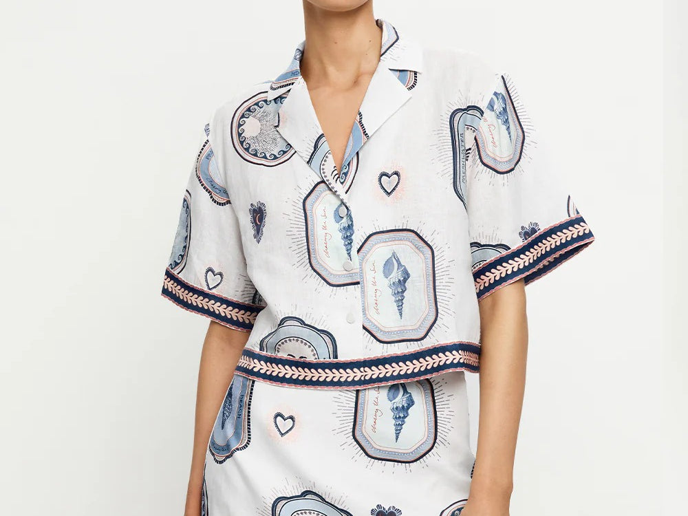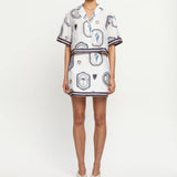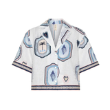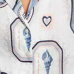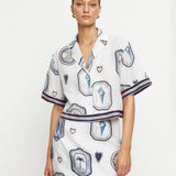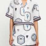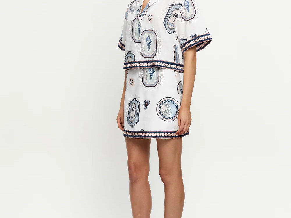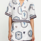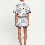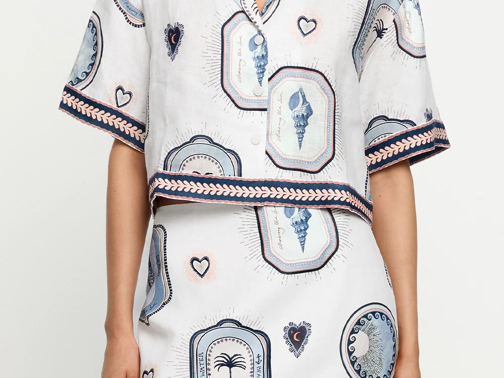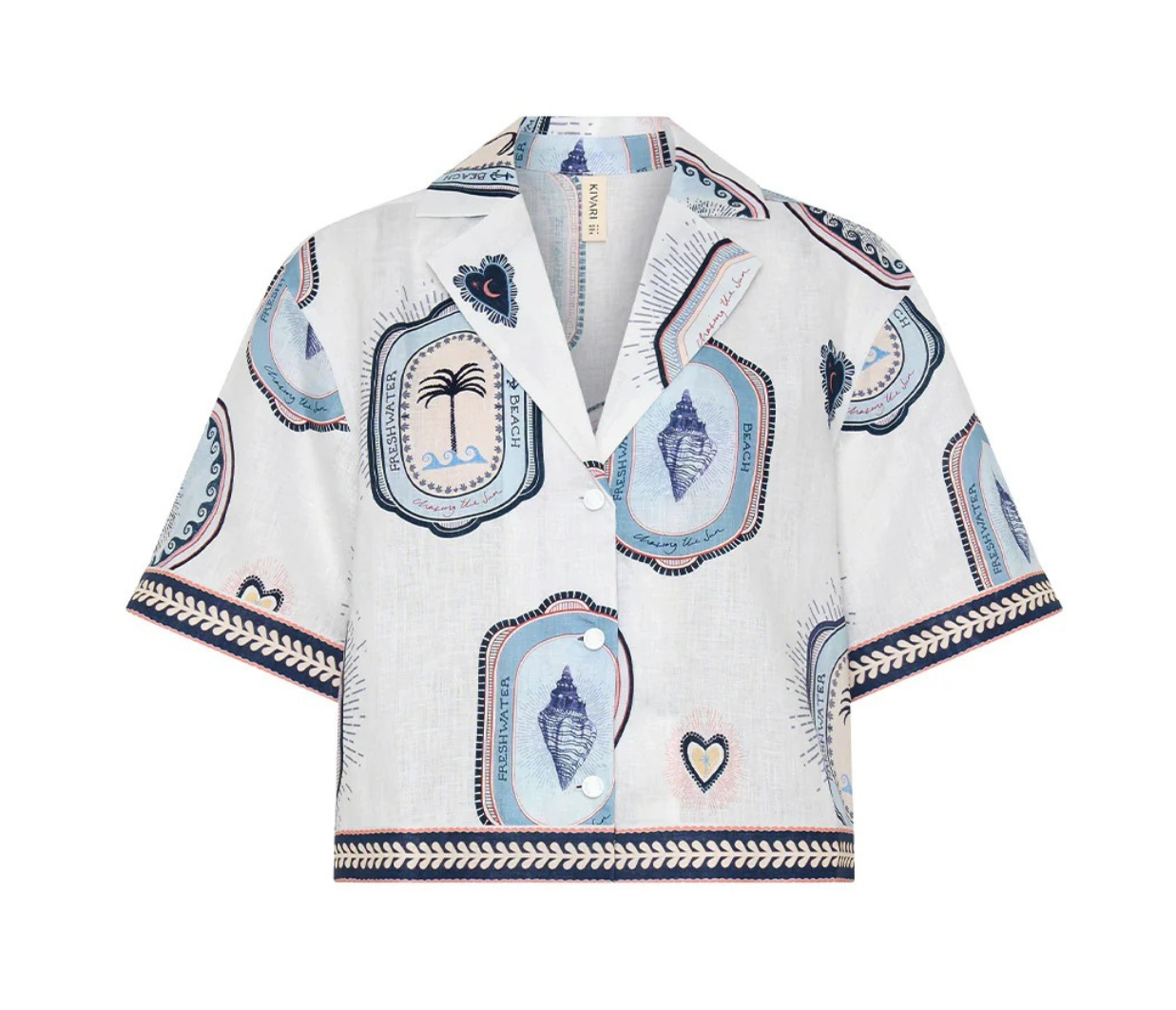 Introducing Kivari's Alessia Top in Cream Navy, a cropped print T-shirt silhouette. The Alessia top is a vintage-inspired coastal medallions, shell motifs, and palm emblems in soft blue and sand tones, creating a nostalgic print with an effortless seaside charm. The Alessia Top is a cropped shirt featuring a soft V-neckline, a button-through front, short sleeves complete with contrast border print detail along the cuffs and hem. Pair with the matching Alessia Skirt for a coordinated look.