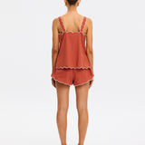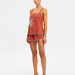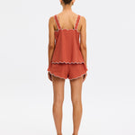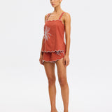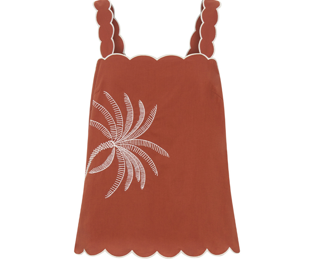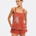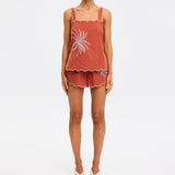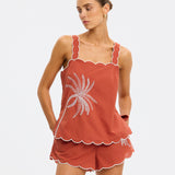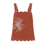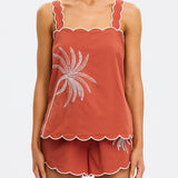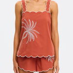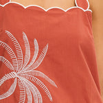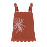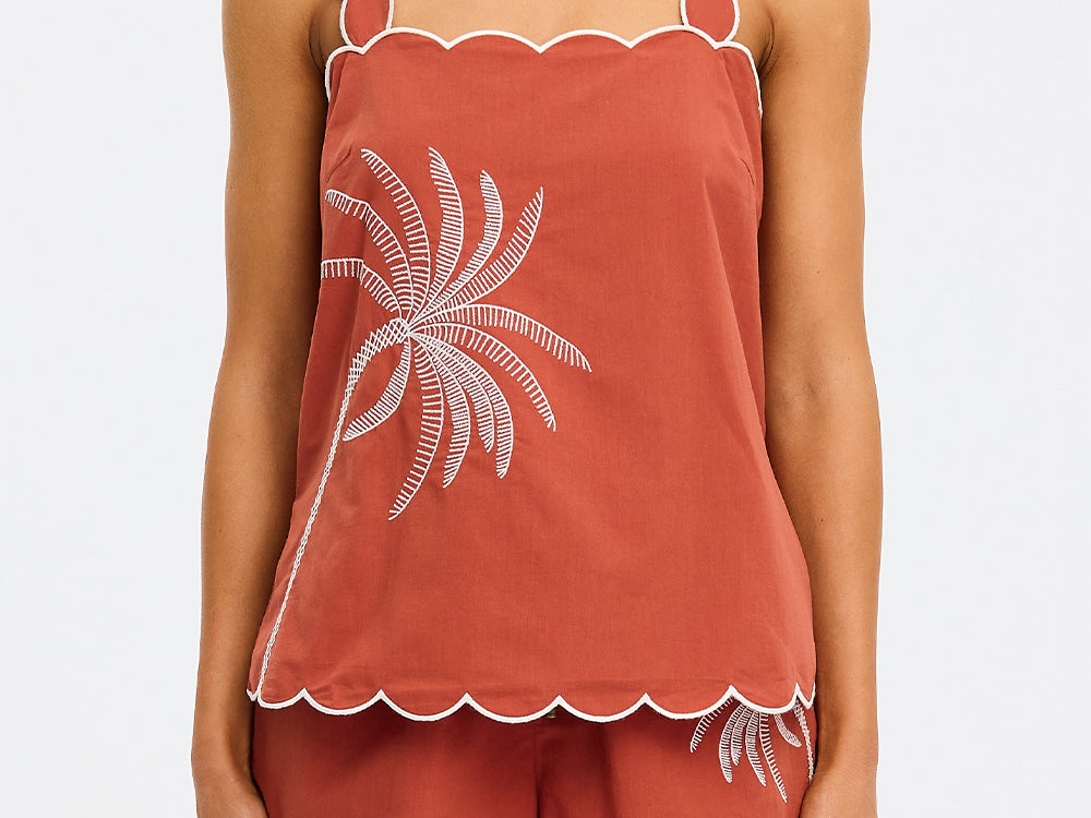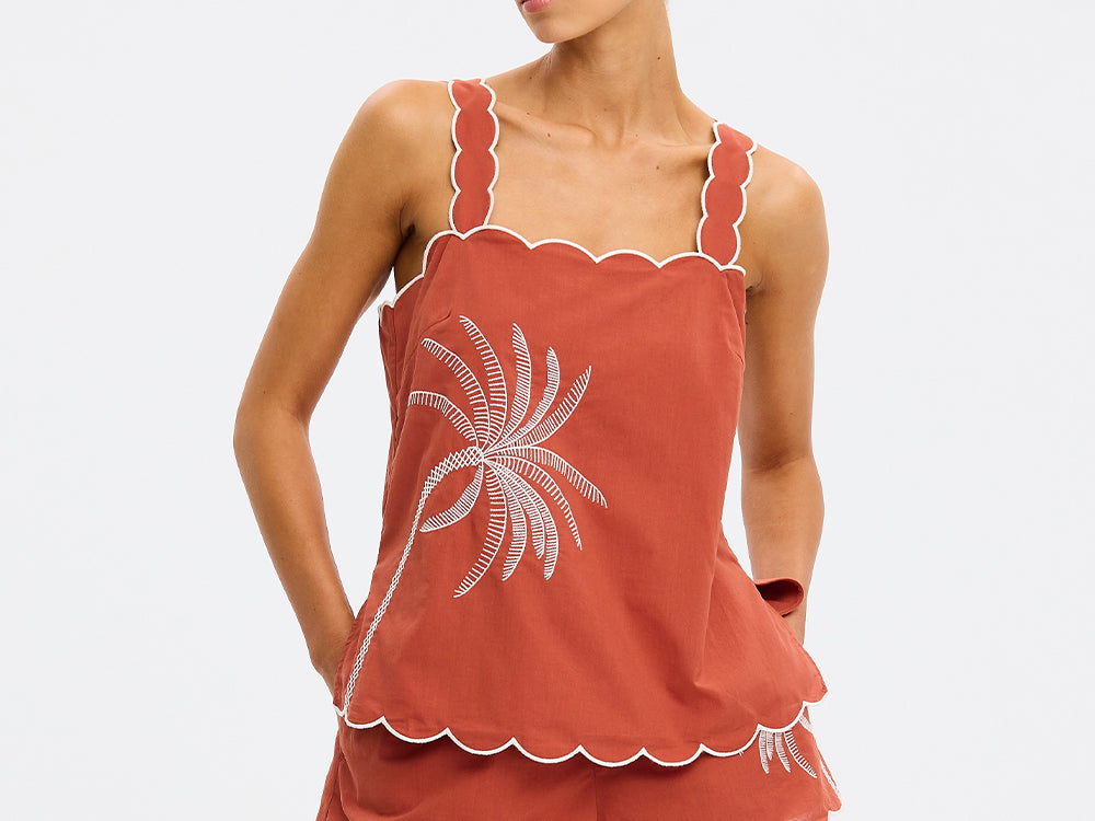Introducing Kivari’s Amaya Top in Rust, a relaxed cami top silhouette. Crafted in a warm rust hue, the Amaya Top features a delicate all-over white palm embroidery that adds a refined, tropical touch. The softly structured silhouette is finished with scalloped edges and contrast white piping, creating a feminine frame through the neckline, straps, and hem.