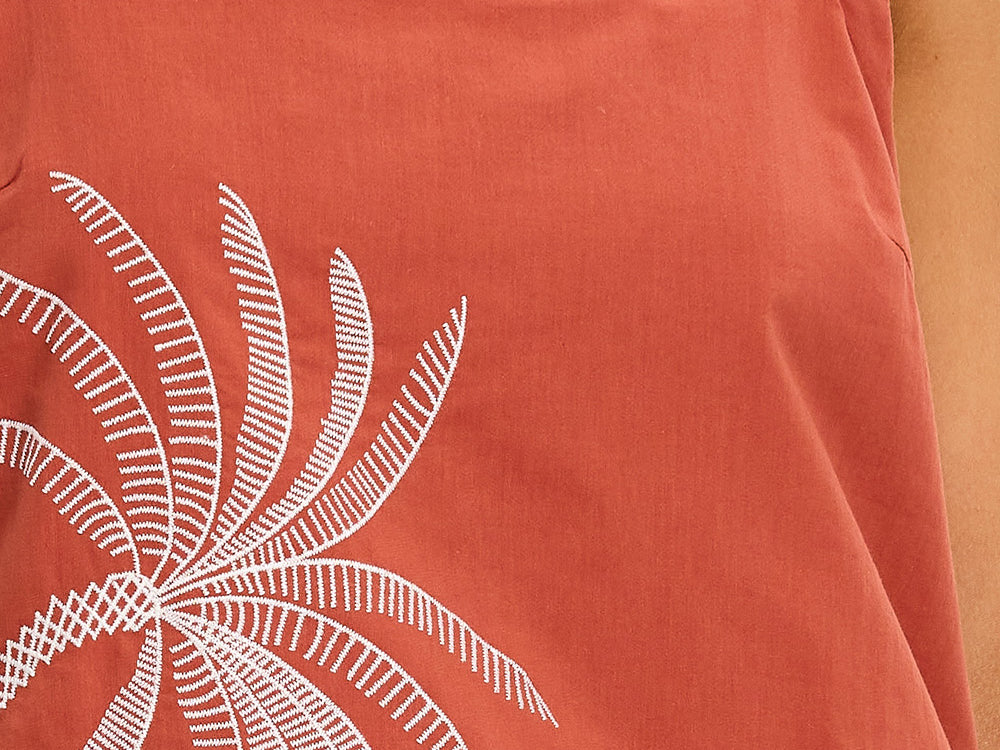 - Warm rust base with contrasting white palm embroidery