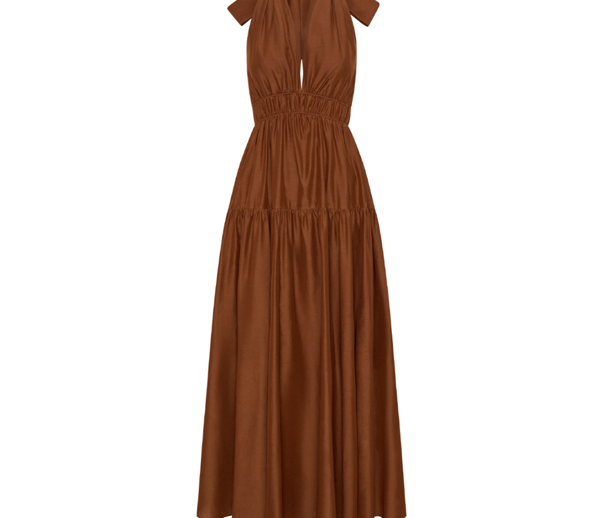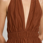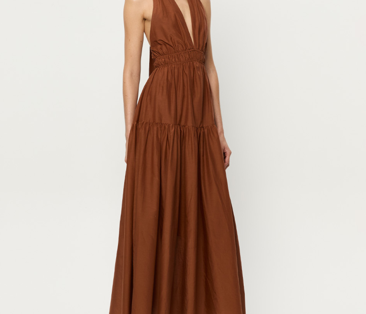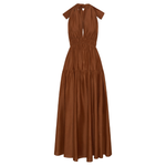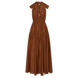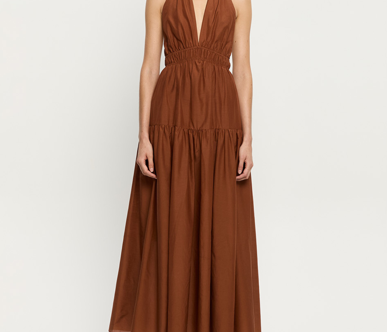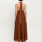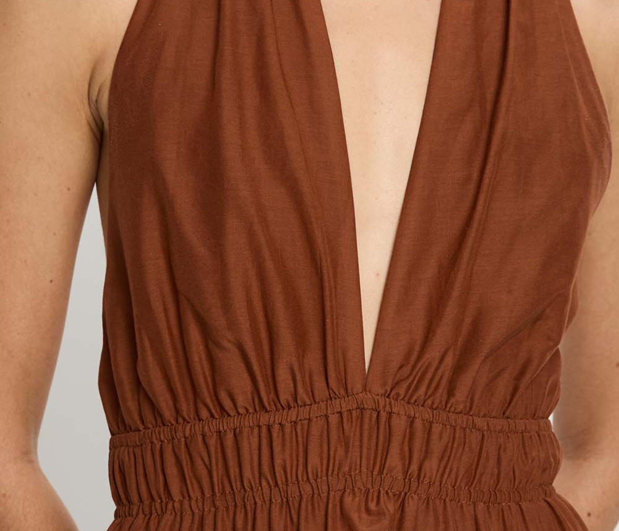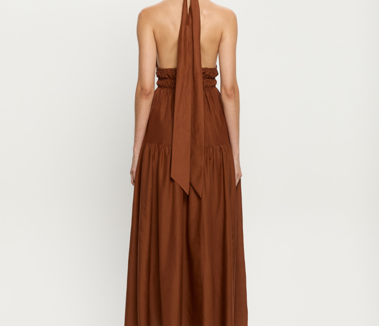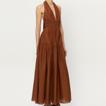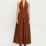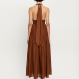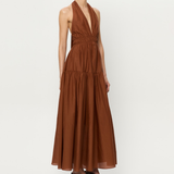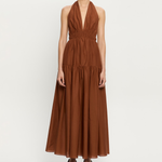 Introducing Kivari’s Anouk Maxi Dress in Mocha, a halter-neck maxi dress silhouette in a brown mocha hue. Featuring a deep V-neckline with delicate ruching across the chest, the Anouk Dress includes a supportive back loop to secure the halter tie in place. The fitted bodice gently defines the waist and falls to a softly flared A-line skirt. Perfect for warm weather days.