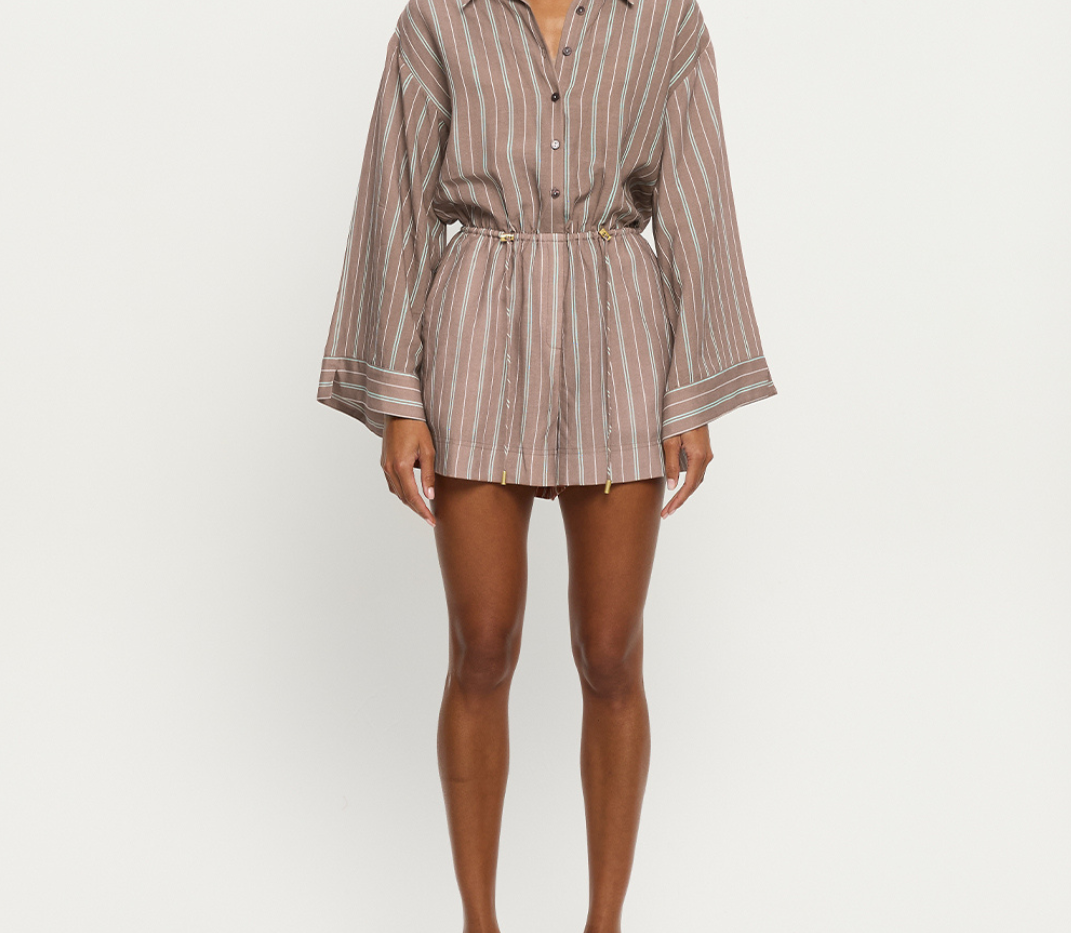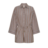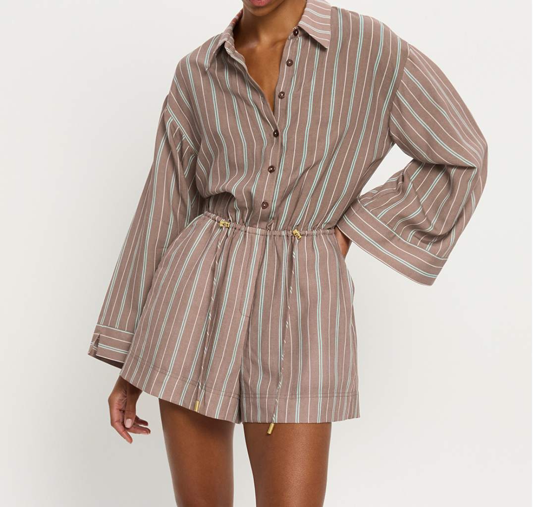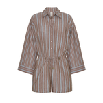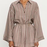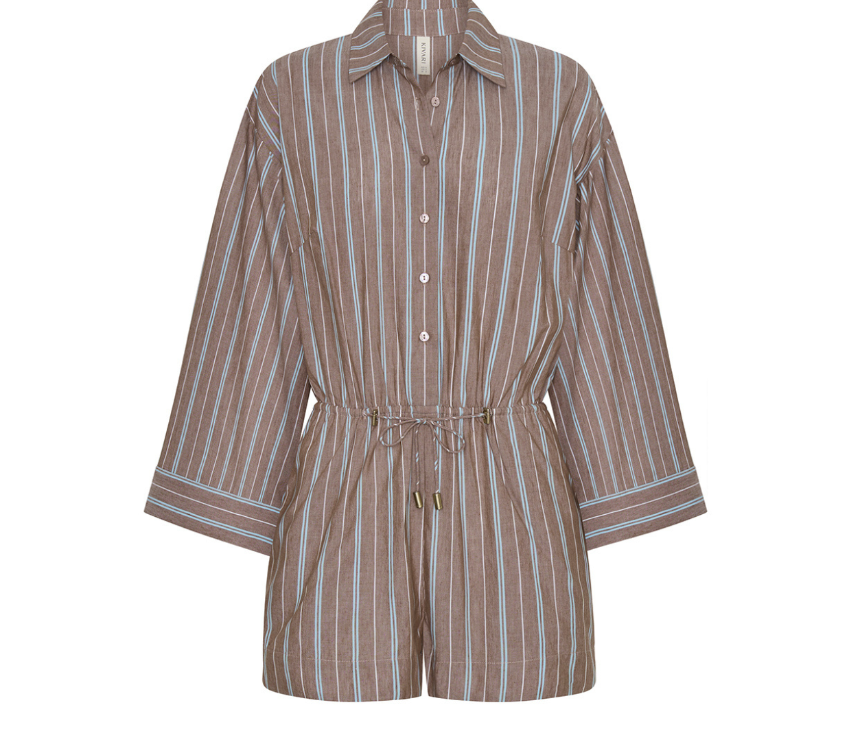 Introducing Kivari’s Bobby Playsuit in Stripe, a relaxed jumpsuit silhouette in a stripe print. Designed in soft brown and blue stripes, it features a wide short-sleeve silhouette, a collared neckline, a button-up front, and an adjustable drawstring waist with gold hardware stoppers for a flattering fit. Perfect for a warm summer day look.