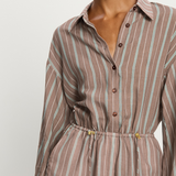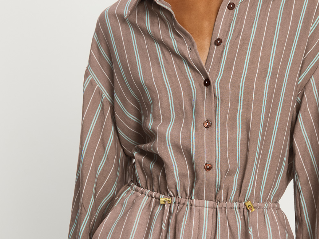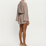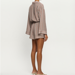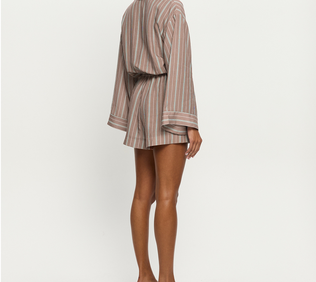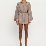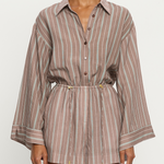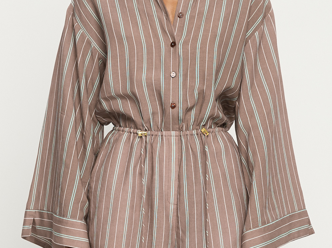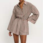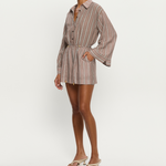 Introducing Kivari’s Bobby Playsuit in Stripe, a relaxed jumpsuit silhouette in a stripe print. Designed in soft brown and blue stripes, it features a wide short-sleeve silhouette, a collared neckline, a button-up front, and an adjustable drawstring waist with gold hardware stoppers for a flattering fit. Perfect for a warm summer day look.
