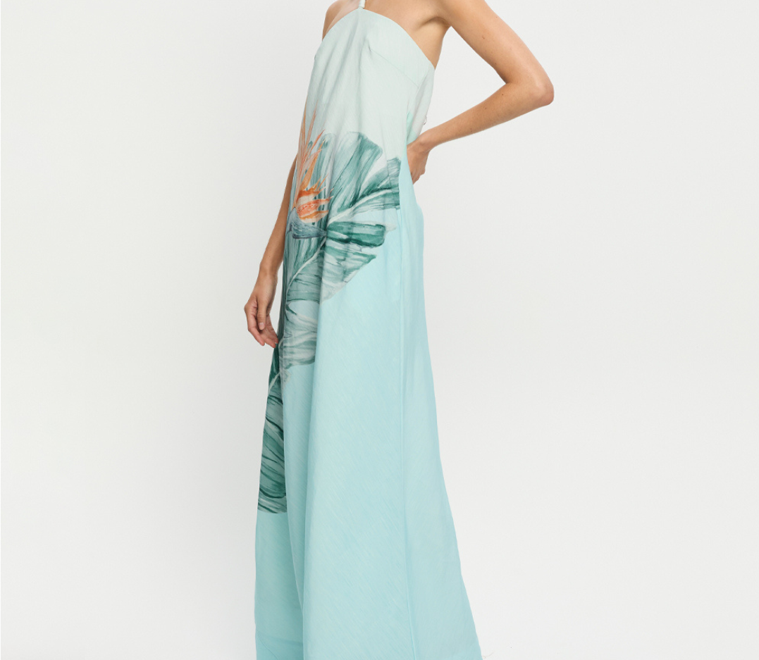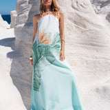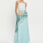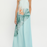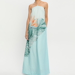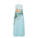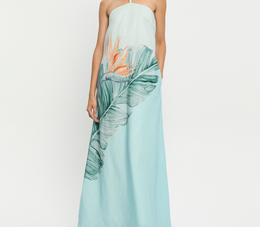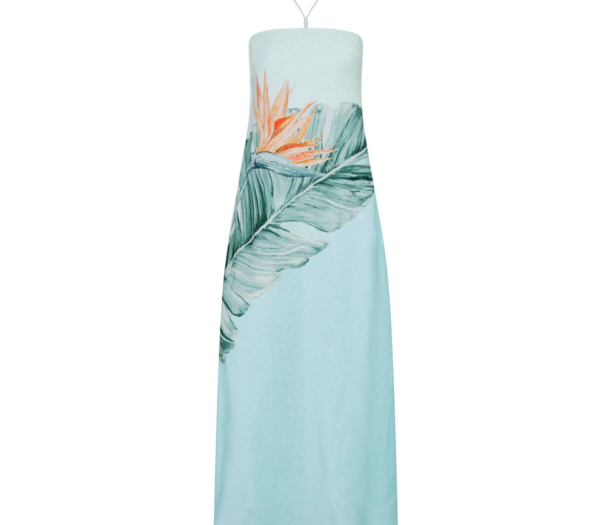 Introducing Kivari's Cassia Maxi Dress in Cassia, a maxi dress silhouette in a soft blue tropical ombré and vibrant bird of paradise motif print. Designed in a halter-neck silhouette with delicate spaghetti straps and adjustable ties, this A-line, full-length style drapes effortlessly. Finished with an invisible side zip and full lining for a smooth, effortless fit.