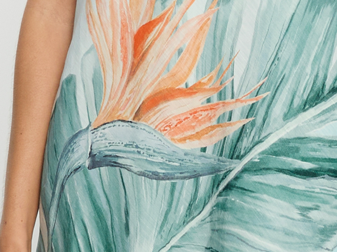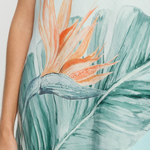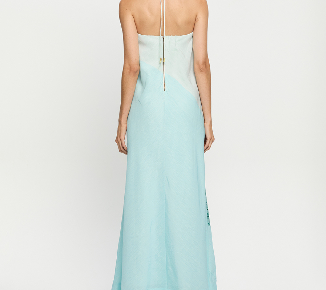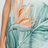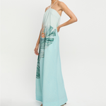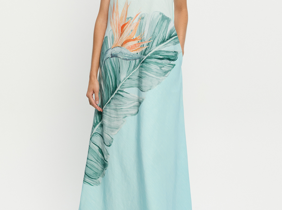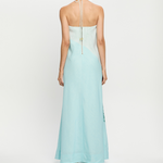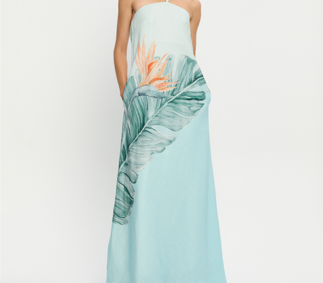 Introducing Kivari's Cassia Maxi Dress in Cassia, a maxi dress silhouette in a soft blue tropical ombré and vibrant bird of paradise motif print. Designed in a halter-neck silhouette with delicate spaghetti straps and adjustable ties, this A-line, full-length style drapes effortlessly. Finished with an invisible side zip and full lining for a smooth, effortless fit.