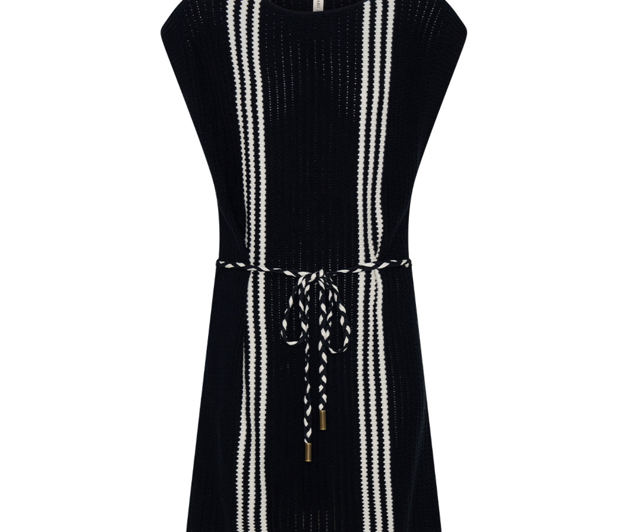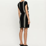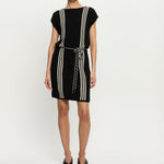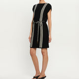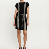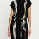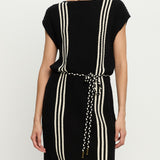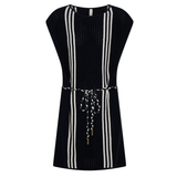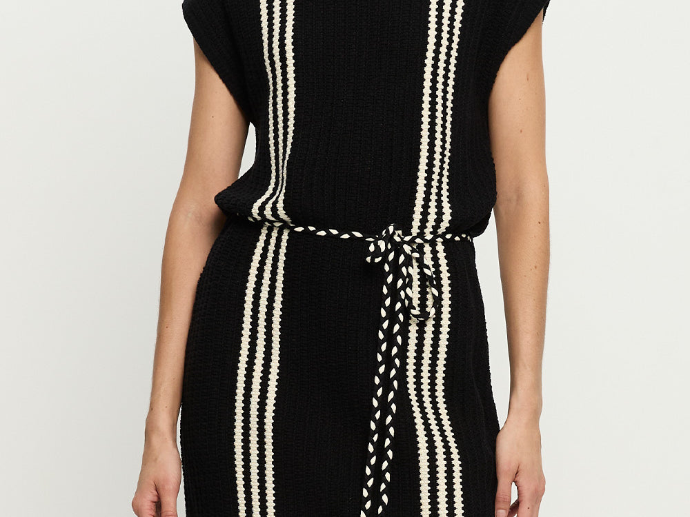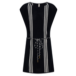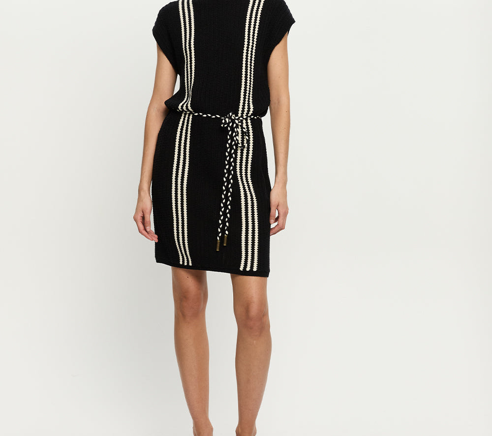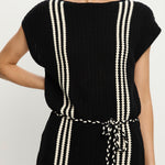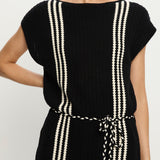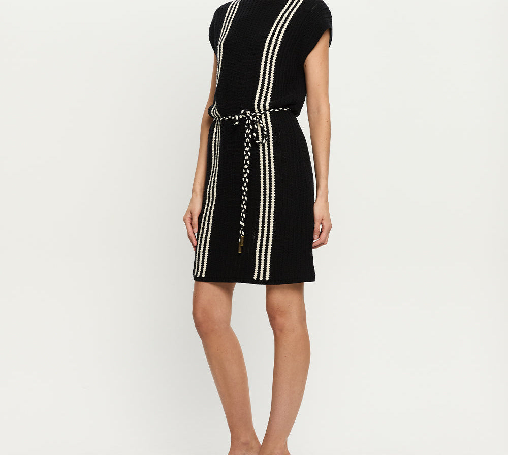 Introducing Kivari’s Corinne Knit Mini Dress in Black, a sleeveless knit mini dress in black and stripe print detailing. Designed from 100% cotton, the Corinne black knit mini dress features a relaxed, boxy silhouette with a boat neckline and vertical stripe detailing. Loops at each side hold a removable waist tie, allowing you to adjust the fit for a more defined or laid-back look. Perfect for warm days and casual weekends.