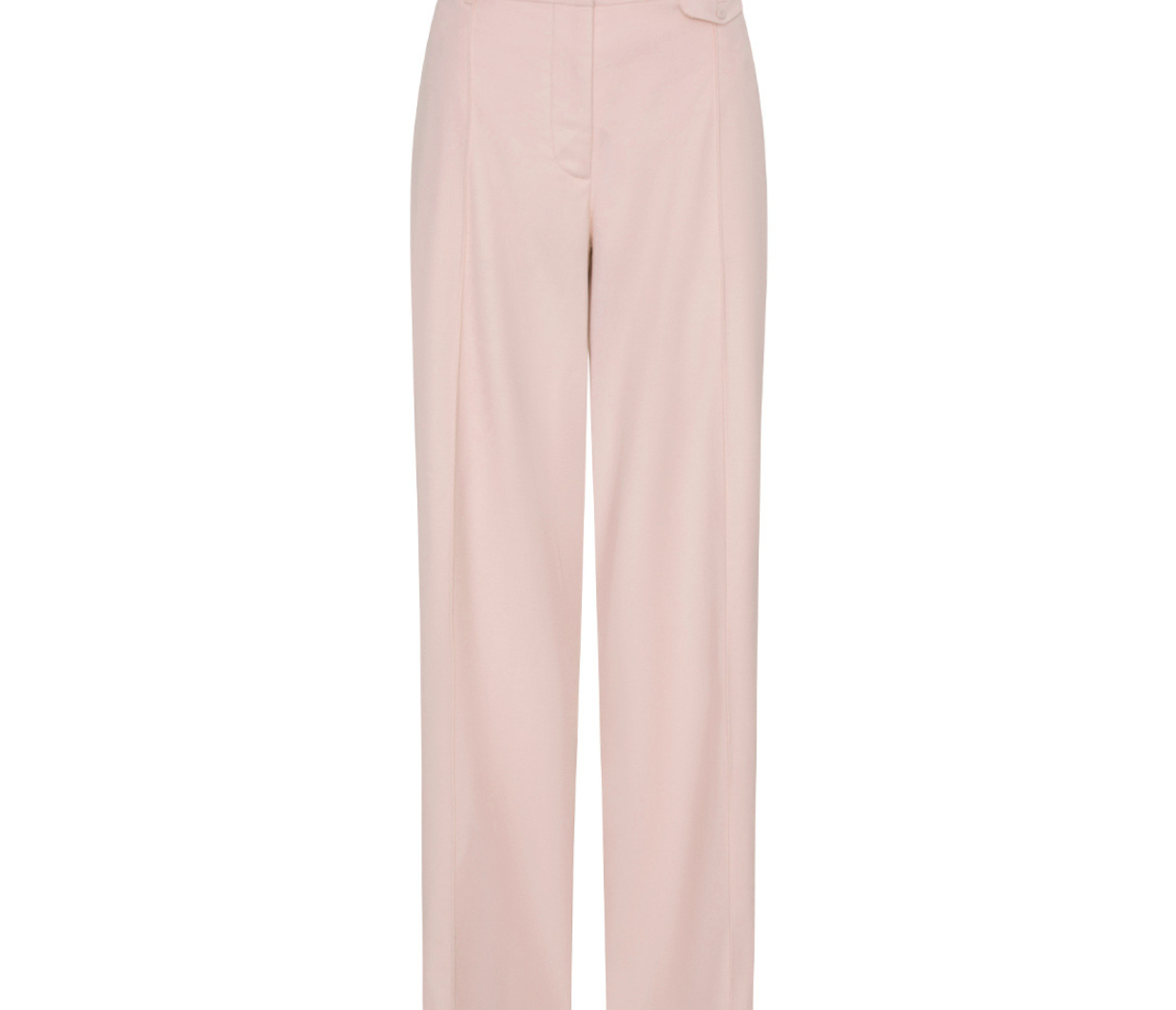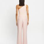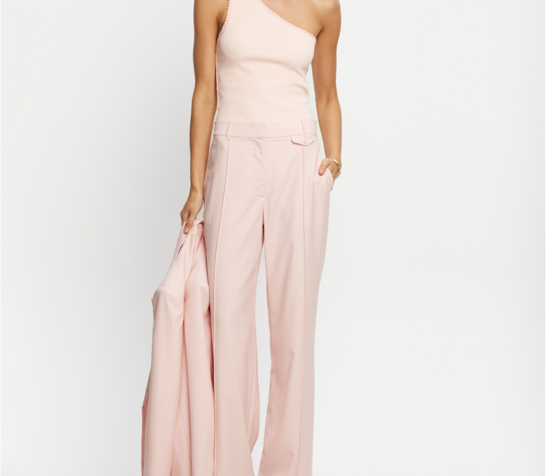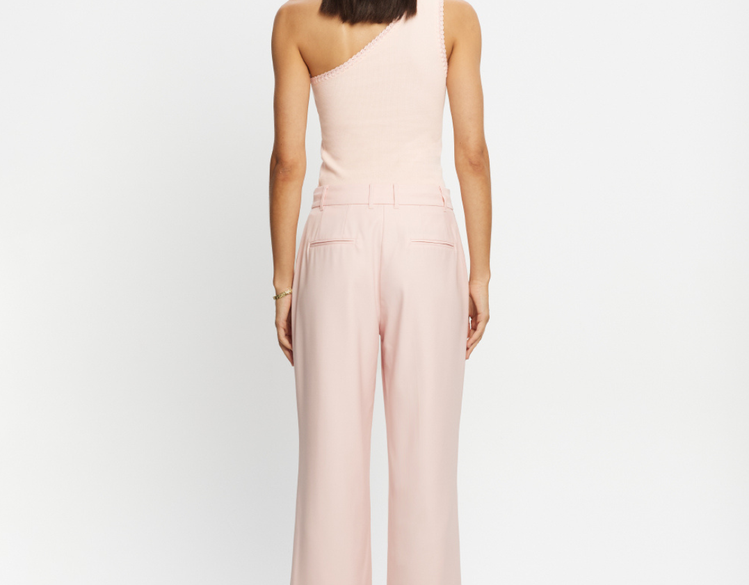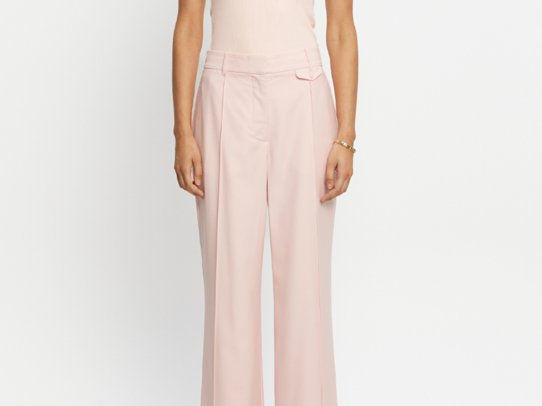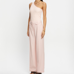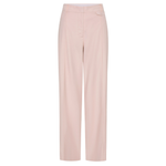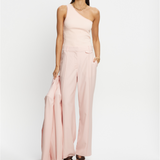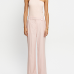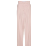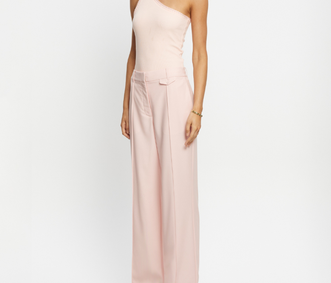 Introducing the Delany Pant in Pink, a high-waisted, tailored, straight-leg pant silhouette in a soft pink hue. The high-waisted suit pant features belt loops, side seam pockets, and back welt pockets for refined functionality. Fully lined for comfort, it includes subtle flat detailing on the left side to enhance its clean, structured profile. A timeless wardrobe staple for elevated dressing.