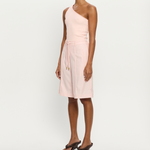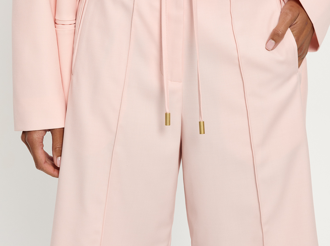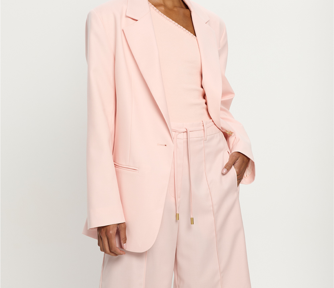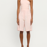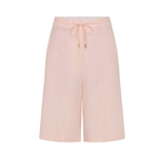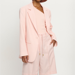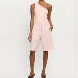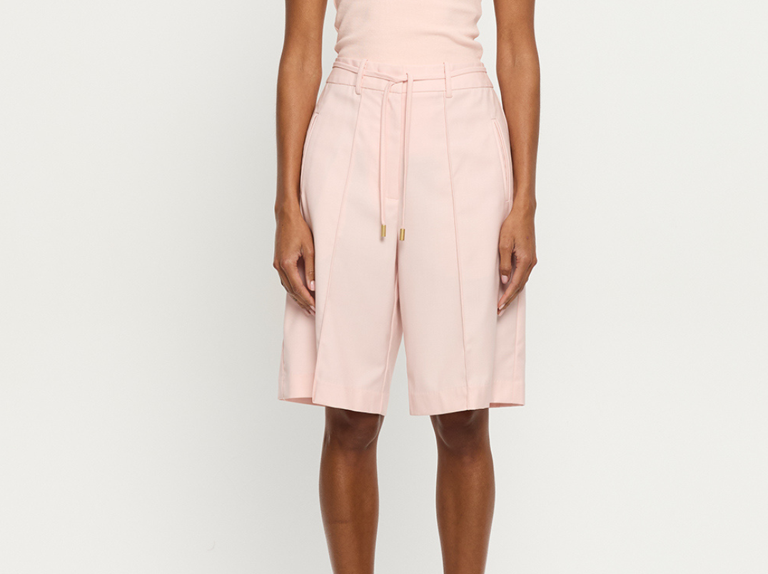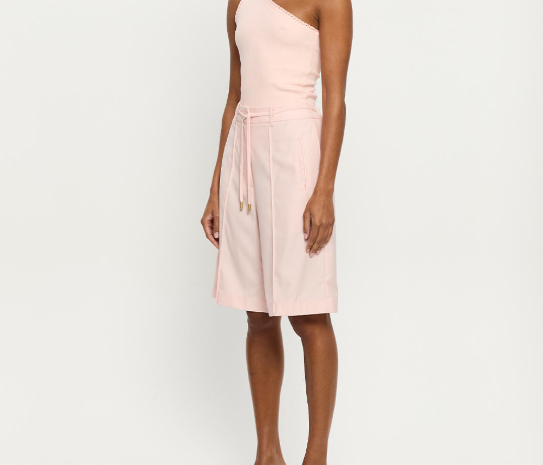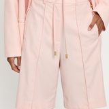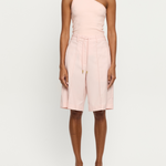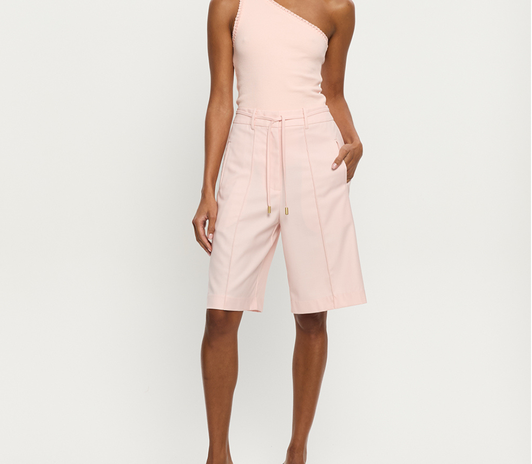 Introducing the Delany Short in Pink, a relaxed Bermuda tailored short in a soft pink hue. Designed with front and back pintuck detailing, offset side pockets, and welt pockets at the back for elevated functionality. Complete with belt loops, a coordinating thin belt with gold hardware, and subtle under-loops for secure styling. Pair effortlessly with the matching blazer for a contemporary tailored set.