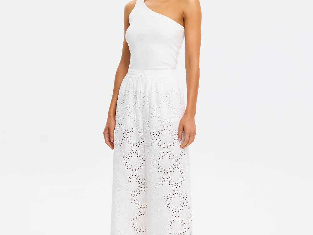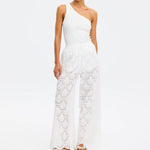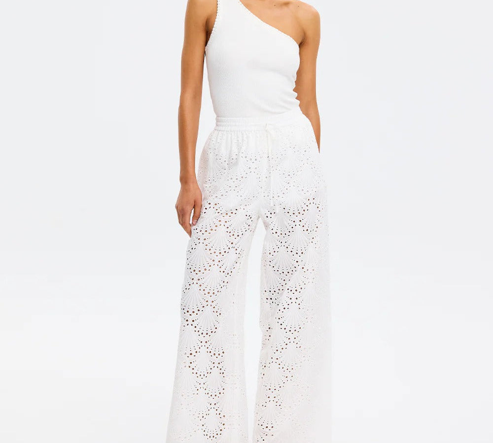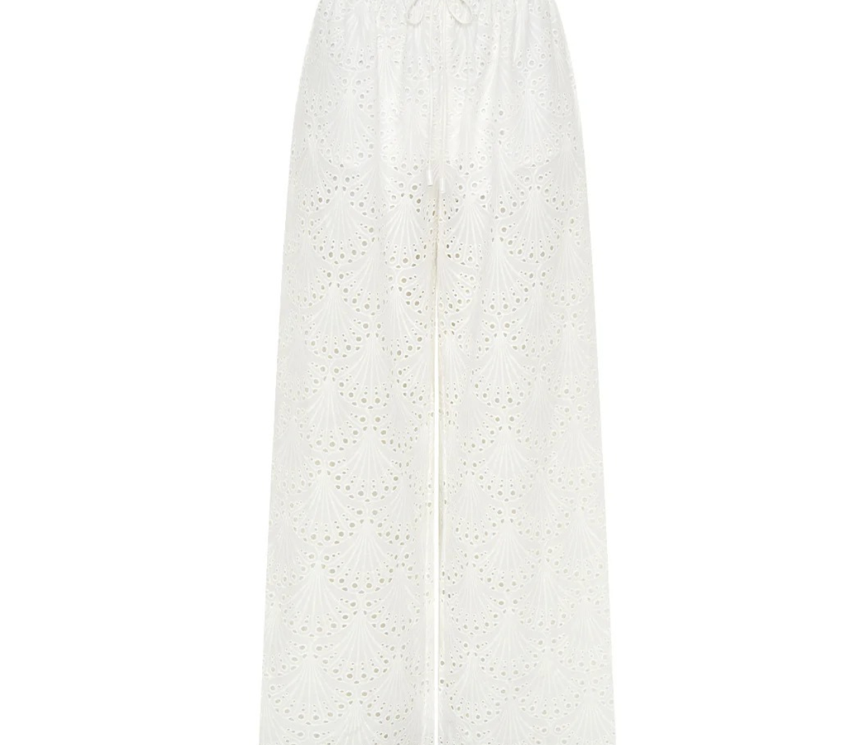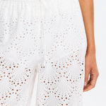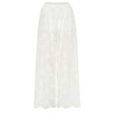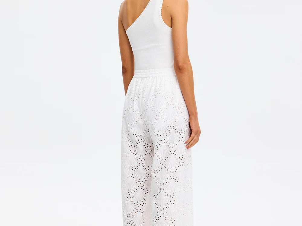 Introducing Kivari's Elodie Pant in Ivory, a relaxed crochet pant silhouette in ivory white. The Elodie Pants is crafted in a shell design broderie with a classic straight leg featuring an elasticated waist complete an adjustable drawcord with signature cord ends. Pair with the matching Elodie Top for a coordinated set, or style with a simple tank for an effortless look.