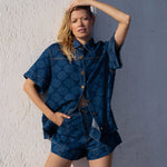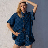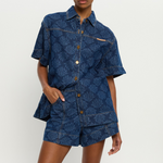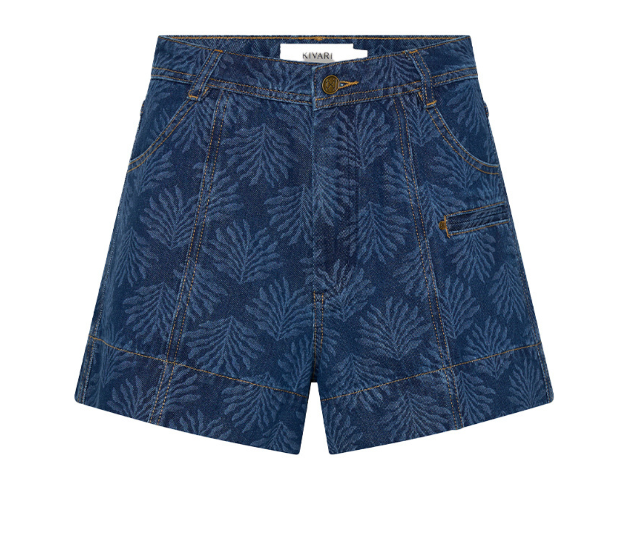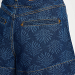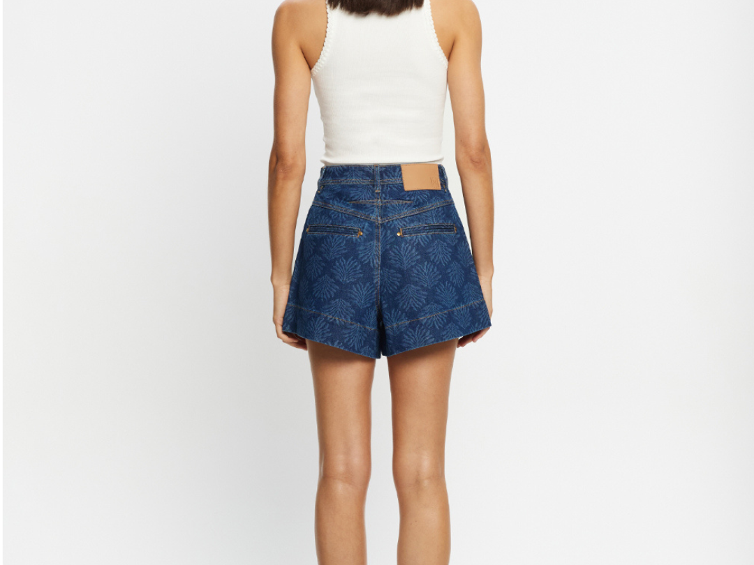 Introducing Kivari’s Evita Denim Short in Iluka, a high-waisted, relaxed denim short. Designed with a tonal leaf print design, these denim shorts are detailed with functional side pockets, jetted pocket accents, and signature gold hardware. Perfect for everyday warm-weather essentials.
