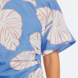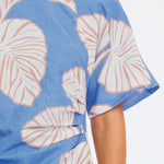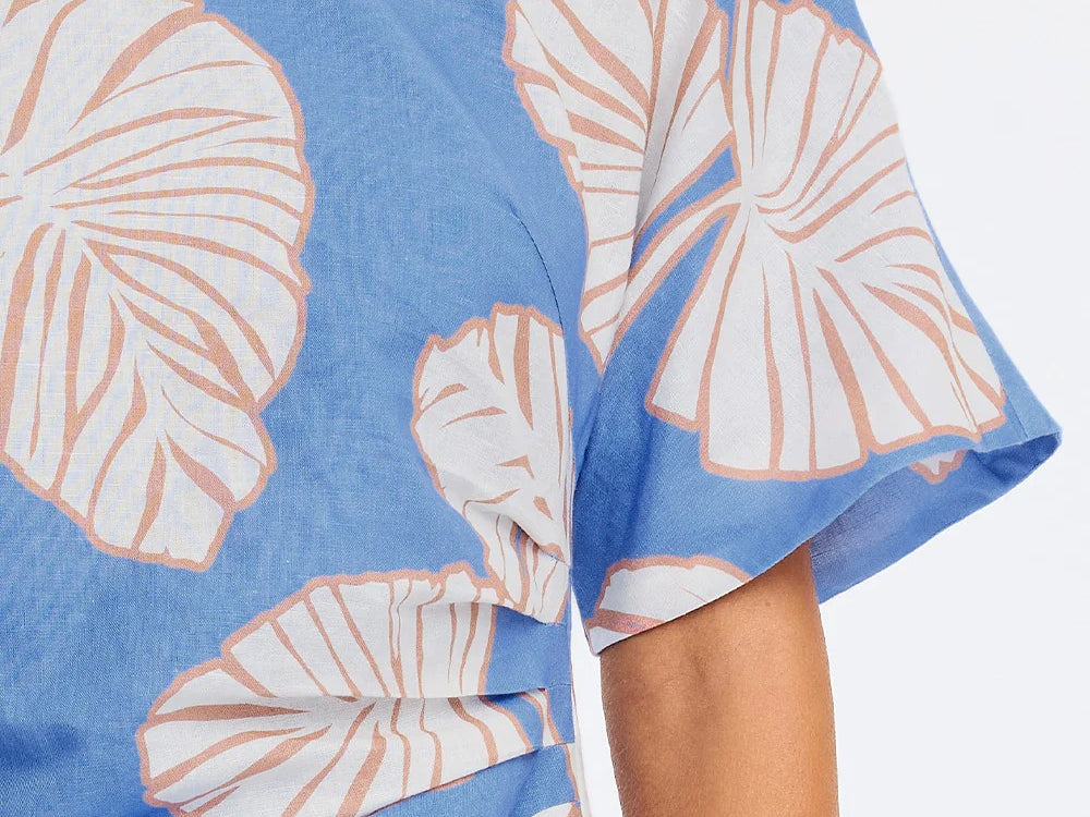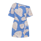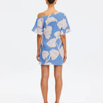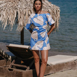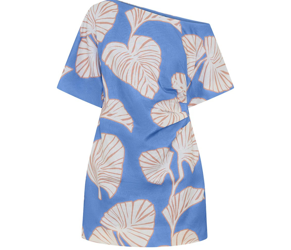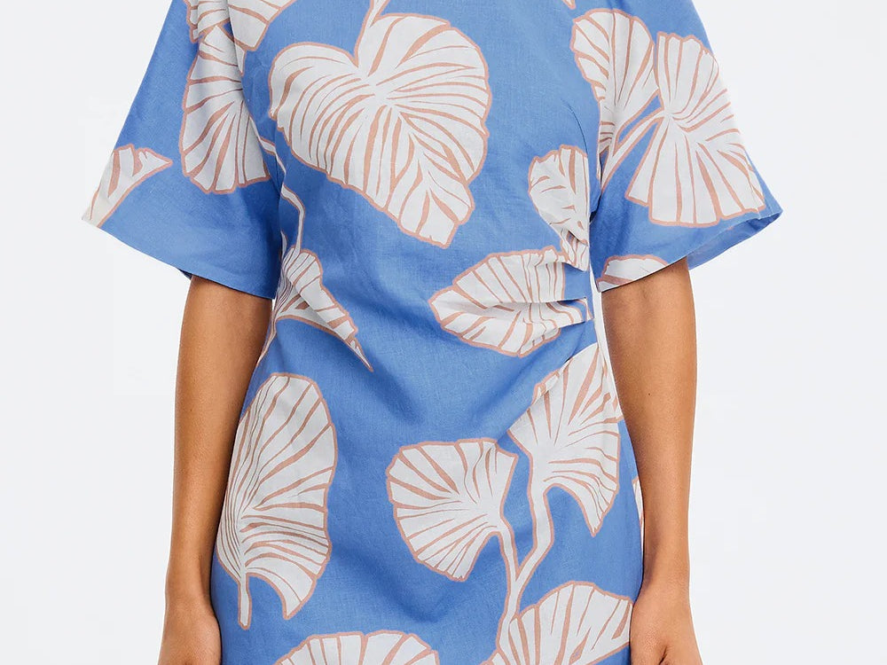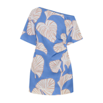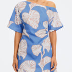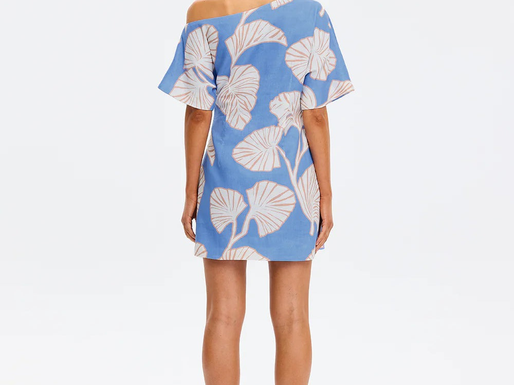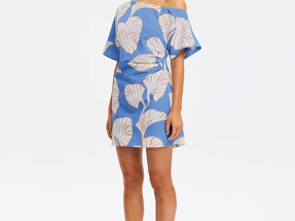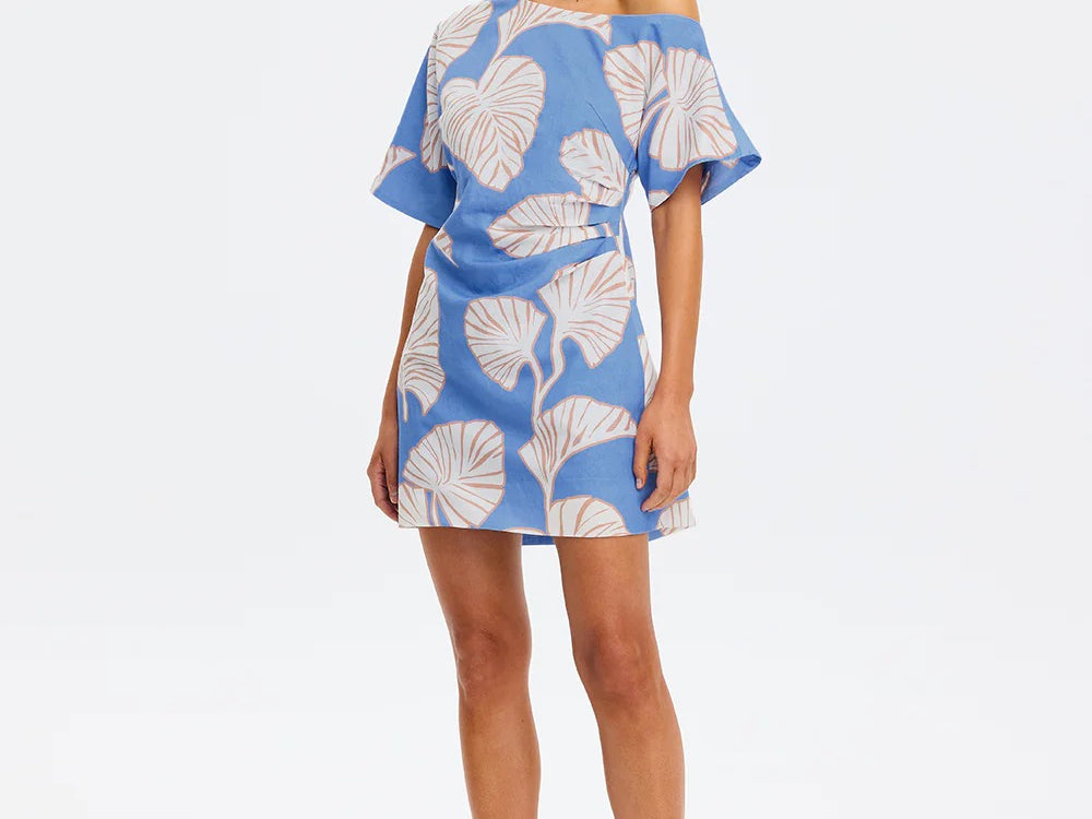 Introducing Kivari's Ilana Off Shoulder Mini Dress in Blue Ivory, an off-shoulder mini-length dress silhouette in ivory and blush leaf motifs on a bold sky blue base. The Ilana Off Shoulder Mini Dress features a flattering asymmetrical neckline, a subtle A-line skirt, and tuck detailing at the waist, finished with an invisible side zip. Perfect for long lunches, daytime celebrations, or summer evenings by the water.
