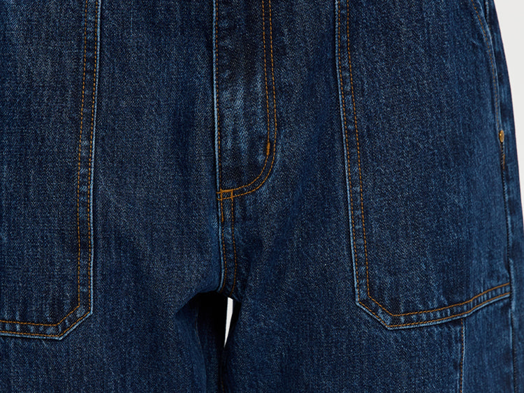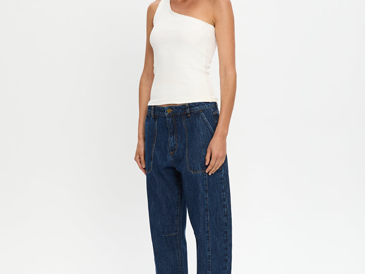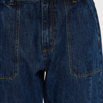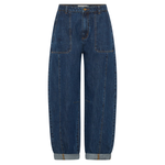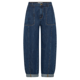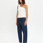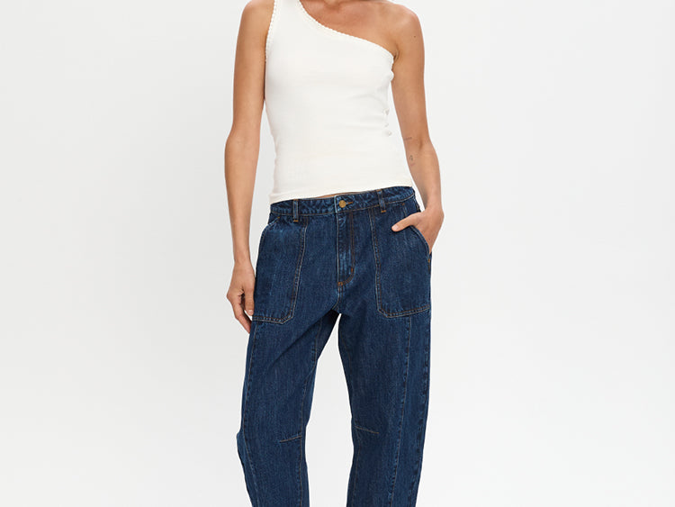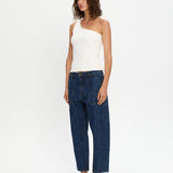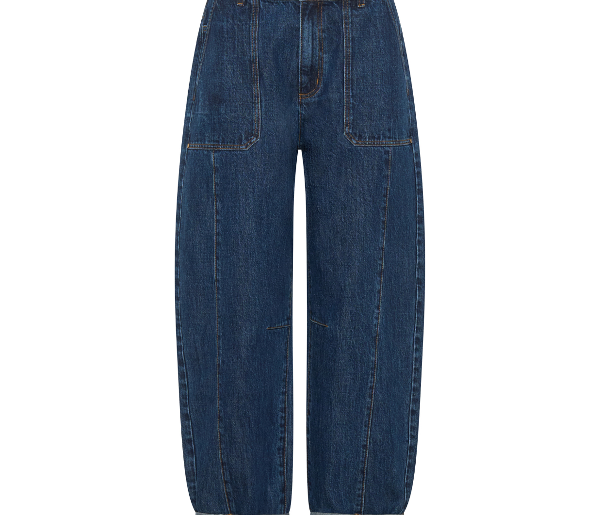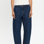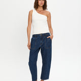 Introducing Kivari's Jessica Cropped Barrel Jean in Dark Stonewash, a barrel-leg denim pant silhouette. Designed in a relaxed silhouette featuring bronze hardware, tonal panel stitching, and a clean hem finished with back patches.