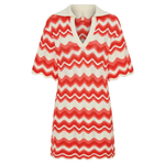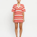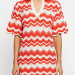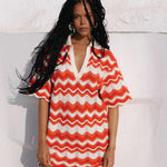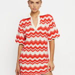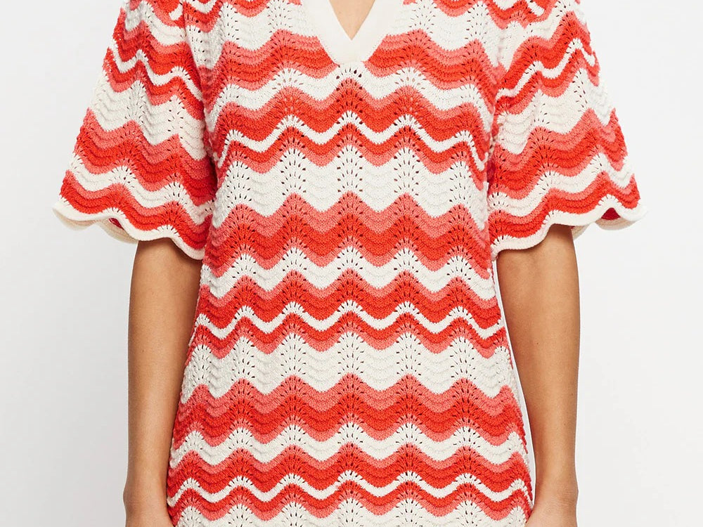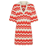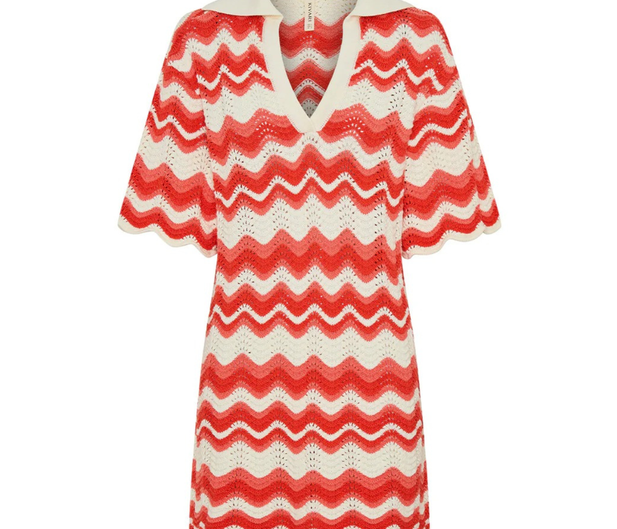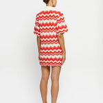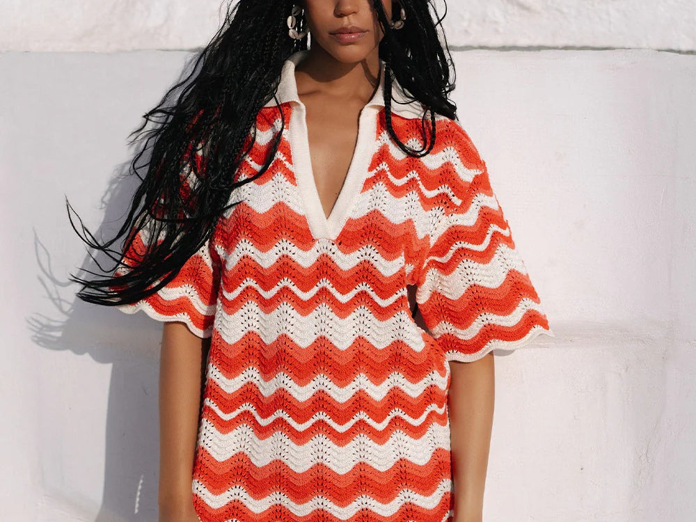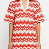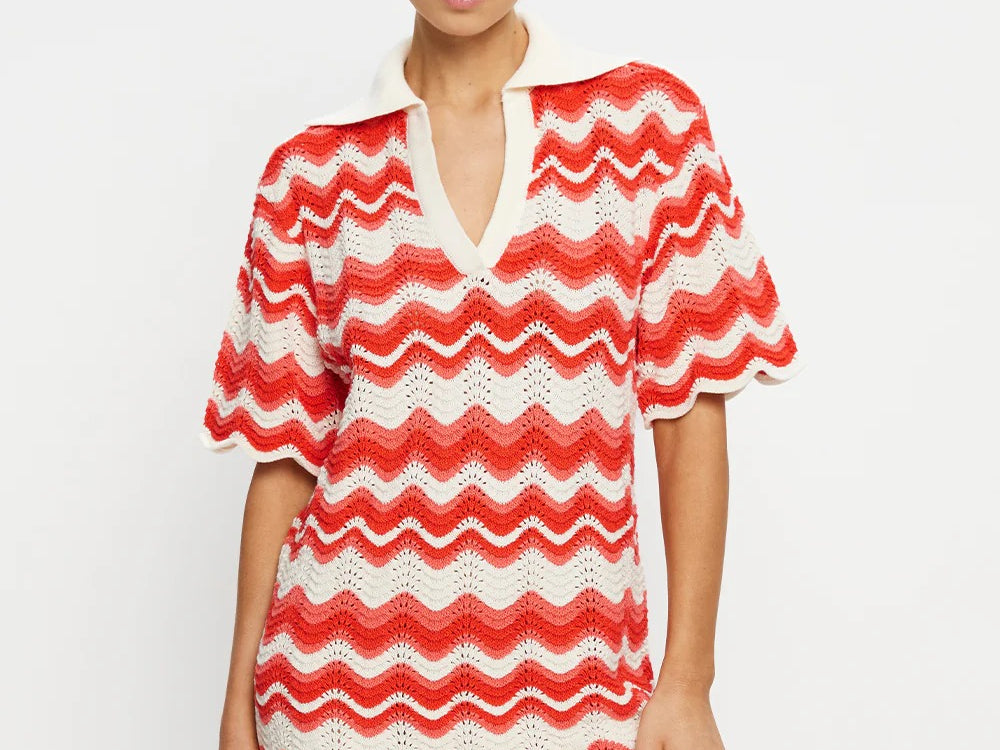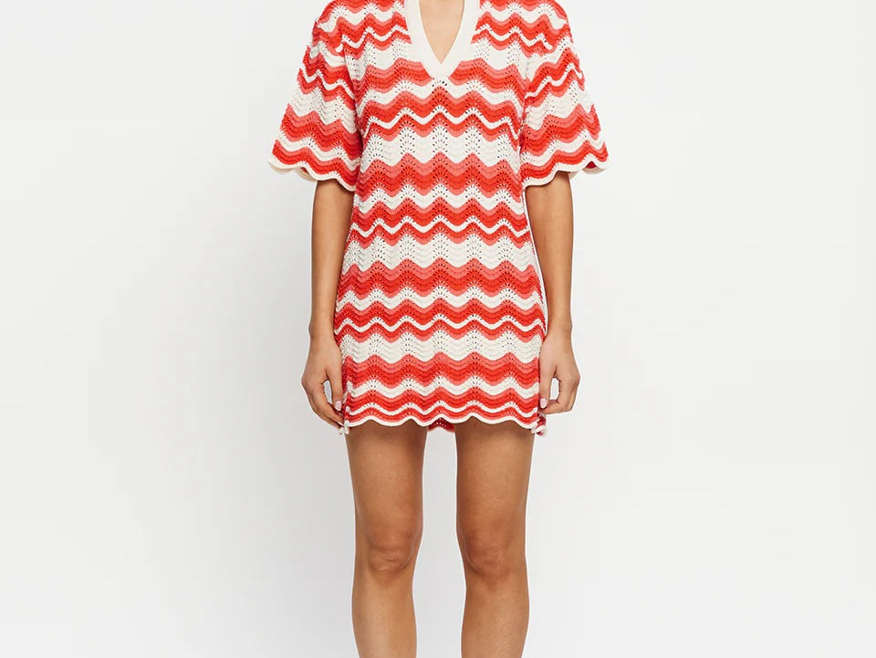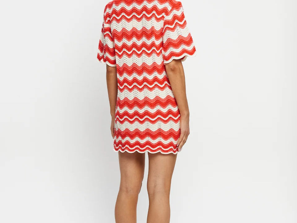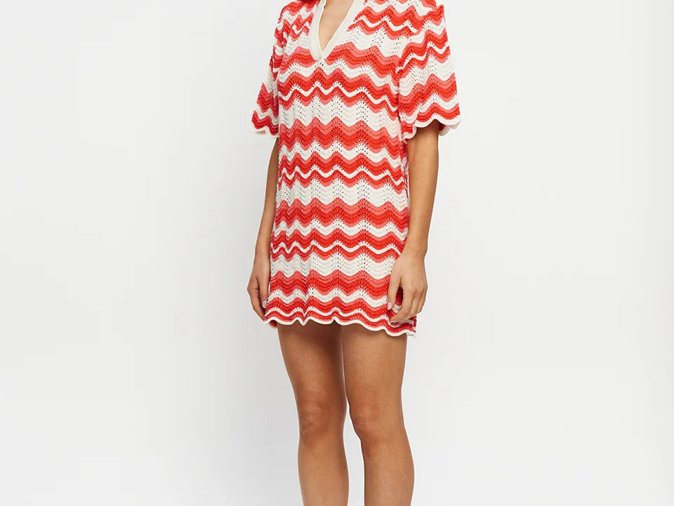 Introducing Kivari's Leighton Mini Dress, a knitted mini dress silhouette in coral red. The Leighton mini dress is crafted from an intricate wave-knit stitch in a relaxed silhouette and features a ribbed collar and scalloped edging at the hem and sleeves. Pair with sandals for relaxed daytime plans and coastal escapes.