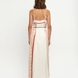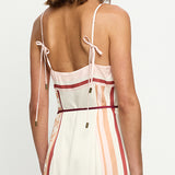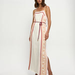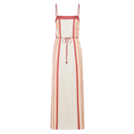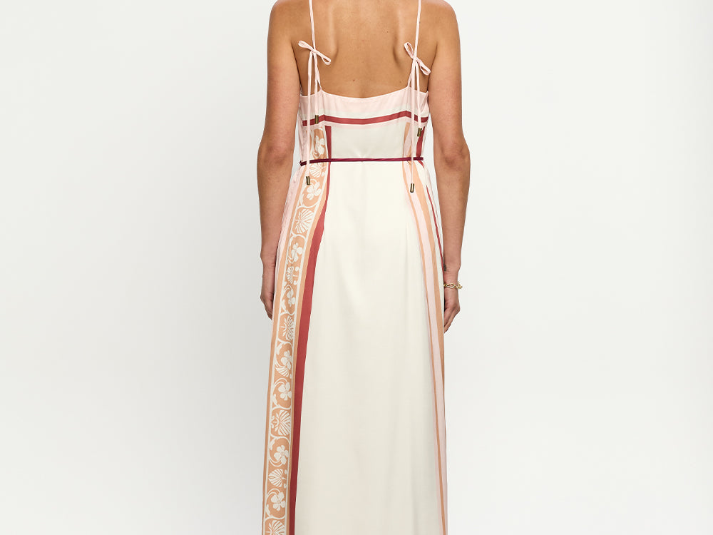 Introducing Kivari's Lilia Maxi Dress in Pink Brown, a relaxed maxi dress silhouette with pink-tone stripes and floral motifs set against an ivory canvas. The maxi dress is an A-line silhouette with a straight neckline featuring spaghetti-thin tie straps and a waist tie. Perfect for coastal escapes and relaxed evening occasions.