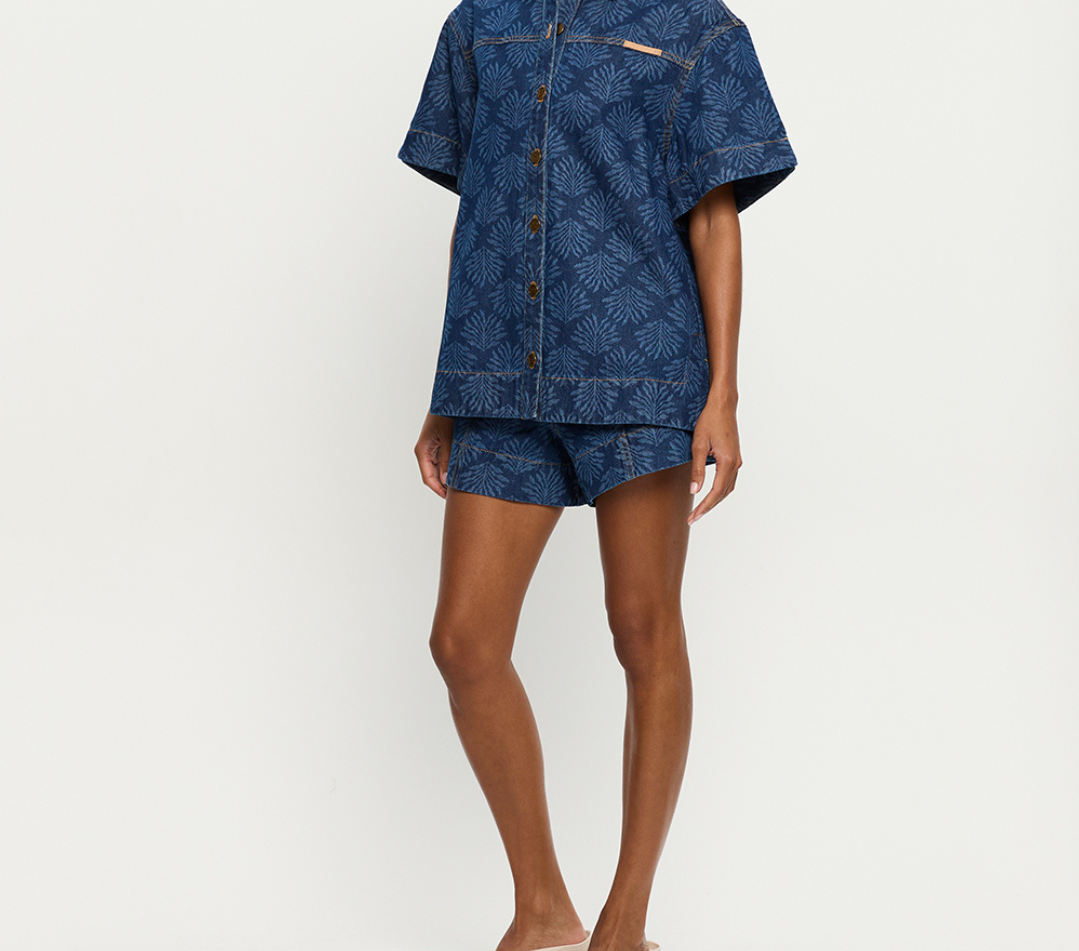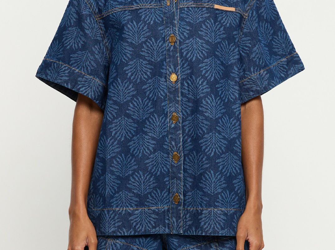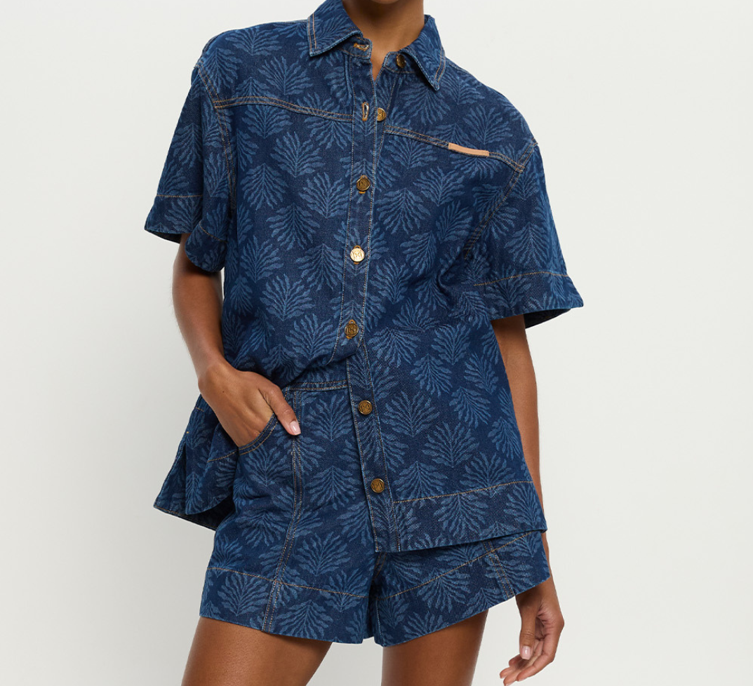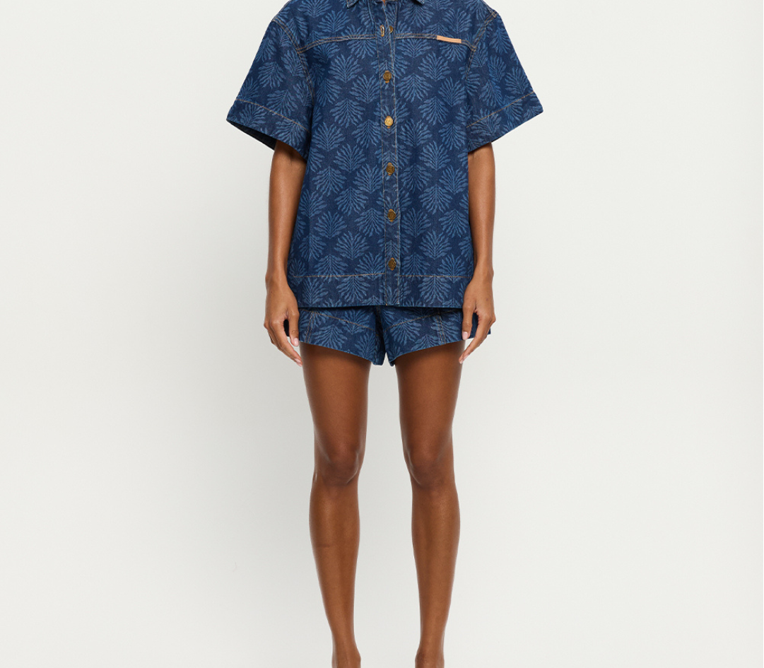 Introducing Kivari's Marla Denim Shirt in Iluka, an oversized boxy denim shirt silhouette. Designed in a tonal leaf print, this short-sleeve denim shirt features a button-through front, signature brass hardware, and a leather logo patch. A perfect summer essential, wear it with the Evita Denim shorts for a coordinated look.