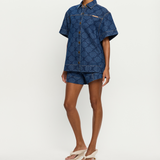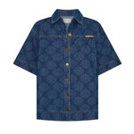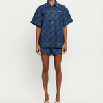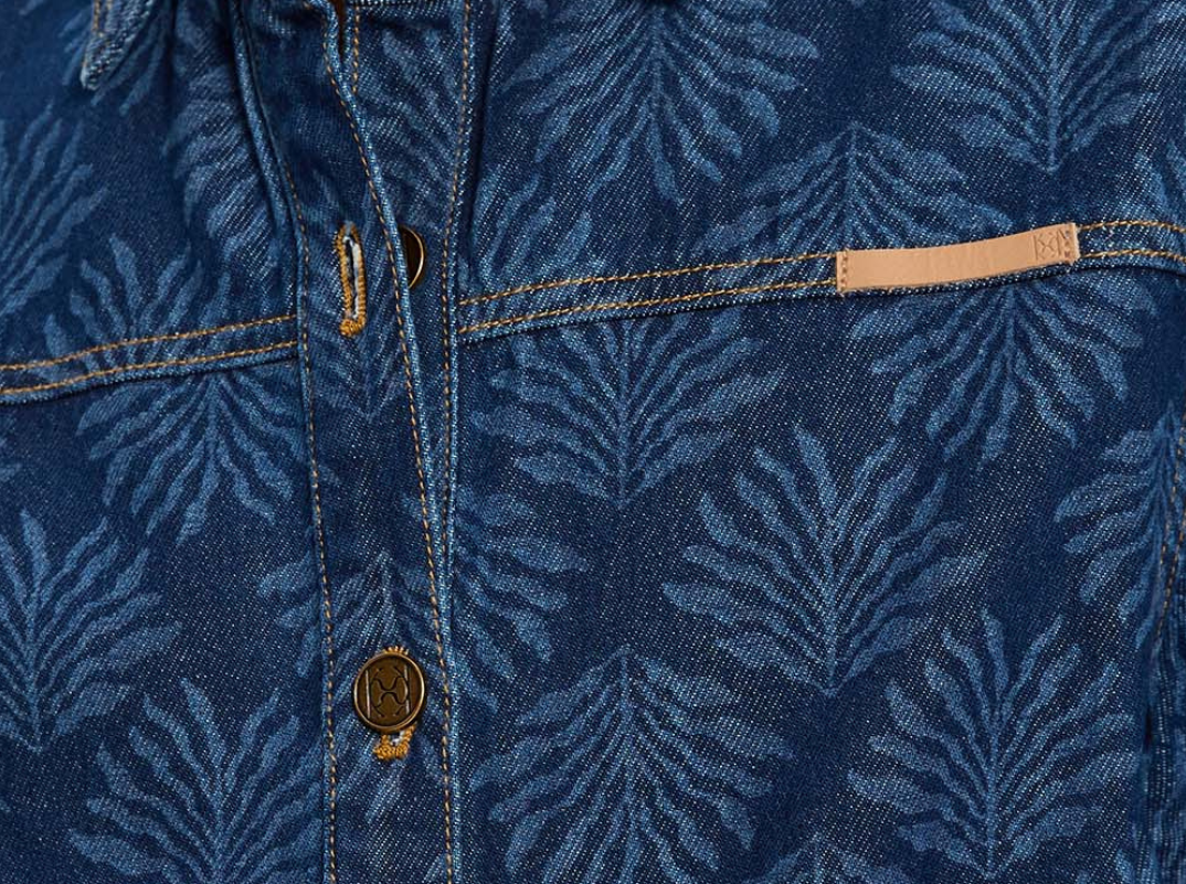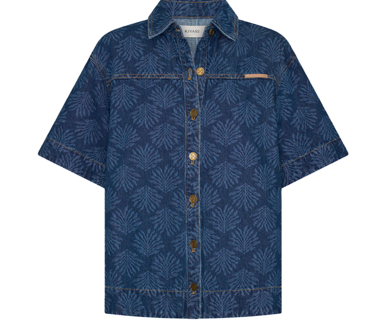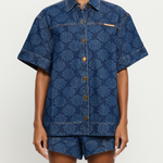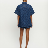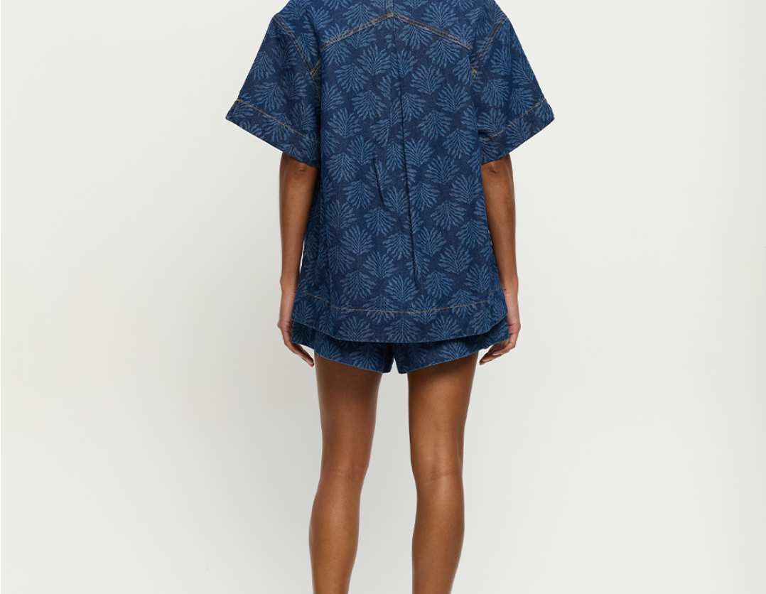 Introducing Kivari's Marla Denim Shirt in Iluka, an oversized boxy denim shirt silhouette. Designed in a tonal leaf print, this short-sleeve denim shirt features a button-through front, signature brass hardware, and a leather logo patch. A perfect summer essential, wear it with the Evita Denim shorts for a coordinated look.