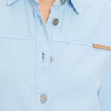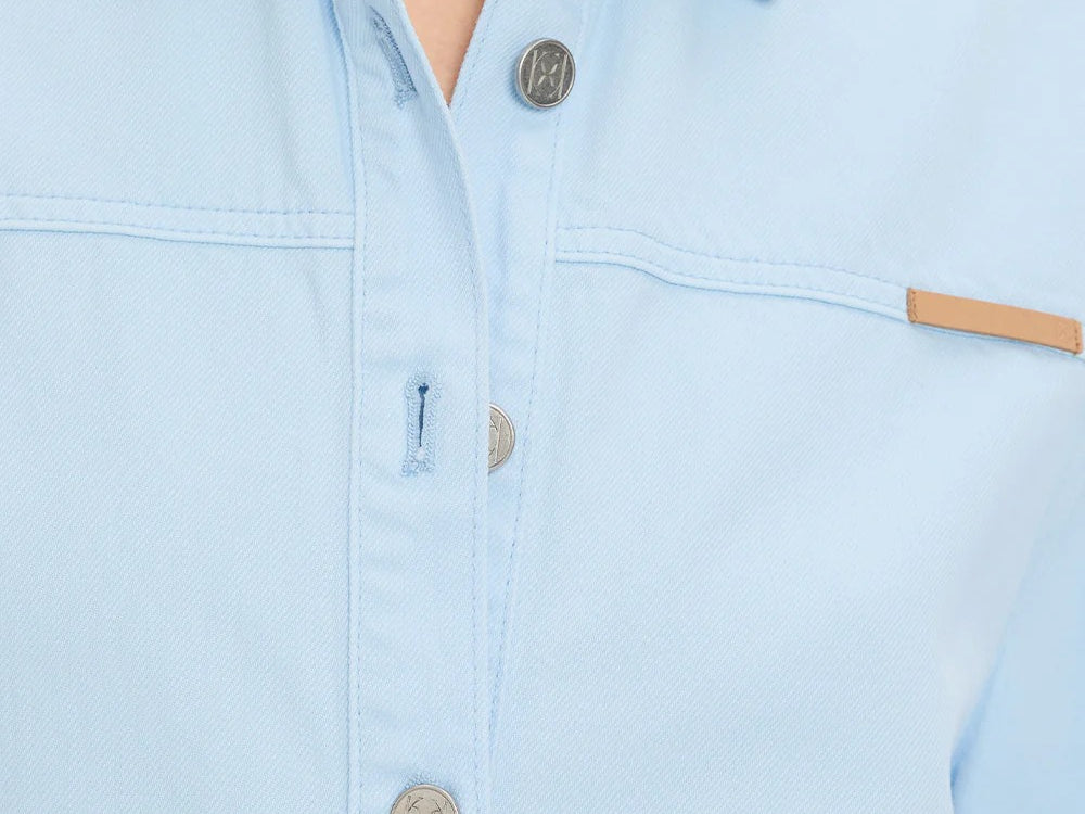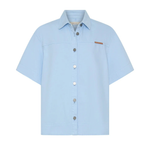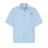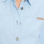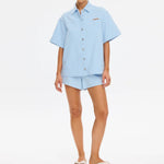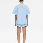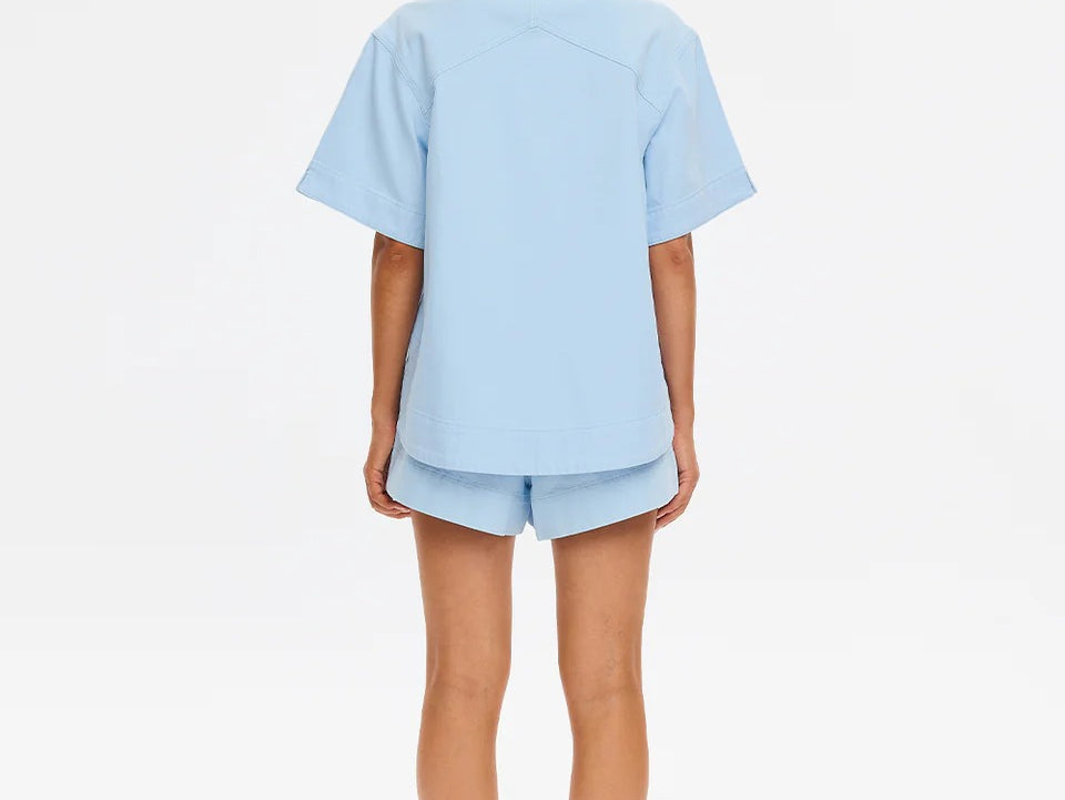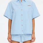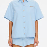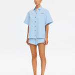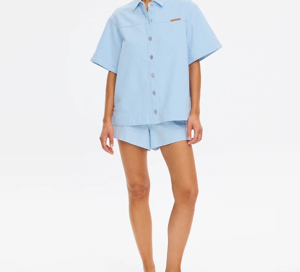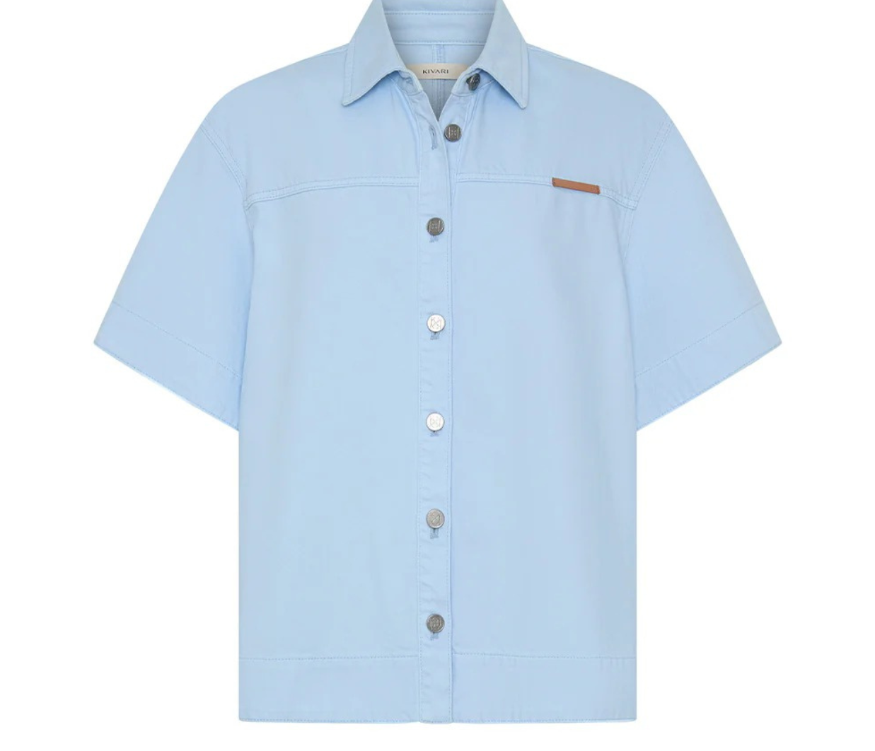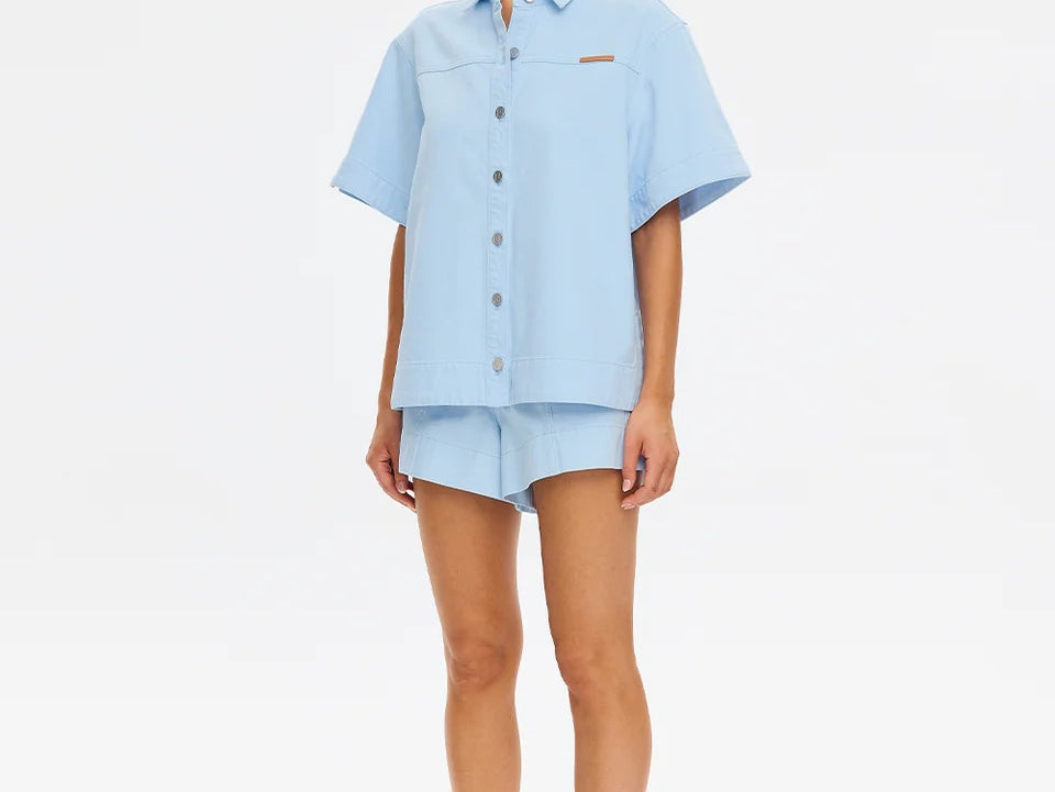 Introducing Kivari's Marla Denim Shirt in Sky, an oversized boxy denim shirt in sky blue. THe Marla Denim Shirt is designed with short sleeves and a button-through front complete with signature brass hardware; this top offers a considered contrast to its relaxed form. Laid-back in shape, elevated in detail the Marla is designed to be worn on repeat, solo or styled as a set.