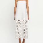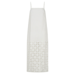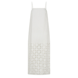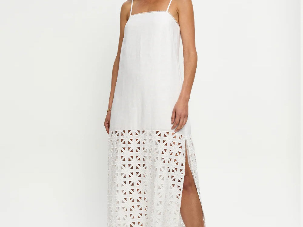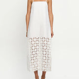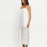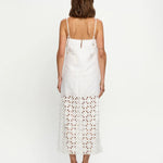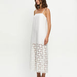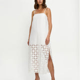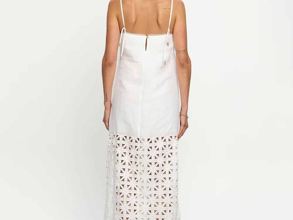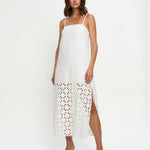 Introducing Kivari's Marley Midi Dress in Ivory, a relaxed midi dress silhouette in white ivory. Designed with a straight neckline, adjustable back ties, embroidery panel detailing, complete with a side split for ease of movement. Style with sandals for relaxed daytime wear, or elevate with heels for long lunches.