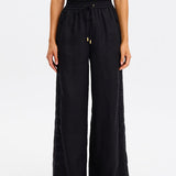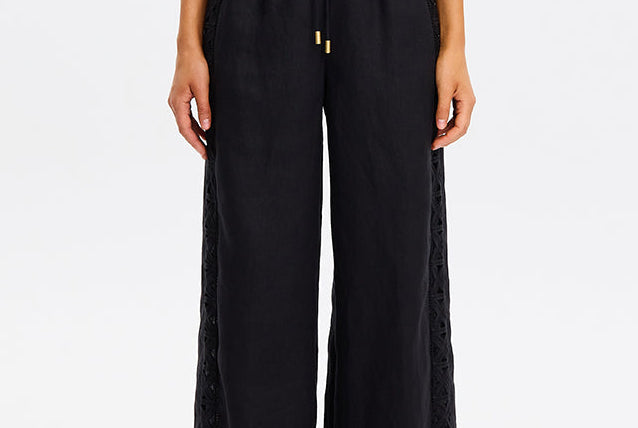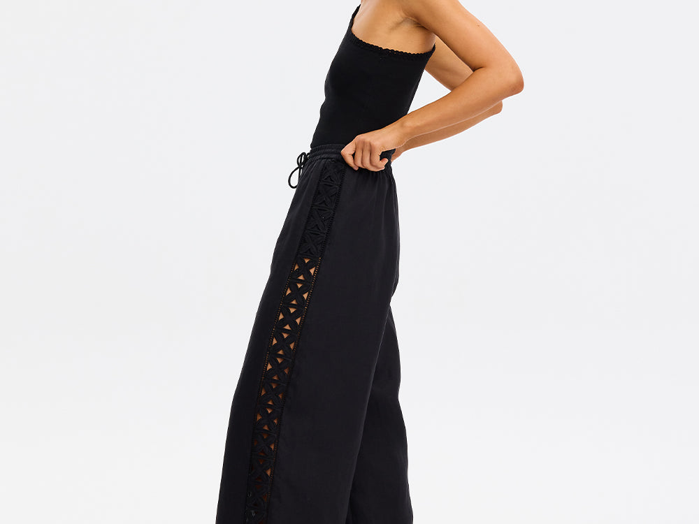 Introducing Kivari's Marley Pant in Black, a relaxed straight pant silhouette in a black hue. The Marley pant features an embroidered detail down the side panels with an elastic waist and is finished with a drawcord. Pair it with the matching Marley Shirt for a coordinated look.