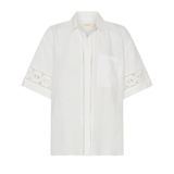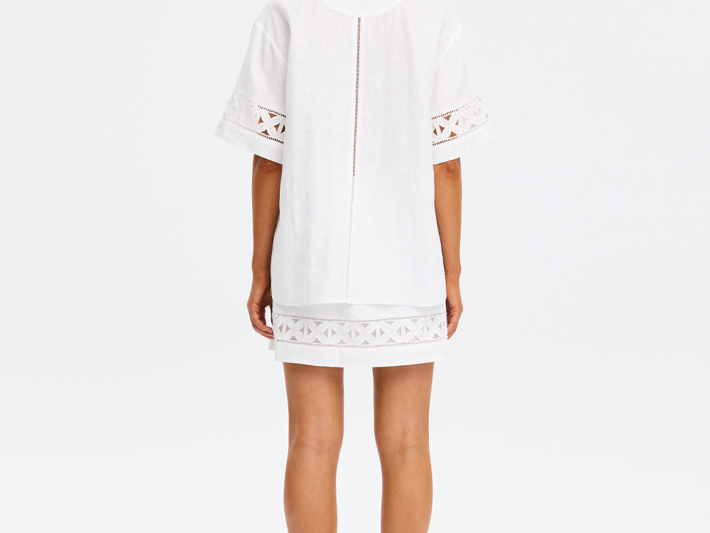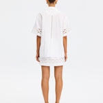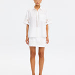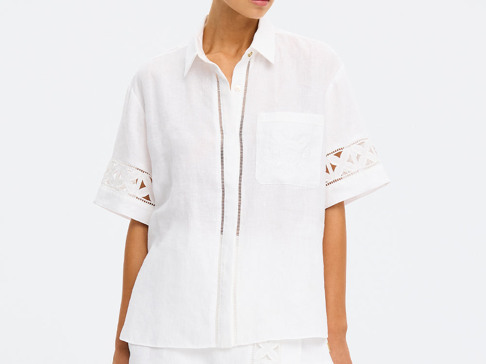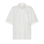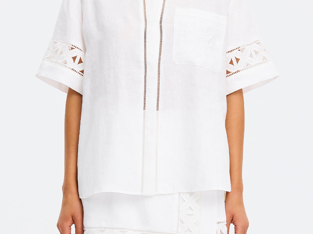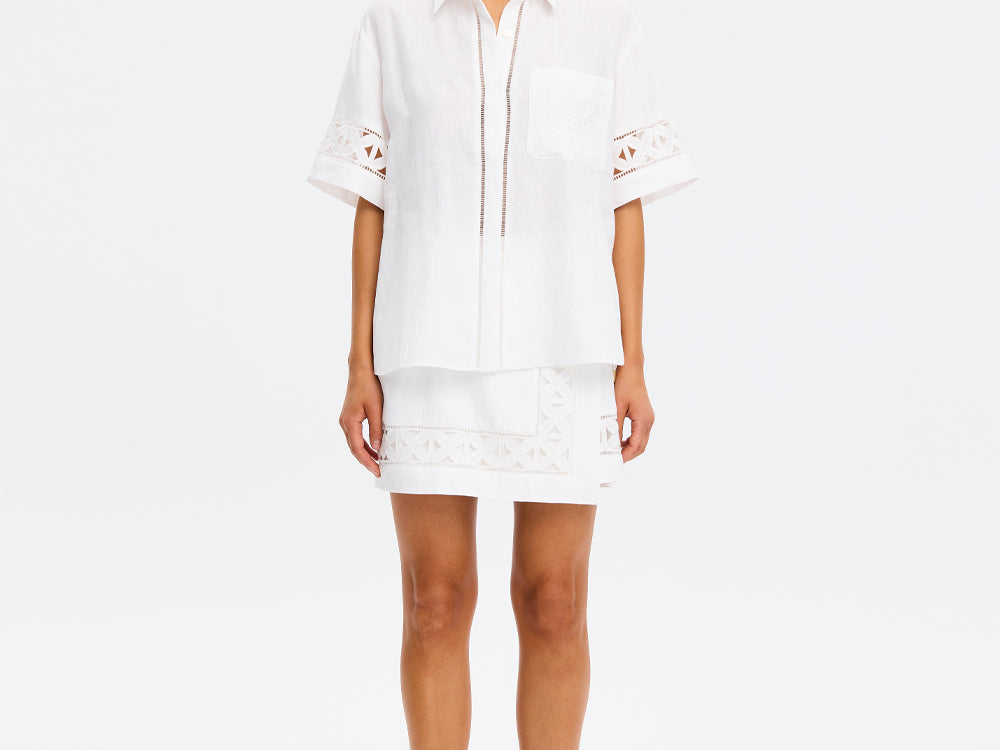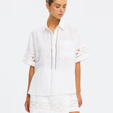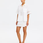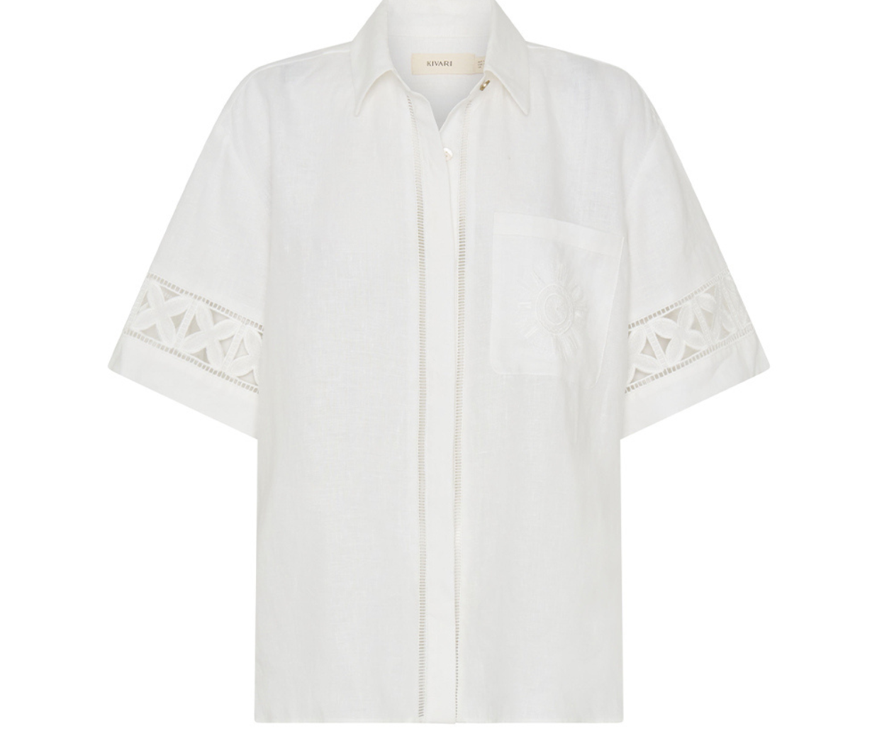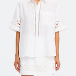 Introducing Kivari's Marley Shirt in Ivory, an oversized short-sleeve shirt silhouette in a white ivory hue. The Marley features a concealed button-through front, short sleeves with embroidery detailing, and a patch pocket complete with floral embroidery. Style with the matching Marley Skirt for a coordinated look, or pair with denim shorts for effortless daytime dressing.