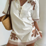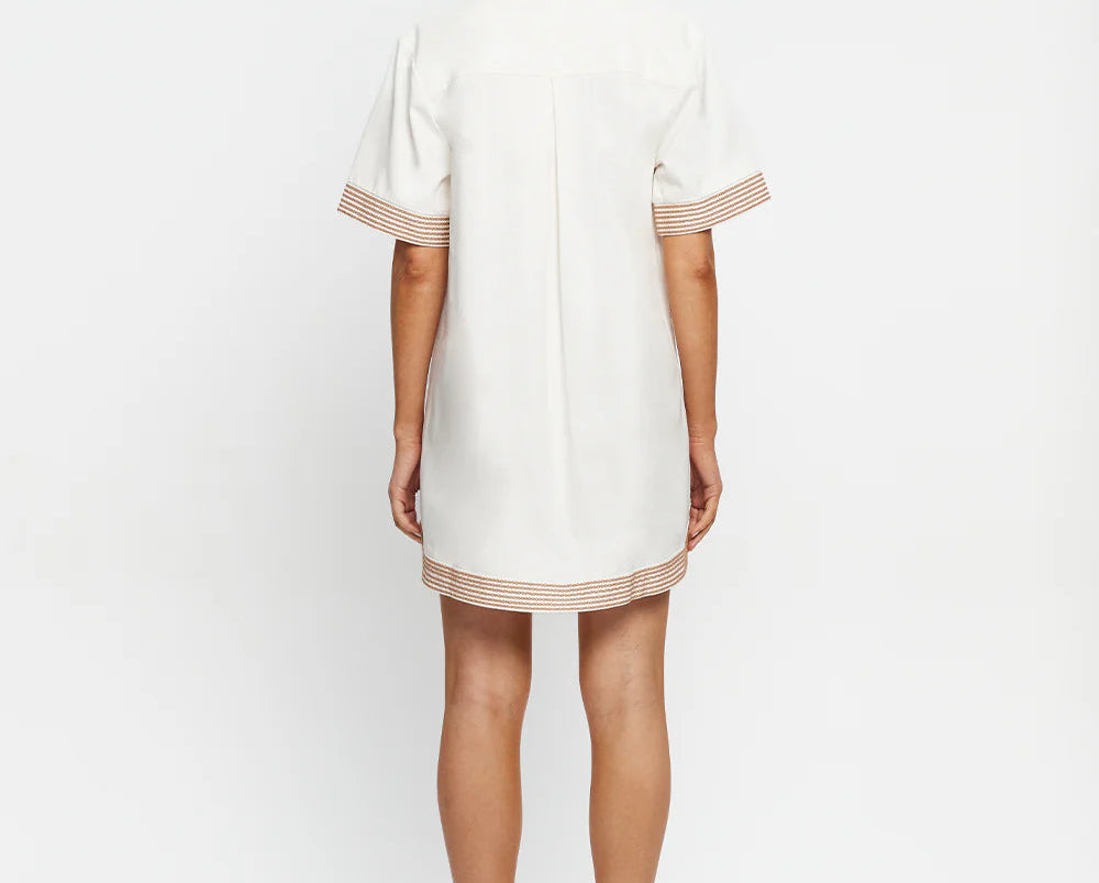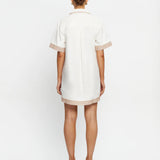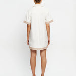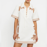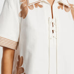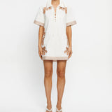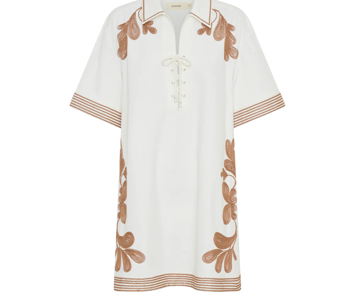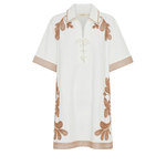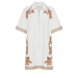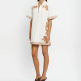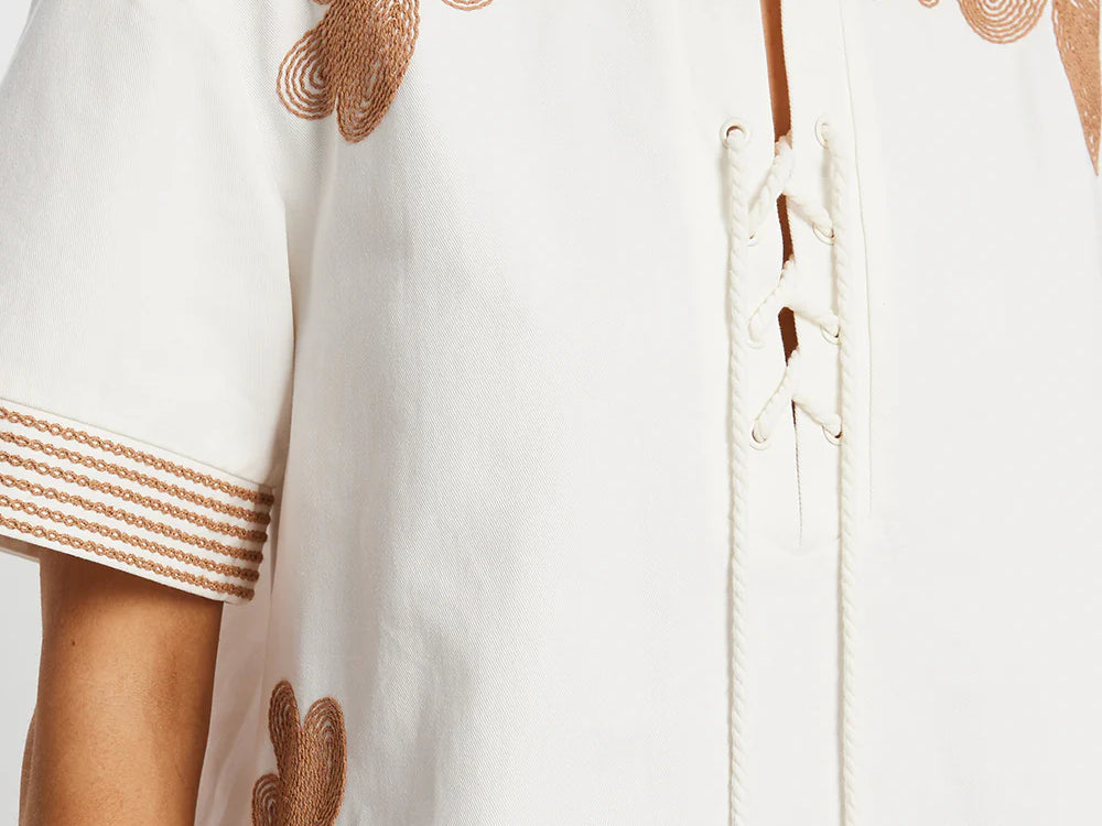 Introducing Kivari’s Moni Mini Dress in Ivory, a relaxed mini shirt dress silhouette with intricate brown floral embroidery on a white canvas. Designed with a lace-up front neckline, short sleeves, and a softly curved hem. The boxy, relaxed silhouette offers a laid-back fit that’s perfect for warm, sunlit days. Pair it with leather sandals for a casual daytime look.