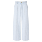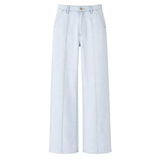 Introducing Kivari's Parker Wide Leg Denim Jean, a light blue wash wide-leg denim bottom. The Parker features front patch pockets, complete with signature gold hardware.