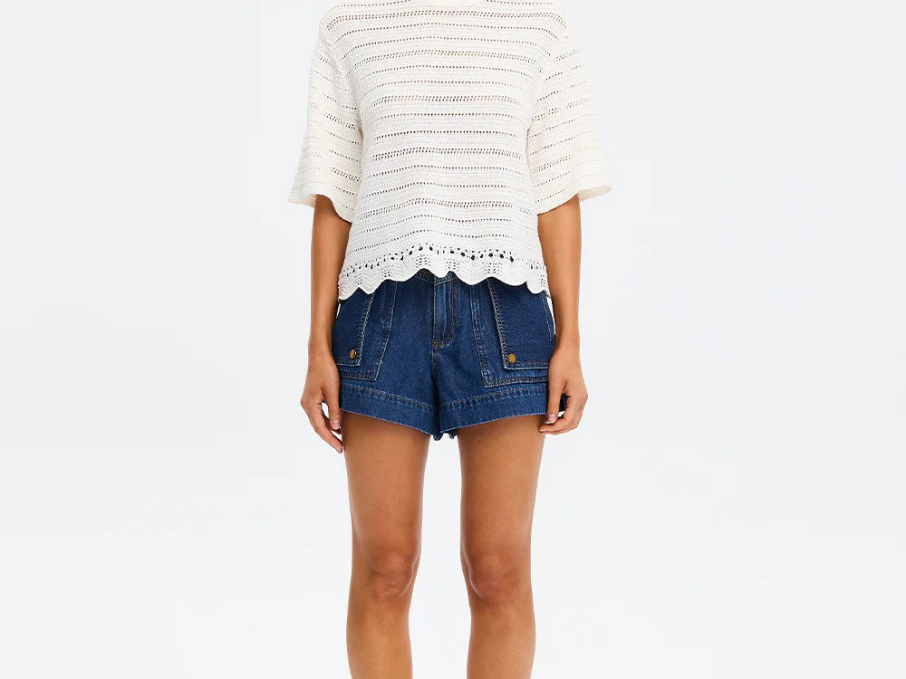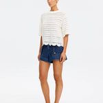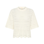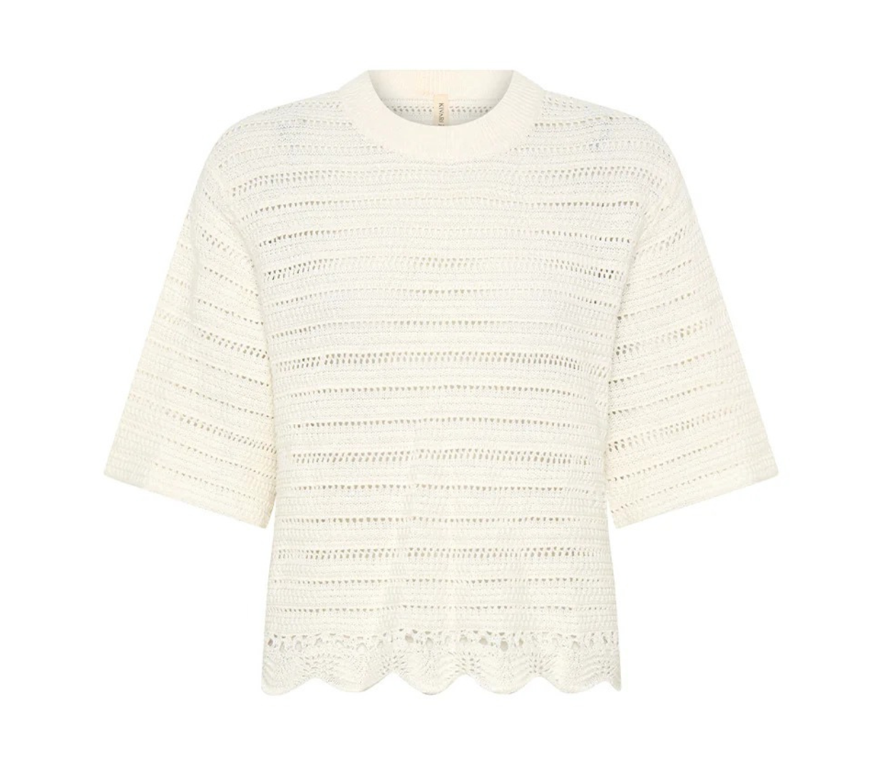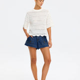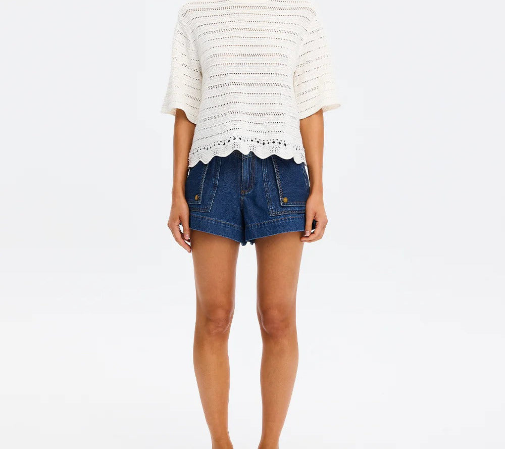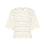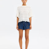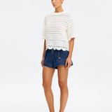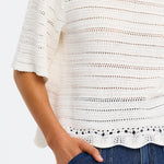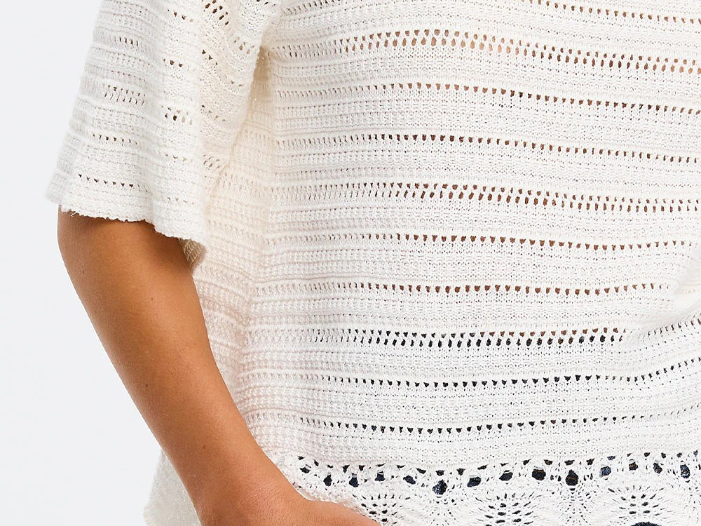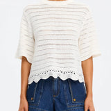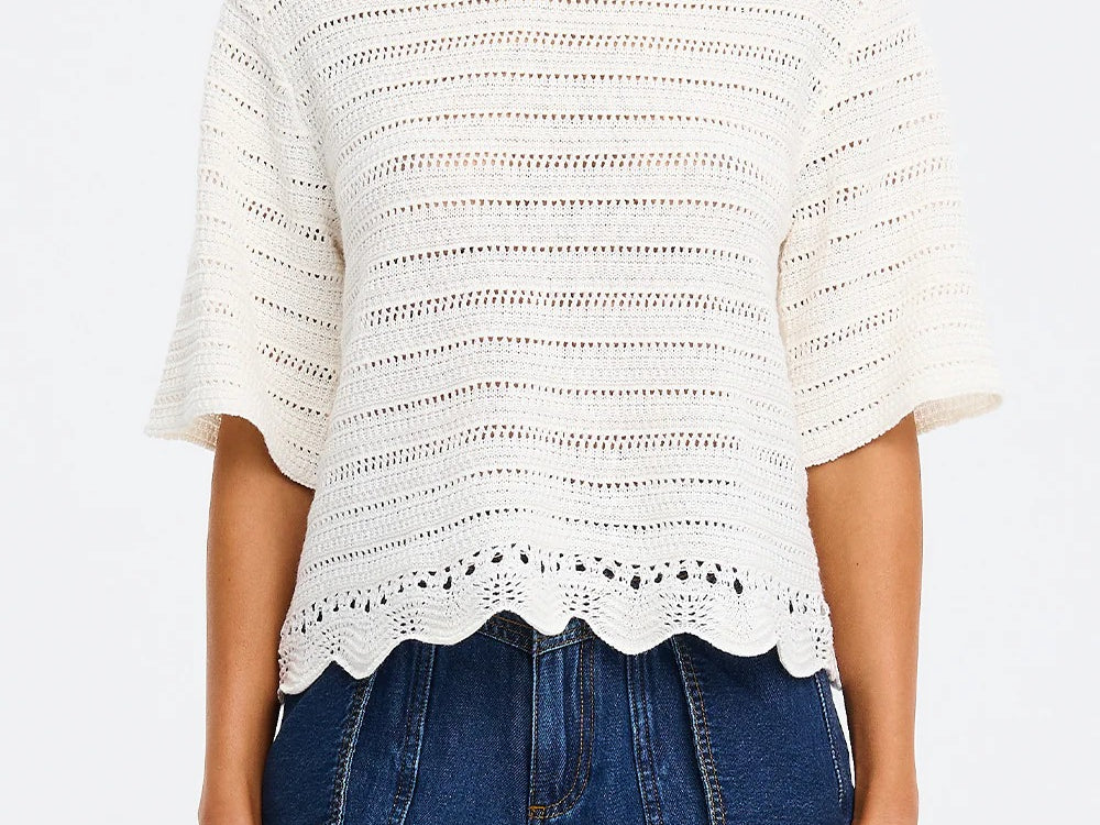 Introducing Kivari's Poppy Knit Tee in Natural, a relaxed knit tee in ivory white. The Poppy Knit Tee is crafted with crochet stitch fabrication and designed in a relaxed fit featuring a crew neckline with a rib finish, elbow-length sleeves, and delicate scalloped detailing along the hem. Soft, textural, and easy to wear, it brings a refined simplicity to everyday dressing.