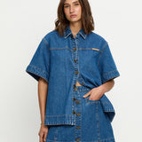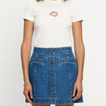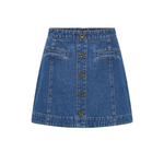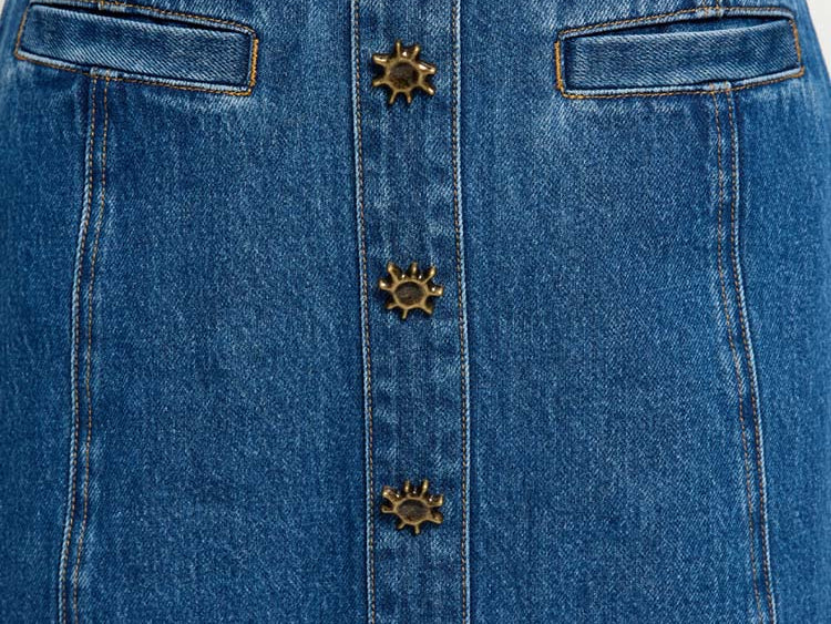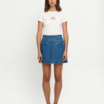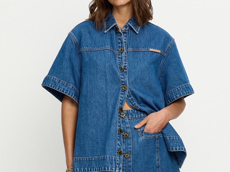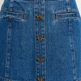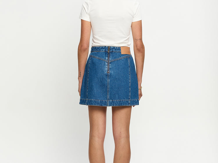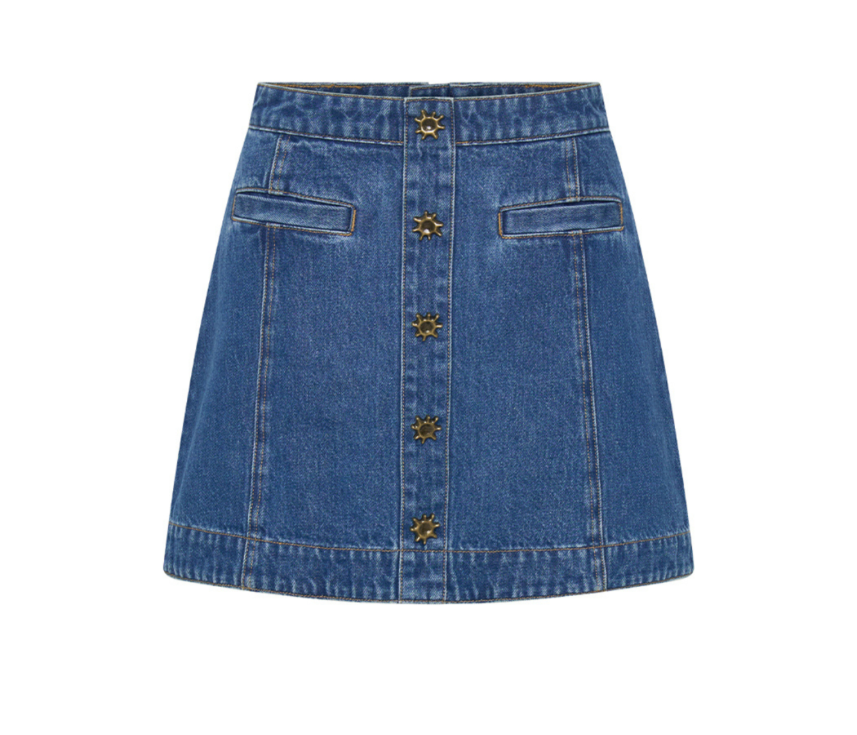 Introducing Kivari's Shea Denim Skirt in Indigo, a fitted A-line silhouette skirt. The Shea Denim Skirt features statement sun design buttons, front pockets, and a signature leather patch and is complete with an exposed zipper at the center back. Perfect for weekend outings, long lunches, or effortless city days.