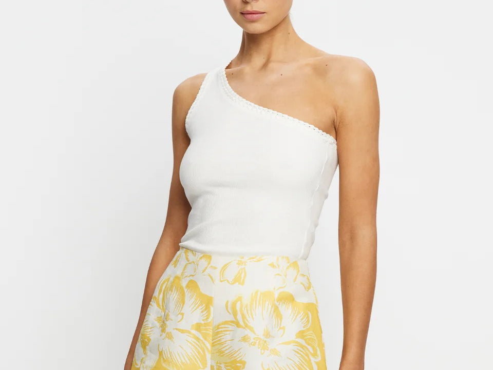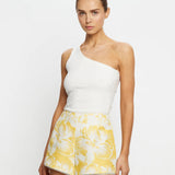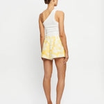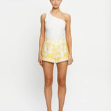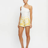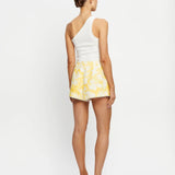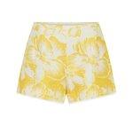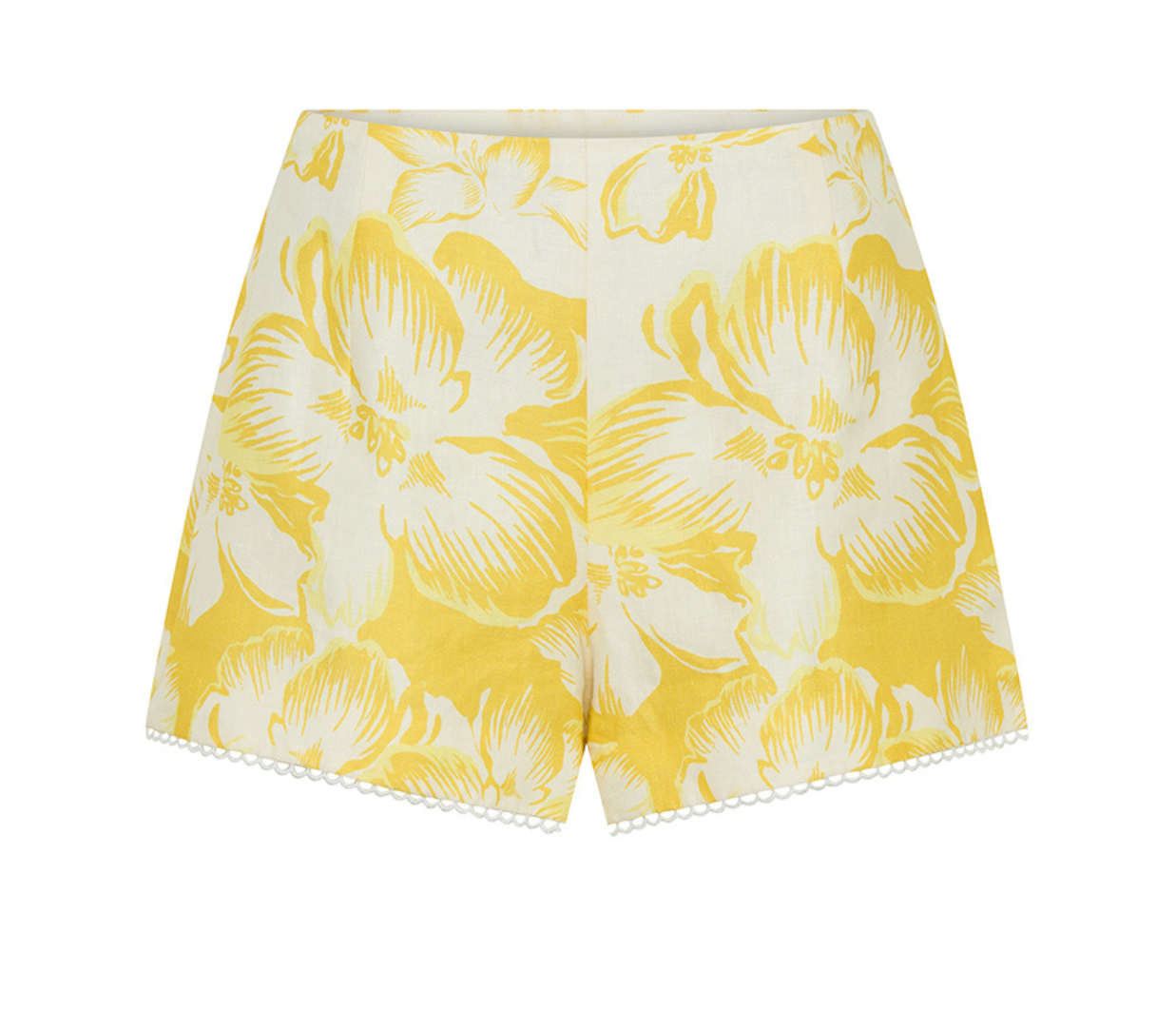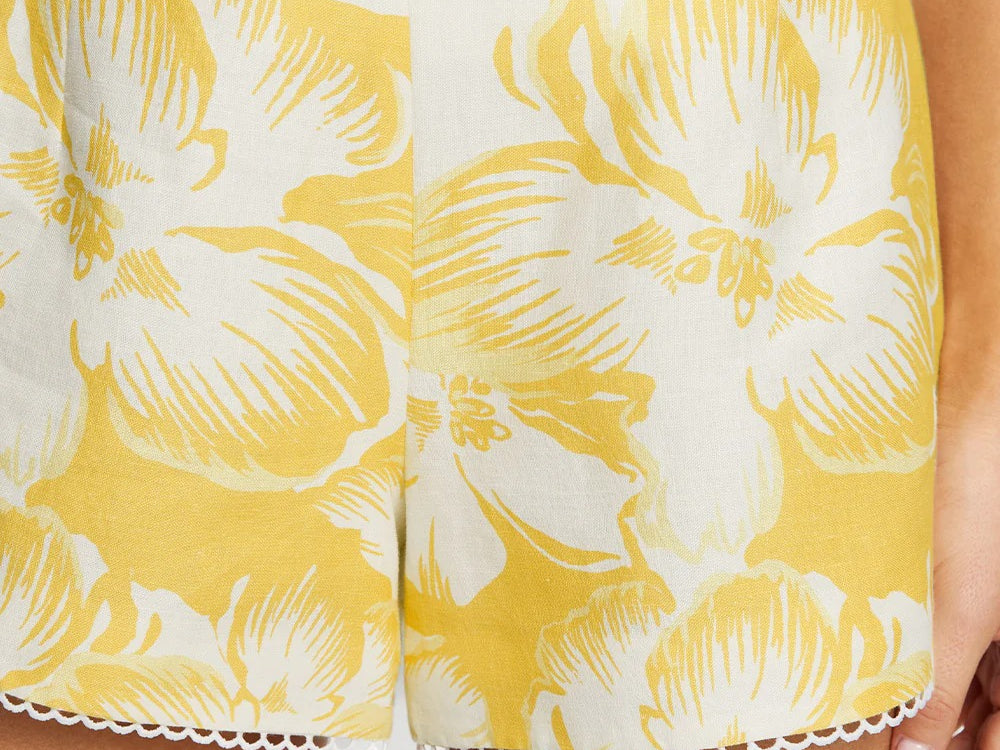 Introducing the Kivari's Soraya Shorts, a mid-rise linen short silhouette in yellow hue of floral motifs. Designed from premium European Flax linen, the Tara linen shorts feature a fitted waistband that flatters the silhouette and delicate scalloped hem detailing. Fully lined for comfort and finished with an invisible side zip, the Tara Short is a timeless summer essential.