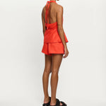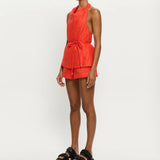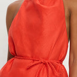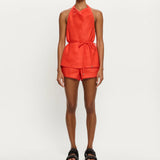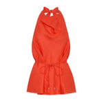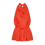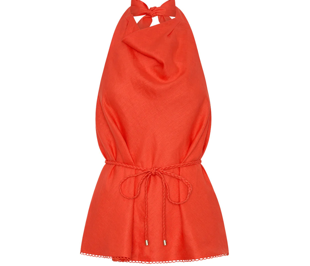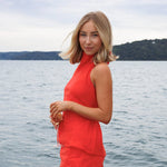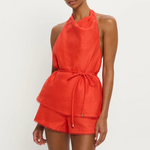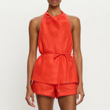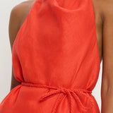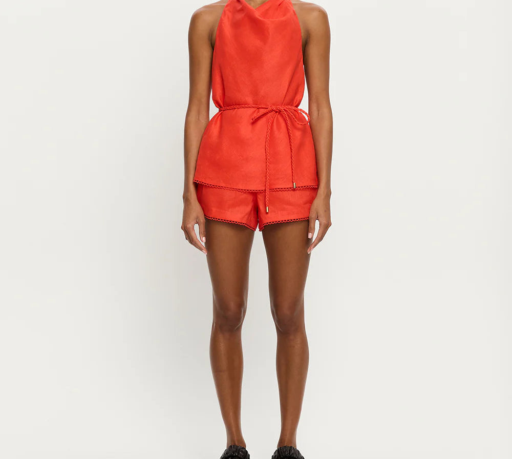 Introducing Kivari’s Tara Top in Red, a halterneck linen top in bold red hue. Designed with a high neckline and soft cowl drape, this red halterneck top features a low open back and a scalloped hem. The removable braided waist tie allows for versatile styling, offering a relaxed or cinched silhouette depending on the occasion. Pair it with the matching Tara Short for an effortlessly coordinated summer look.