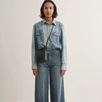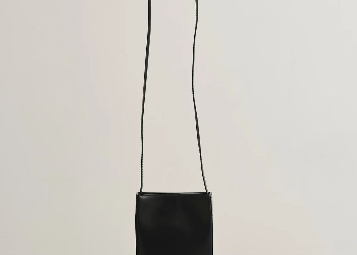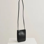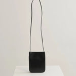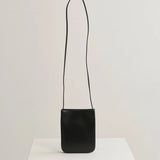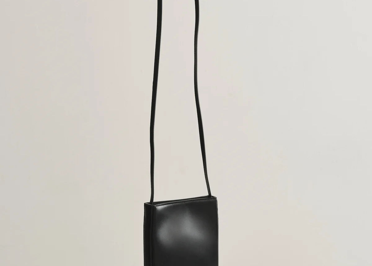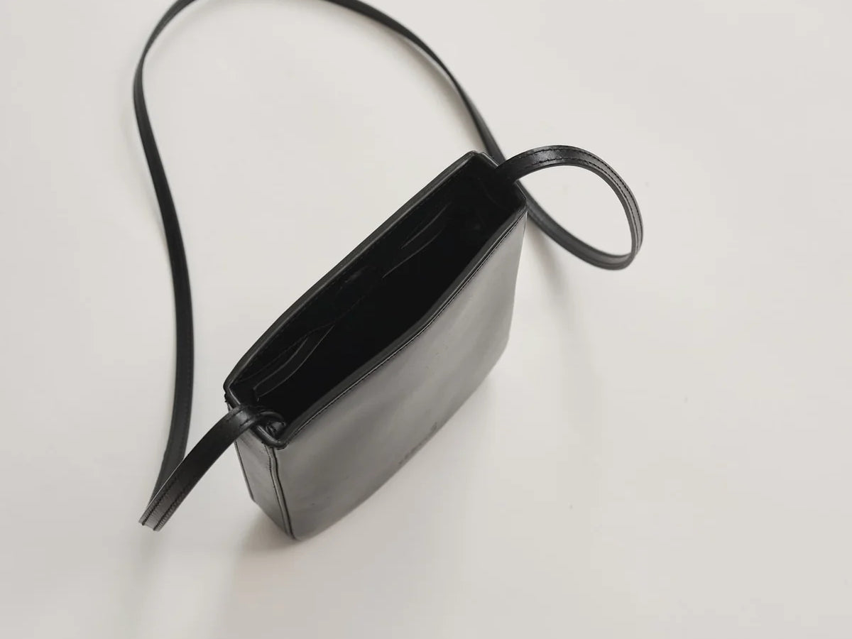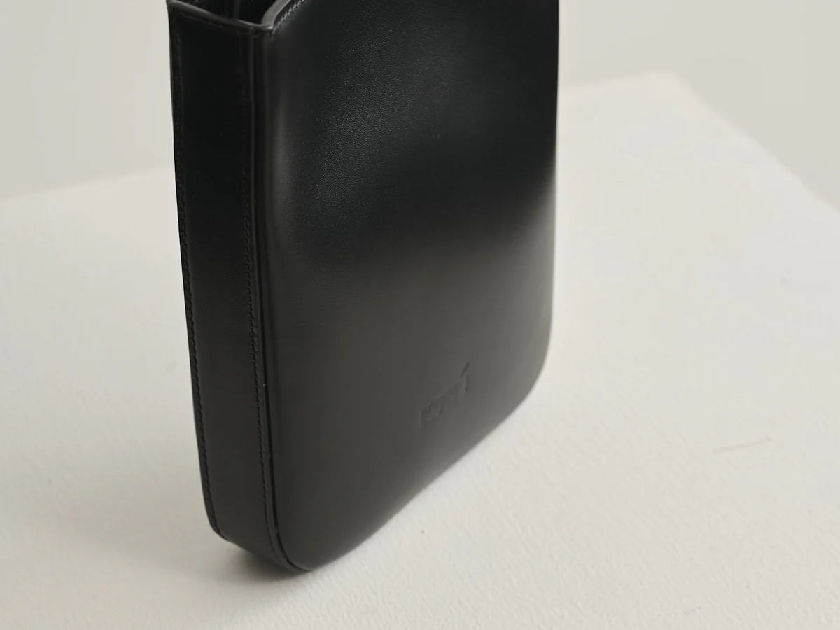 Introducing Kone's Babbo Bag in Vitello Black, a compact crossbody bag in black. A purposeful companion for carrying only the essentials, whether worn on its own or paired with a larger tote. Its silhouette stays true to KONÉ’s minimal design language, with no visible hardware: the strap length adjusts with a discreet knot hidden inside the bag.