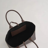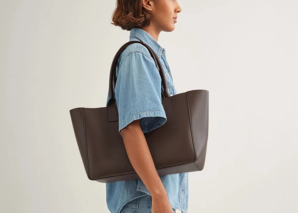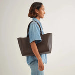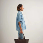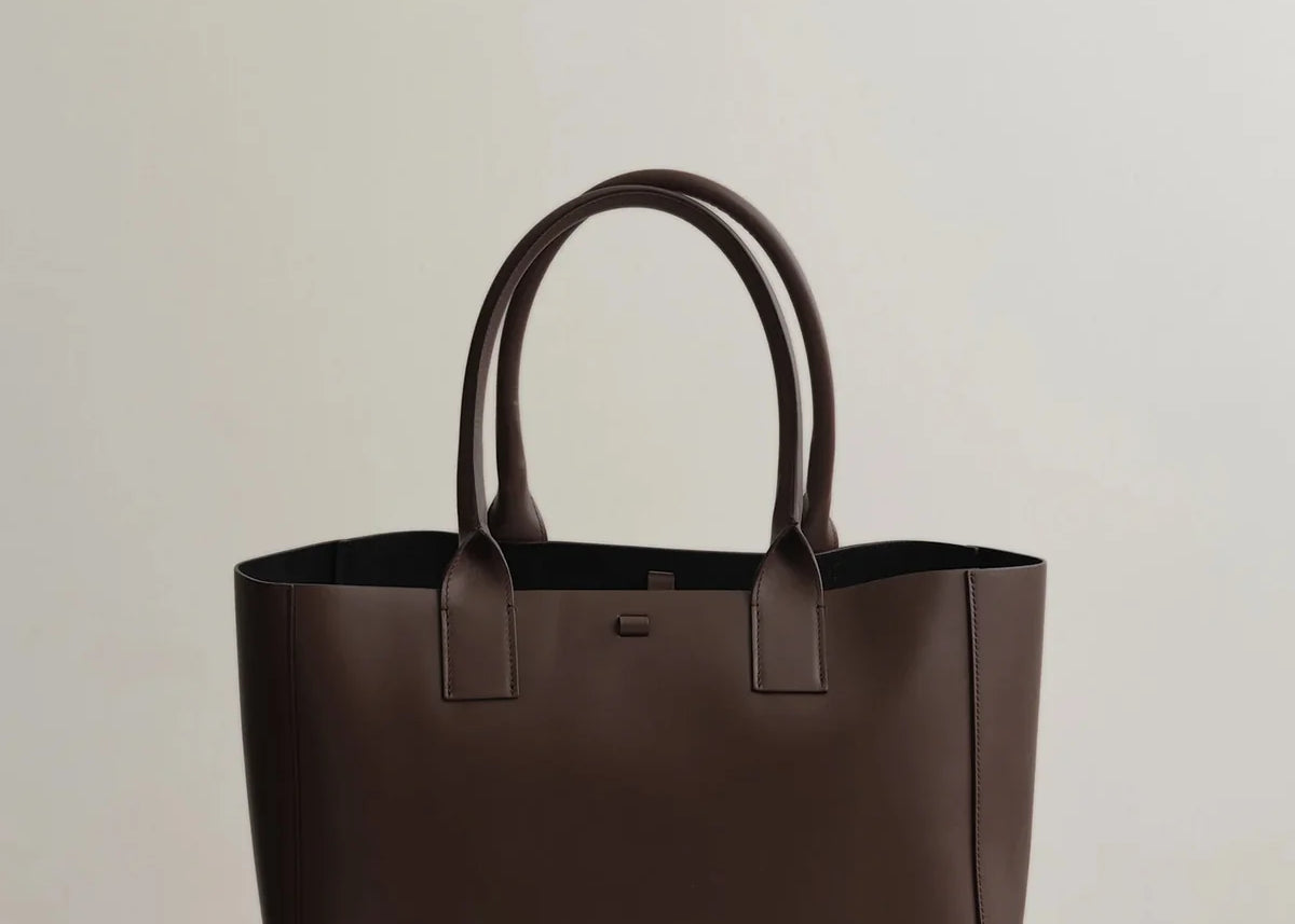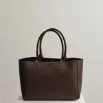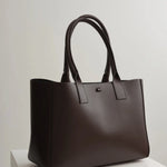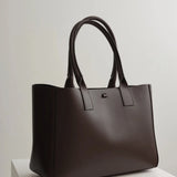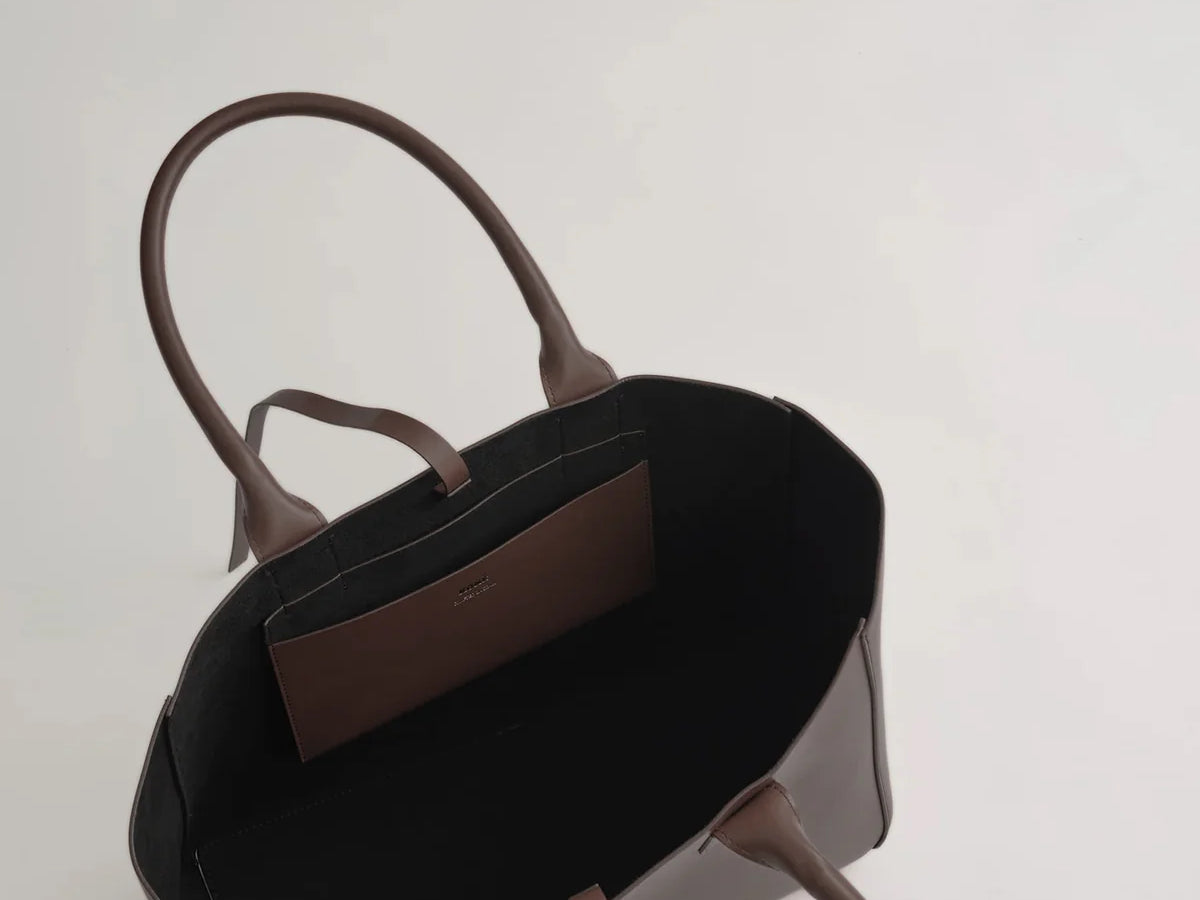 Introducing Kone's Filippo Work Bag in Vitello Dark Brown, a classic tote bag in a smooth vitello leather in dark brown. Designed with a spacious main compartment and discreet inner pocket, it offers effortless organisation for workday essentials. Finished with sturdy handles and a slender tie strap for subtle closure.