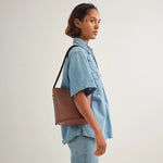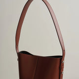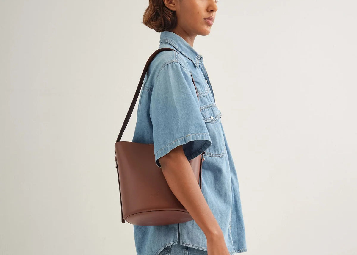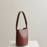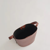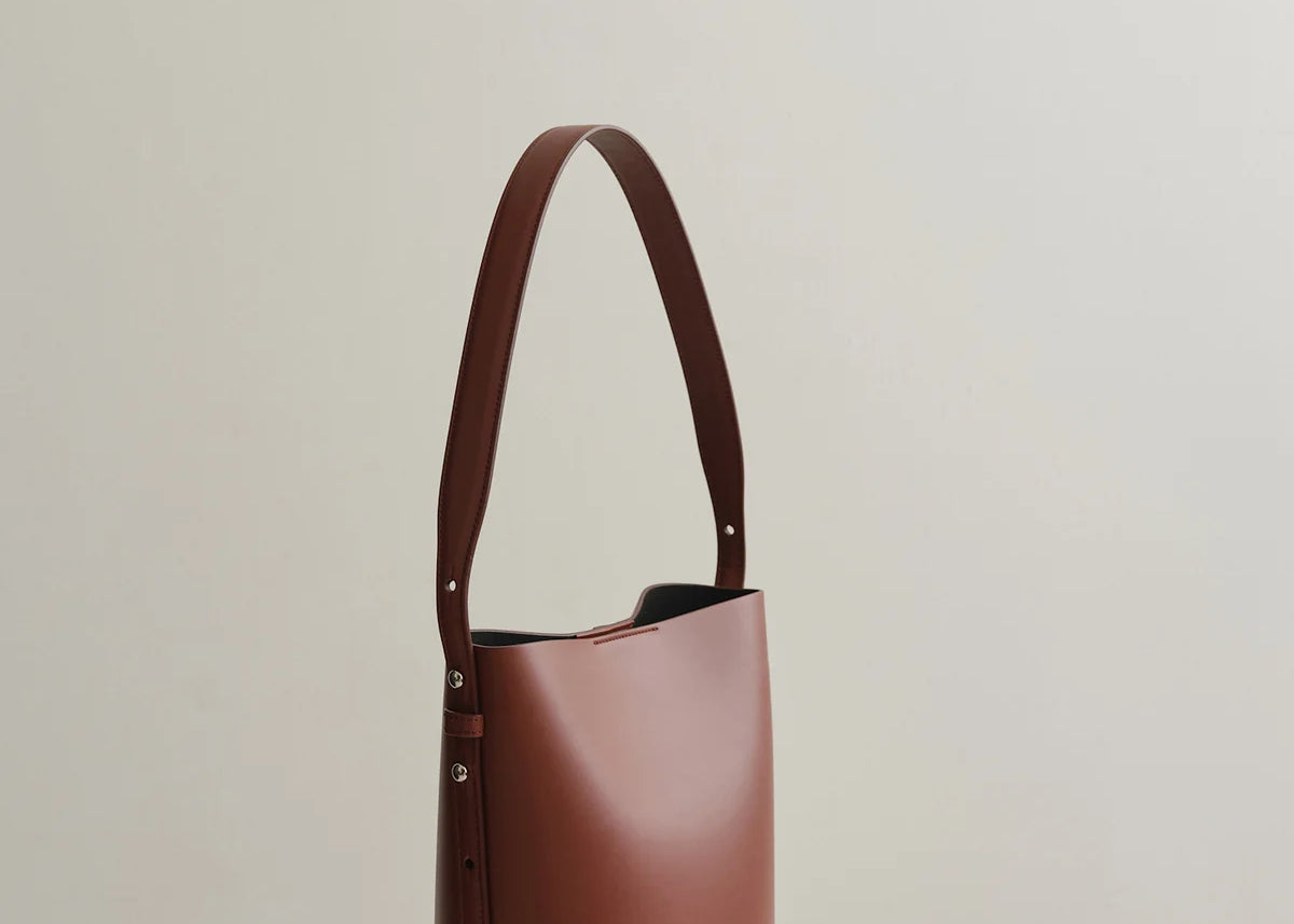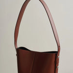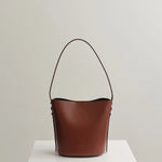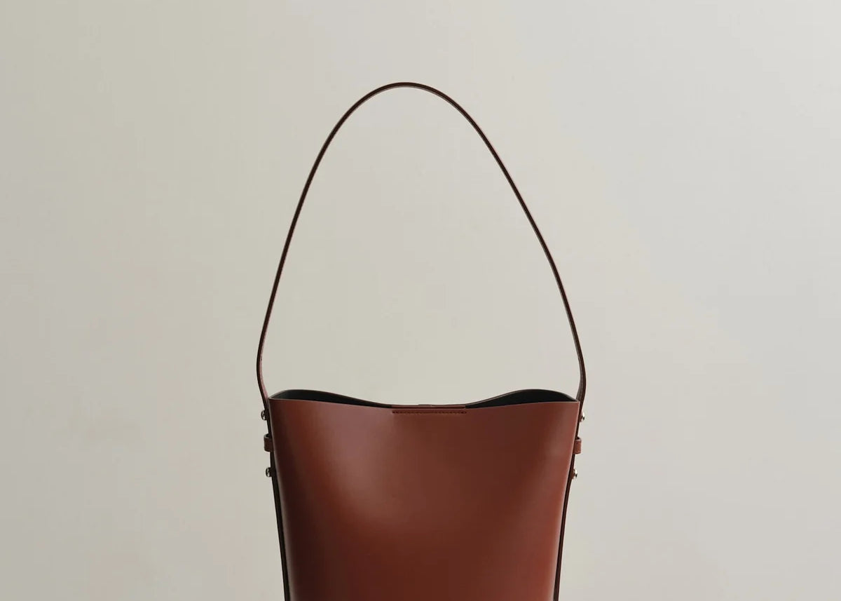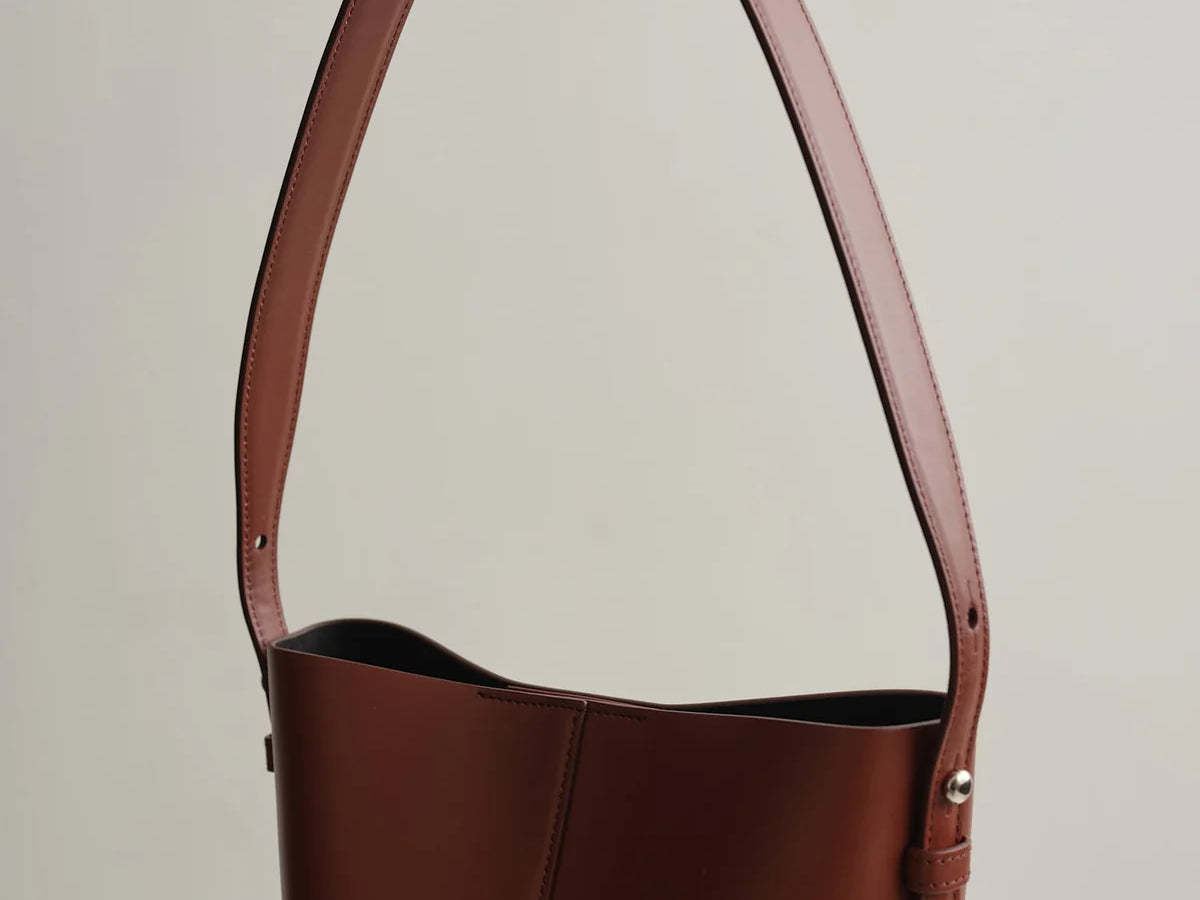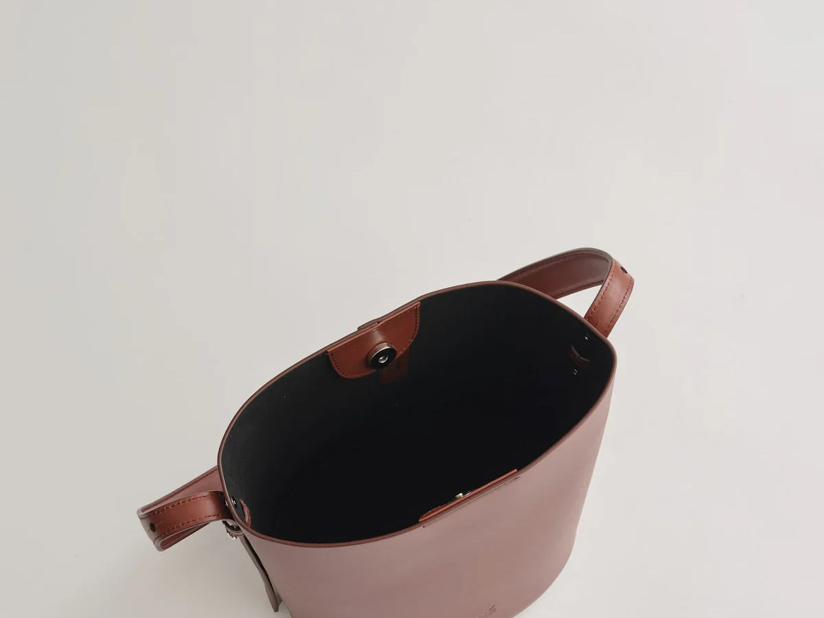 Introducing Kone's Little Leo Bucket Bag in Vitello Rusty, a bucket bag in earthy brown rusty-colored Vitello leather. Designed with a leather strap with a discreet magnetic closure to keep belongings secure, while the adjustable shoulder strap is slightly wider at the top to ensure comfort whether carried by hand or worn on the shoulder. A perfect bag for everyday wear.