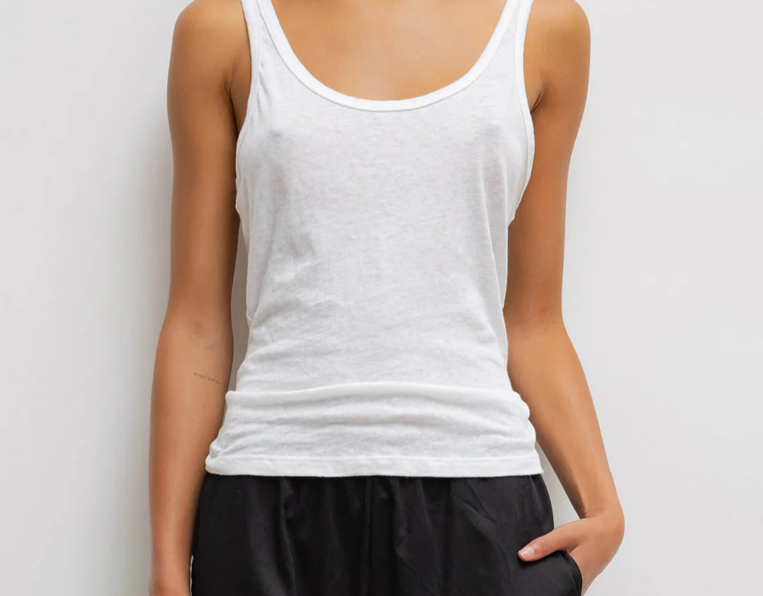 Introducing the Laura Scoop Neck Tank in White, crafted from our feather-light, vintage-inspired Laura Lightweight Cotton, this everyday essential is designed for effortless comfort. Featuring a slim-cut silhouette and a flattering wide scoop neckline.
